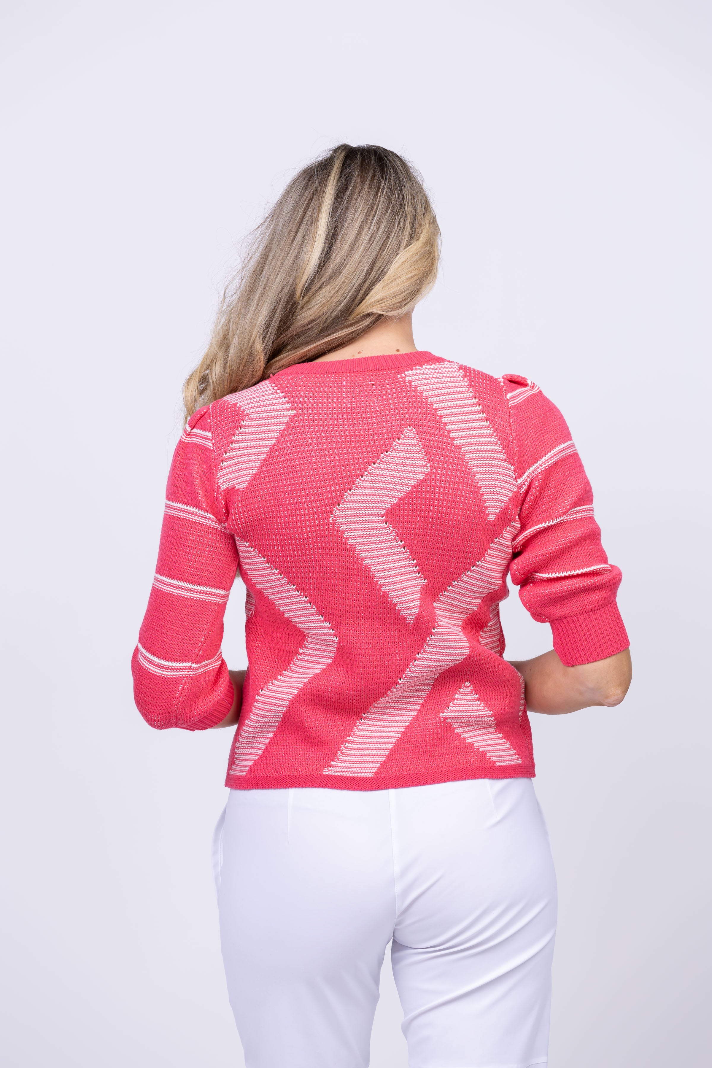 Stay cozy and stylish with Nic + Zoe's This And That Sweater. Made from a plied up cotton blend, this crewneck pull-on boasts a fun jacquard geo design on the front and complementary striped sleeves. The cute pleat at the shoulder adds a feminine touch and the 3/4 length sleeves create a trendy look. Perfect for pairing with denim!