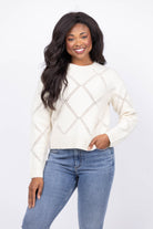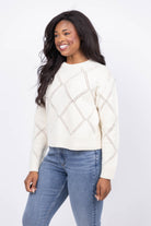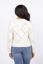 Elevate your wardrobe with the Vince Textured Argyle Sweater in Cream. Its classic argyle pattern adds timeless sophistication, while the textured knit offers cozy comfort. Perfect for dressing up with tailored pants or dressing down with your favorite jeans, this versatile sweater effortlessly enhances any outfit, making it a must-have for stylish layering.