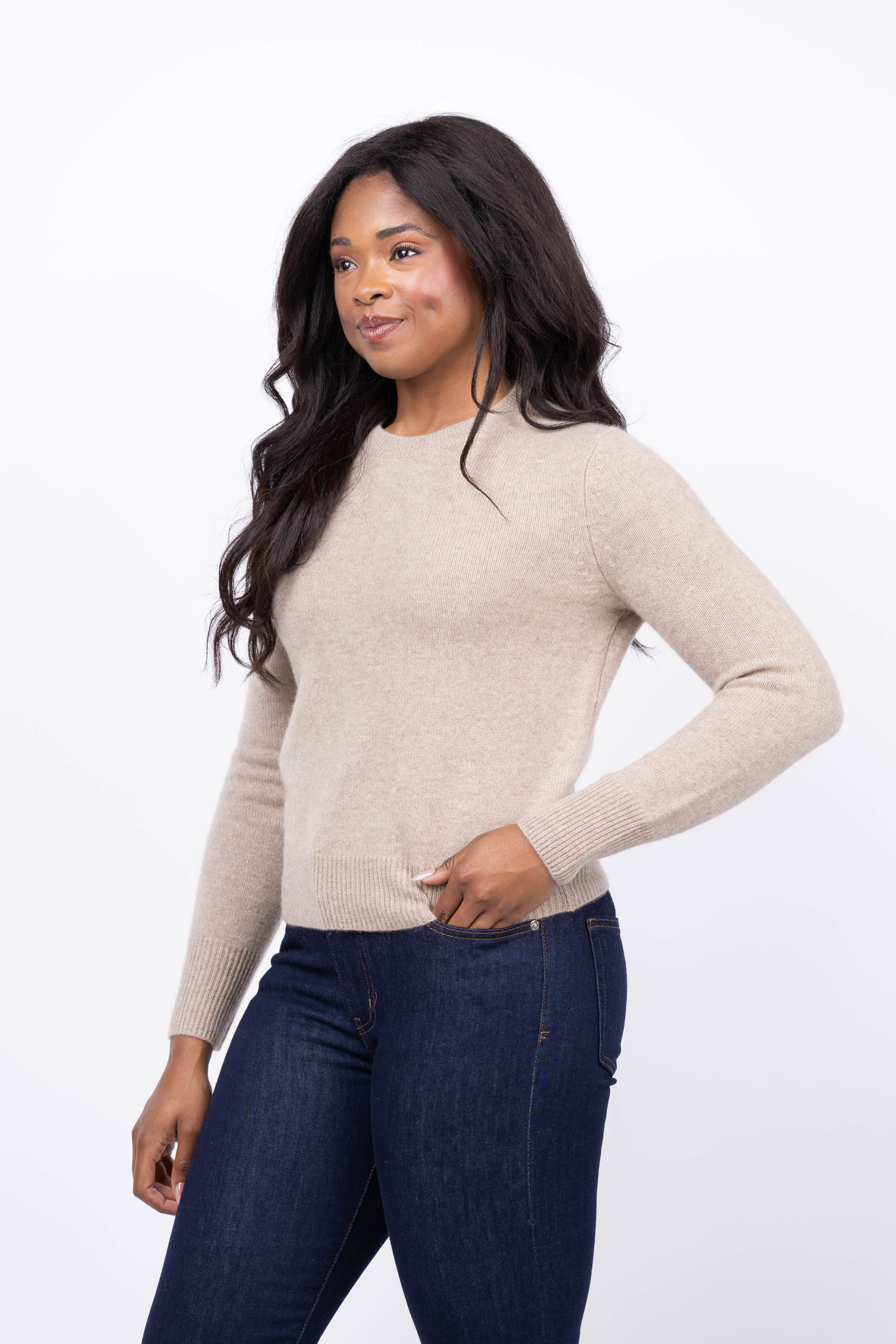 White + Warren Cashmere Rib Trim Crewneck in Taupe Heather