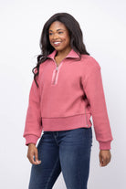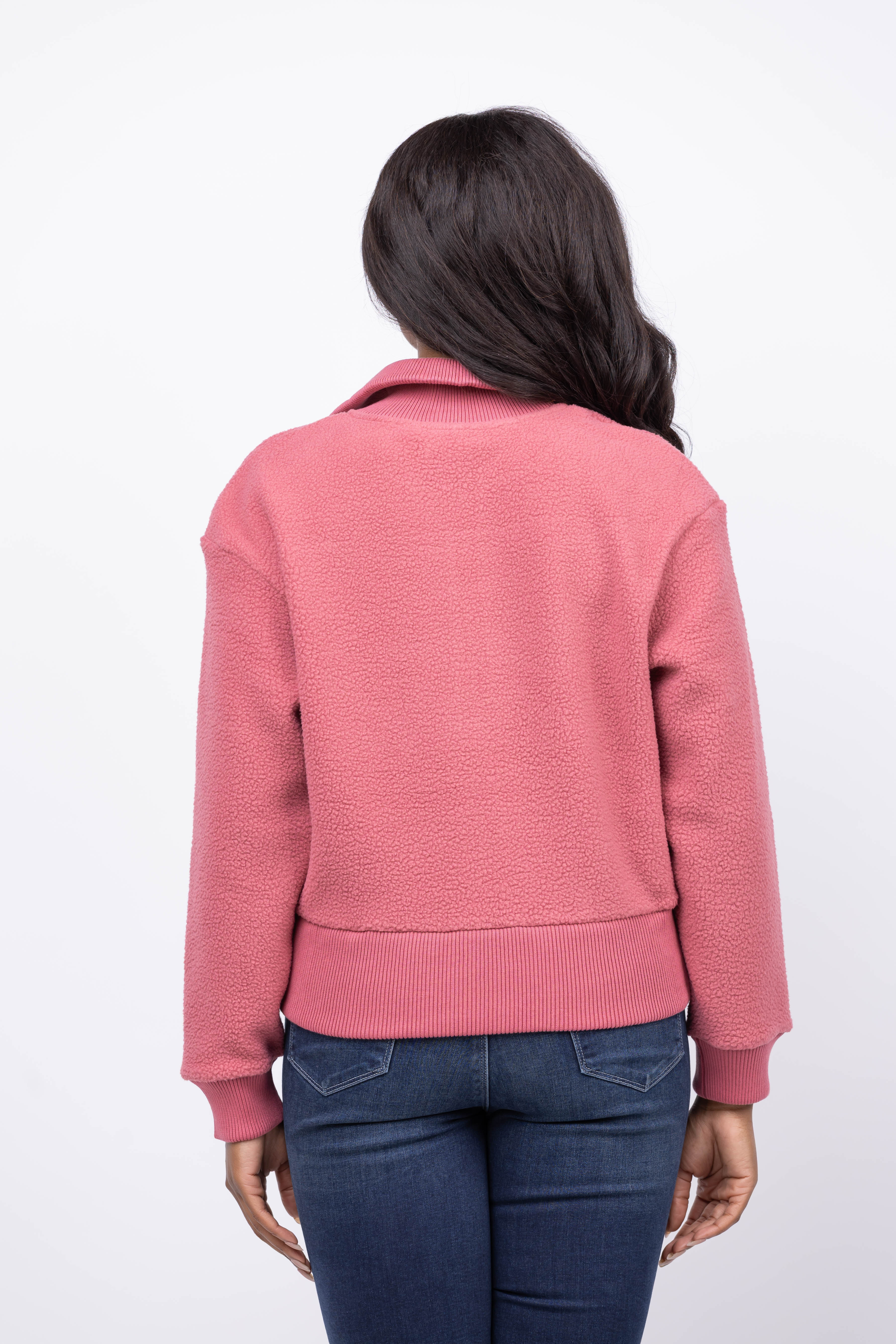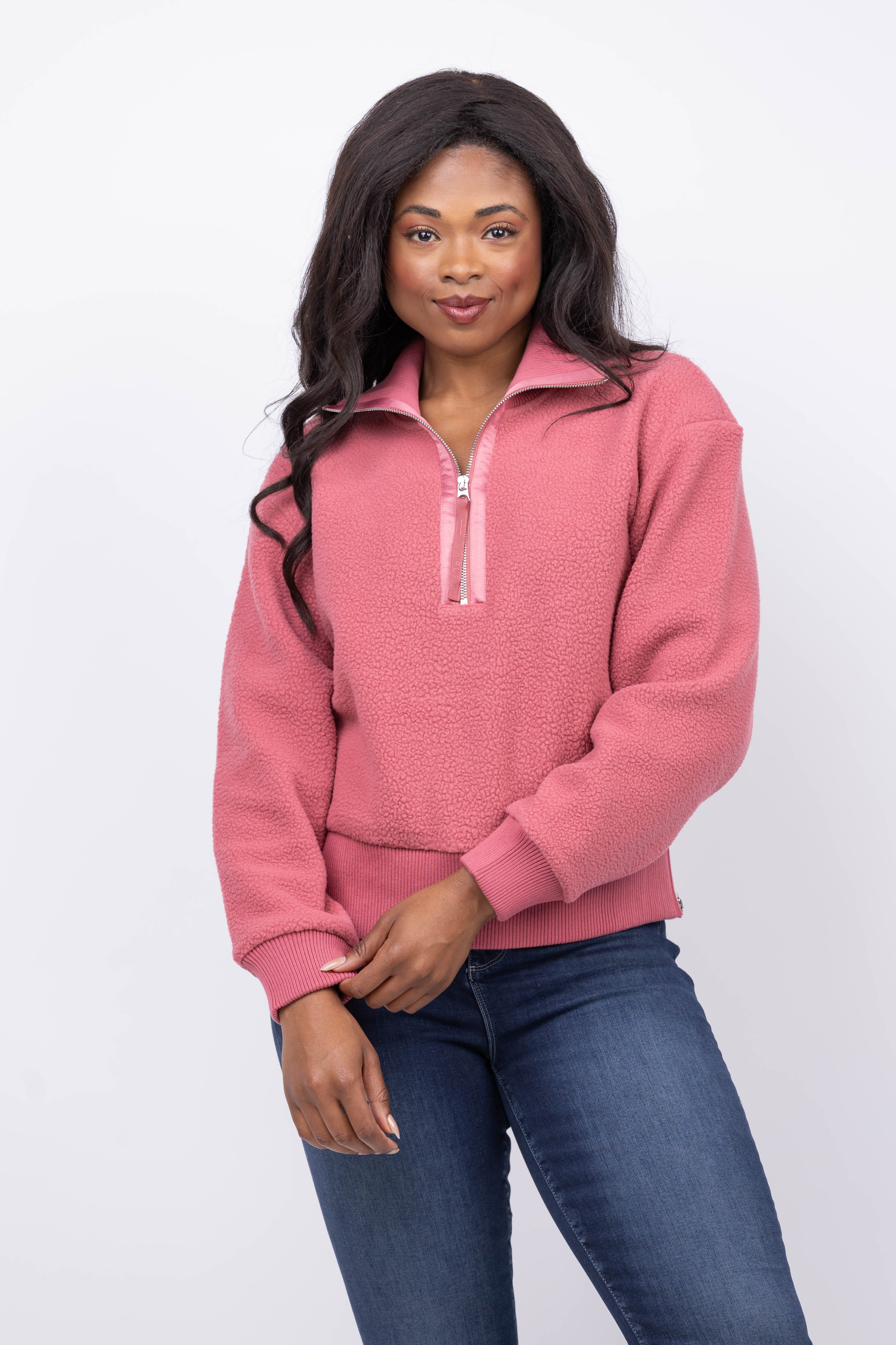 Experience comfort and style with the Varley Roselle Half Zip Fleece in Mauvewood. Crafted from 100% recycled plush borg fleece, it features a half-zip collar and ribbed cuffs for a cozy fit. Loose sleeves offer relaxed movement, while signature side zip accents and a luxe sateen trim add a refined touch. Perfect for elevating your casual wardrobe sustainably.