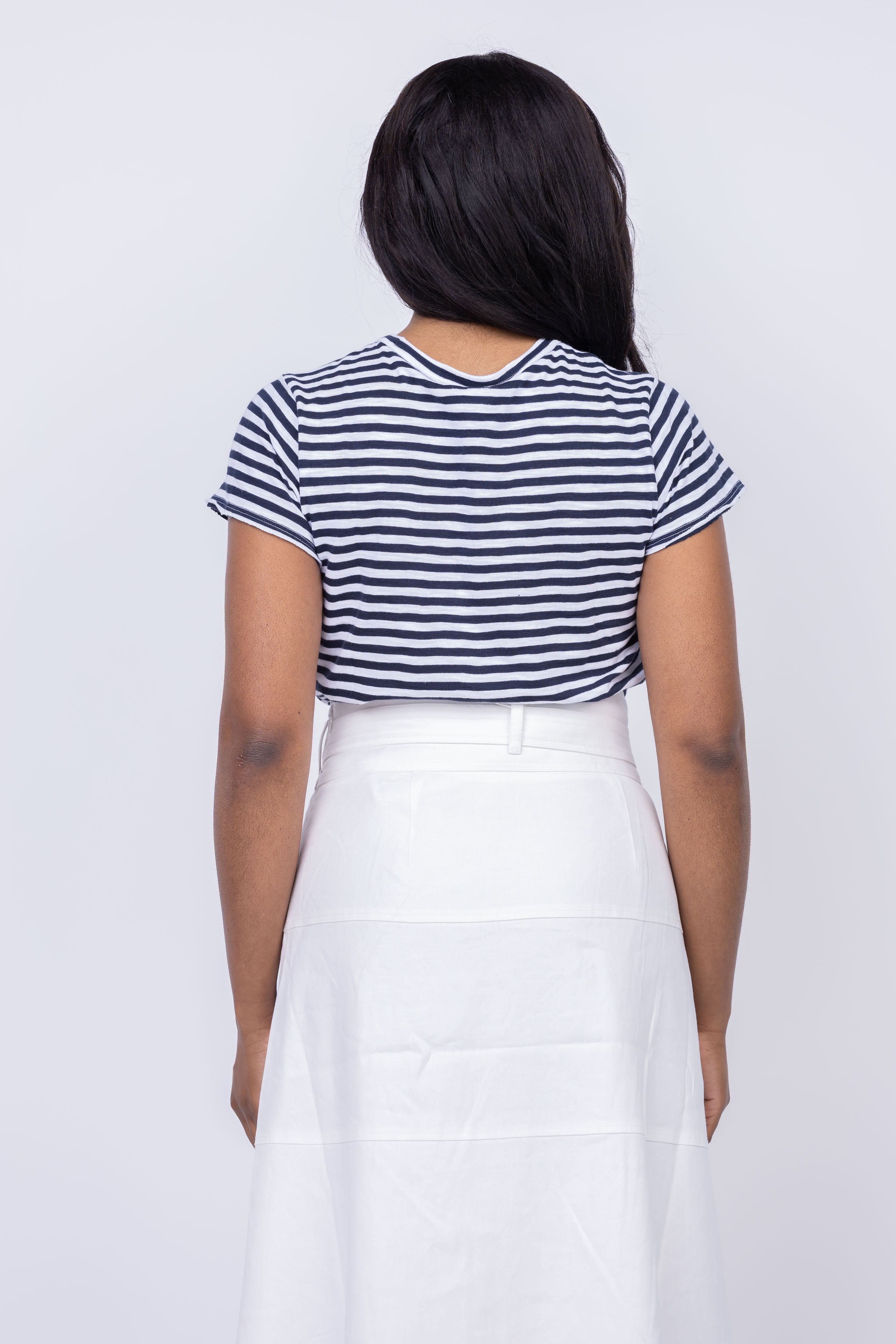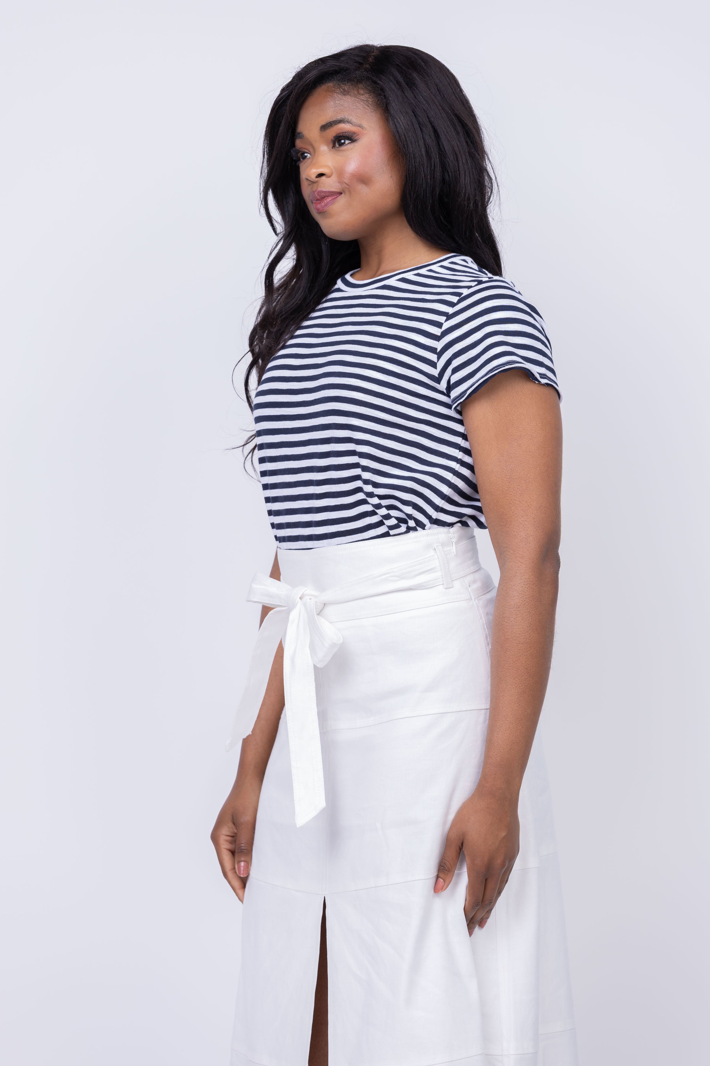 Introducing the Lilla P Striped Cap Sleeve Crewneck - the must-have spring essential! This tee is designed to fit beautifully, with cap sleeves for a flattering and timeless look. With classic navy stripes, embrace the fresh and vibrant feeling of spring!