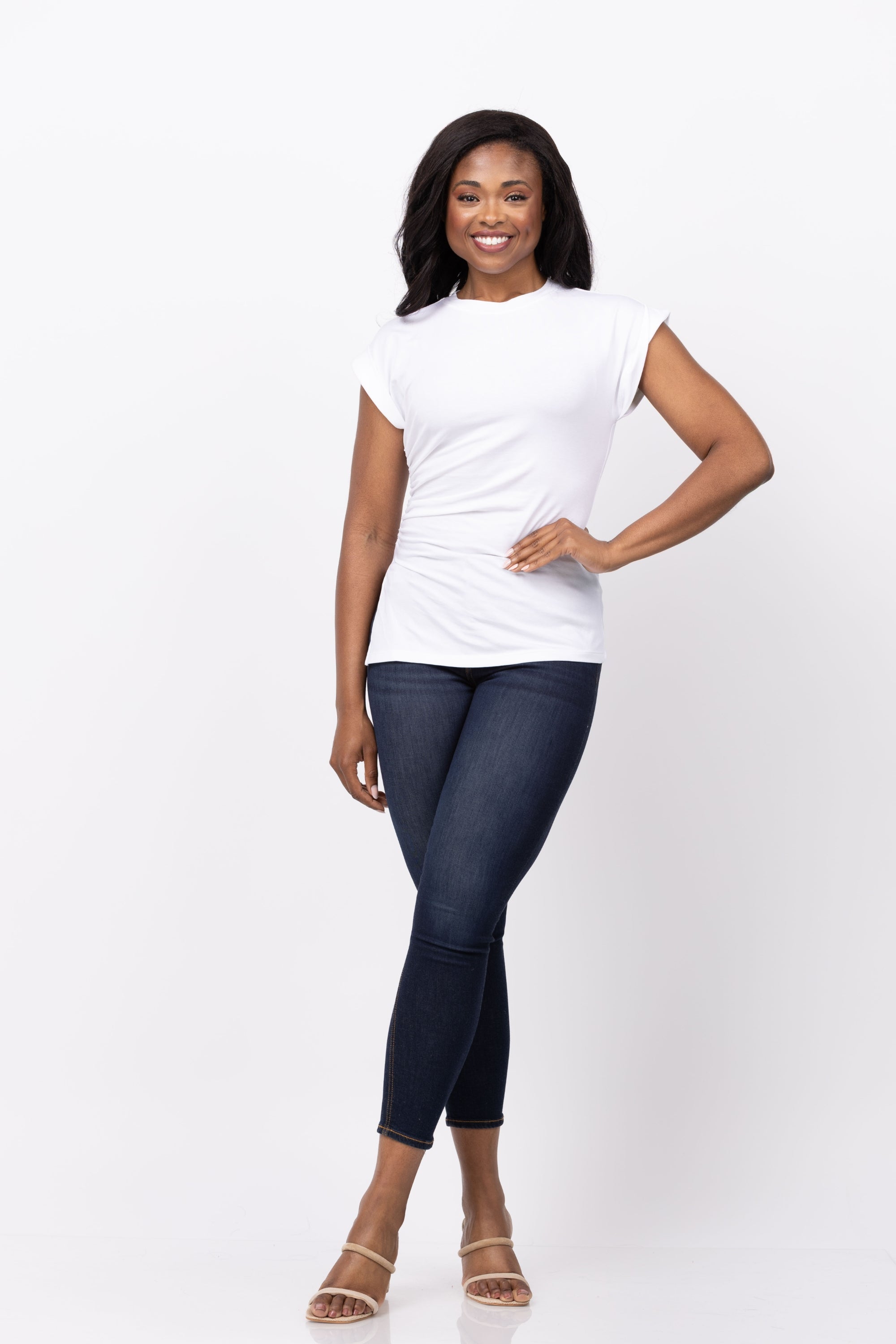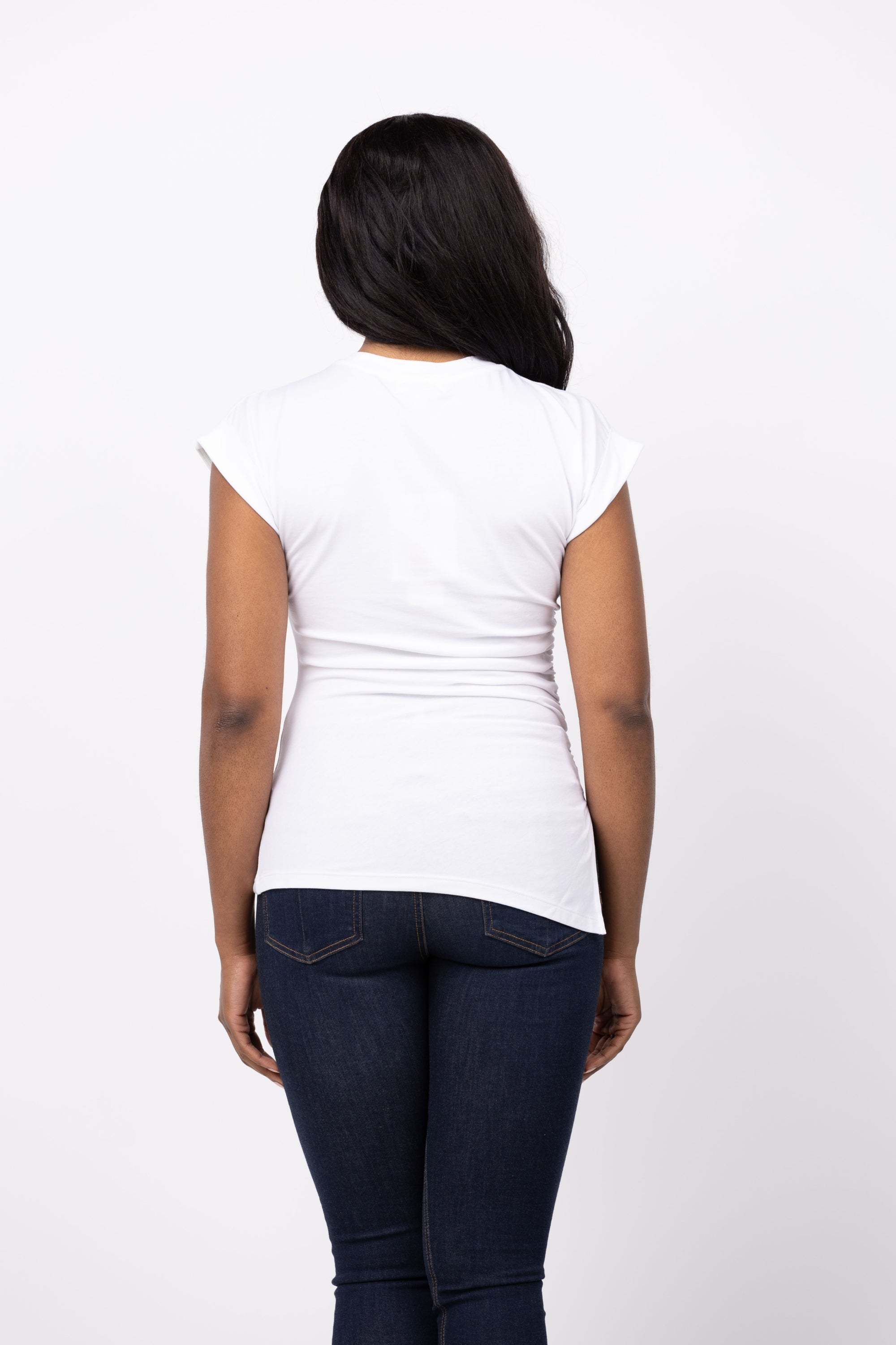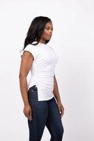 Elevate your wardrobe with the Nation Ltd Sadee Crewneck Tee in White. Made from luxurious stretch jersey fabric, this tee embraces elegance and simplicity with its structured asymmetrical hem and ruched detailing. The cuffed shoulders and side slit add a touch of sophistication.