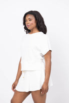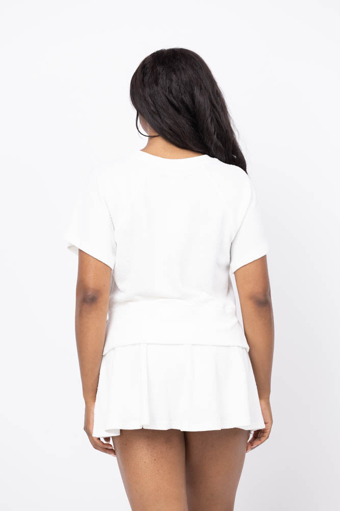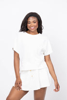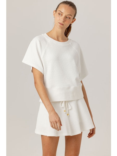 The We Are Sundays Zelie Pullover in Coconut Milk offers effortless style with its relaxed, boxy fit and classic crew neckline. Its raglan short sleeves and ribbed waistband provide comfortable movement and a flattering silhouette that hits at the true waist. Perfect for pairing with the Cherie Skirt, this pullover combines casual ease with a polished finish for all-day wear.