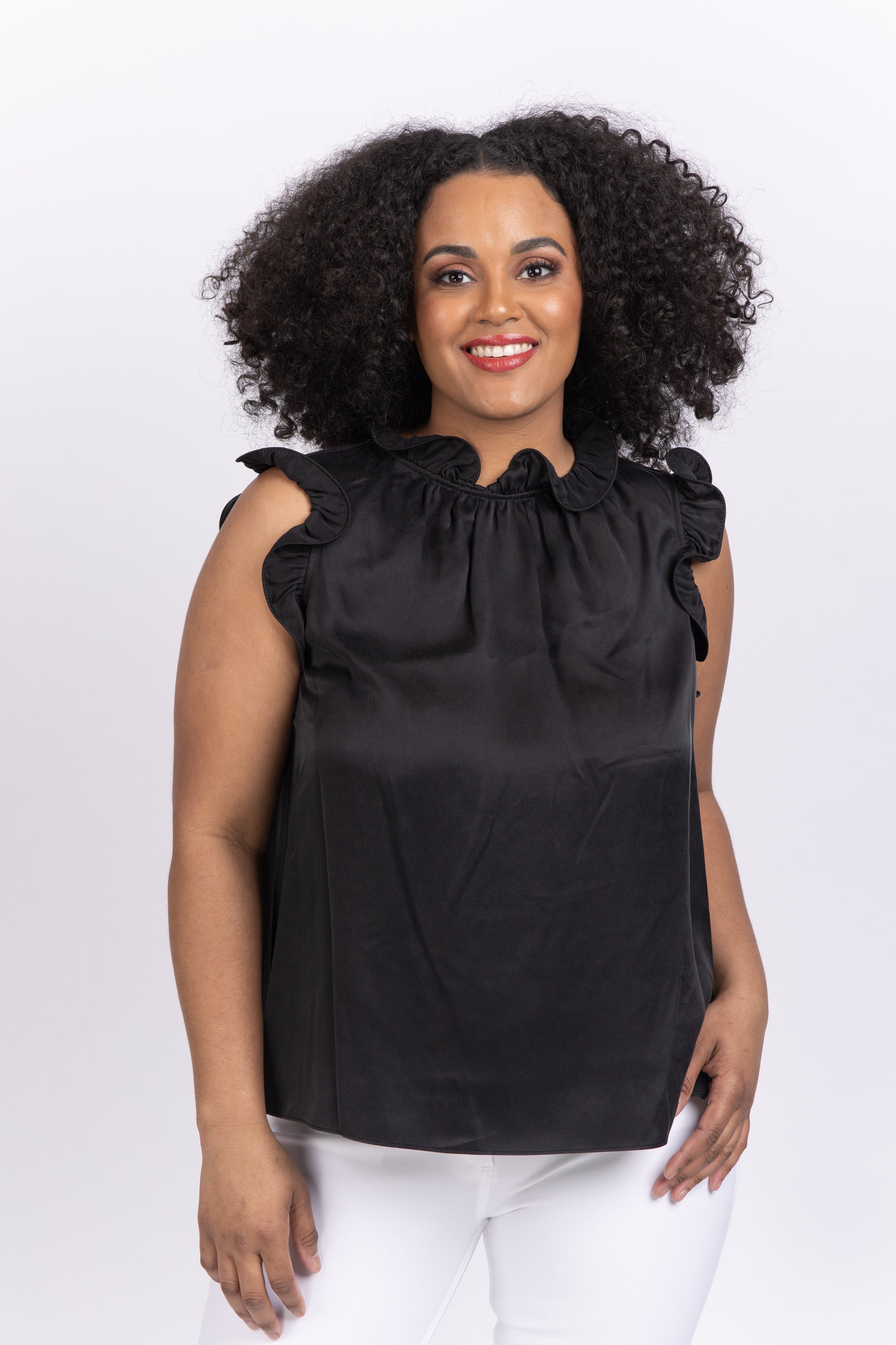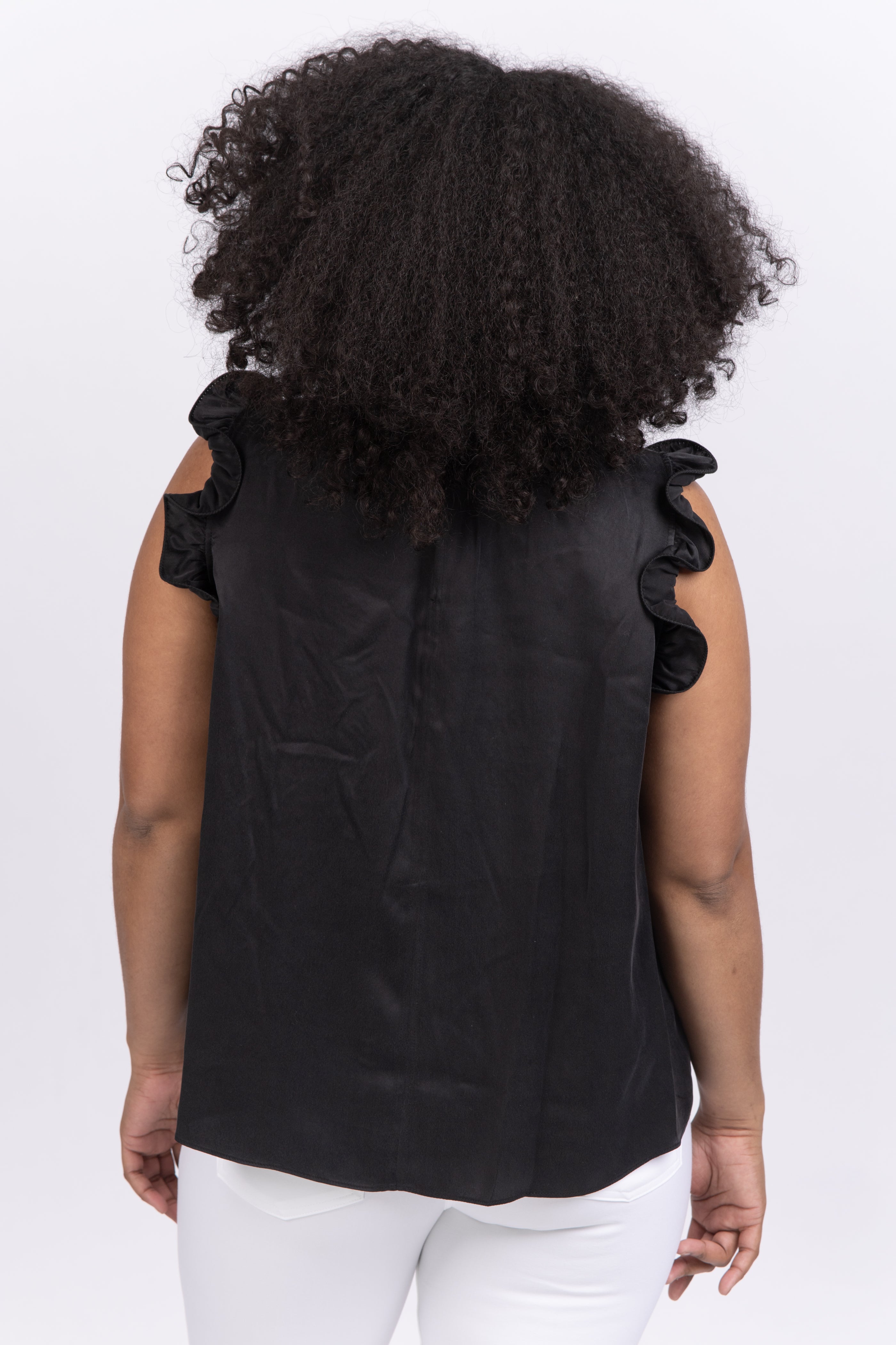 This feminine ruffles along the neckline and armholes create a perfect piece for both layering and by itself wear.