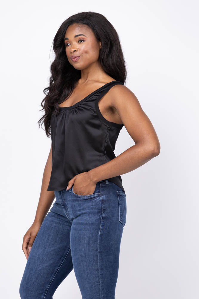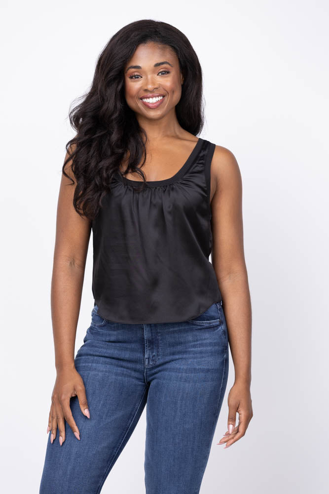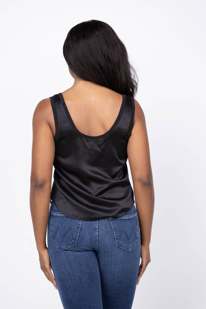 The Cinq à Sept Lenore Tank in Black blends elegant design with ultimate comfort. Its graceful scoop neck and flowing silk fabric create a timeless silhouette that moves effortlessly with you. Featuring built-in bra strap holders and a sleeveless cut, this pullover style is as practical as it is chic. Elevate any look with this versatile piece that complements both casual and refined ensembles flawlessly.