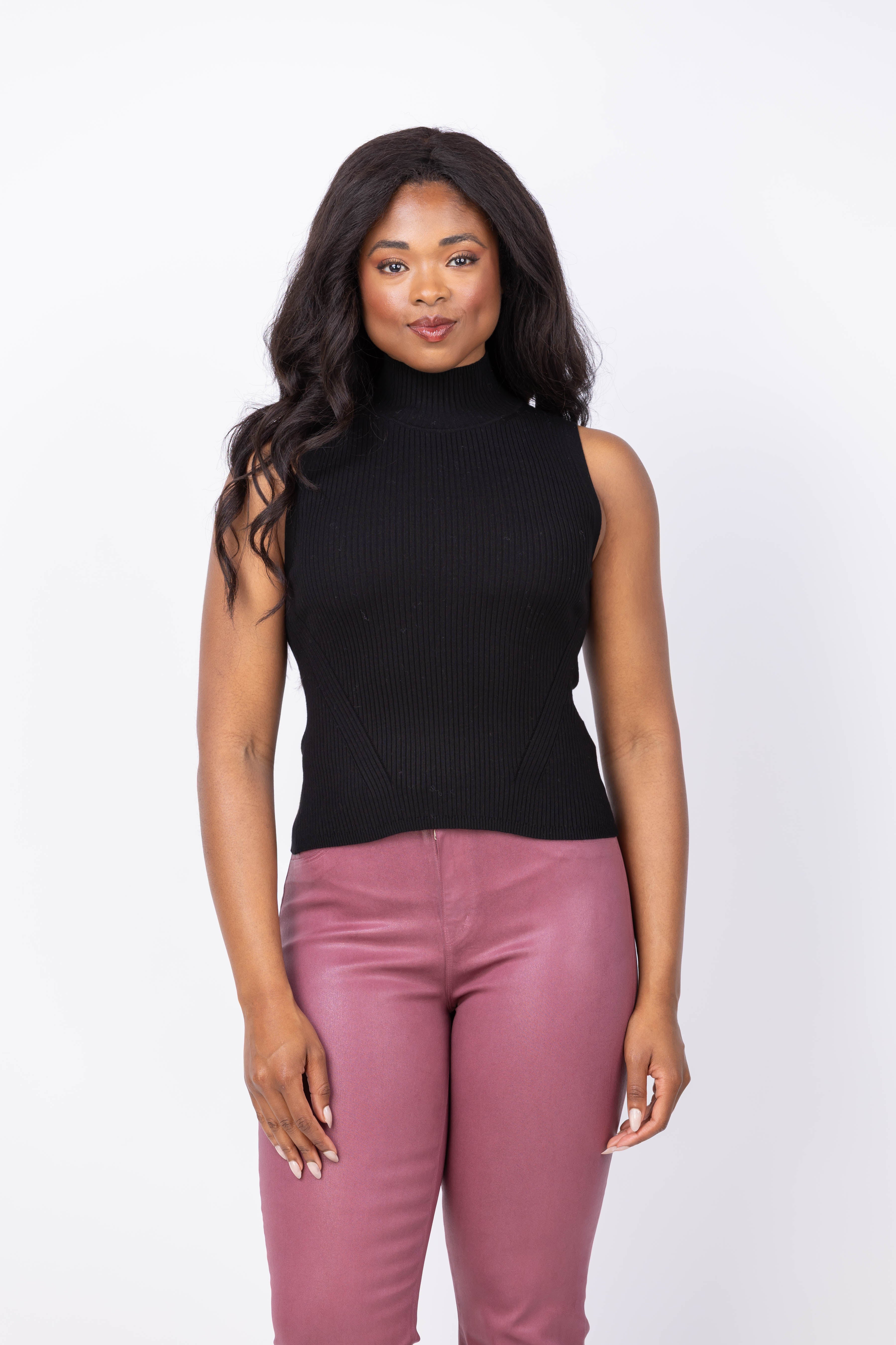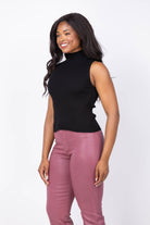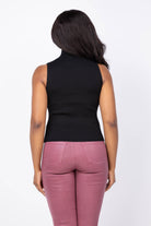 The Lilla P Rib Turtleneck Shell Sweater in Black offers a sleek, close-fitting silhouette crafted from fine gauge stretch knit. Its sleeveless design makes it a versatile layering piece that elevates any outfit, providing a polished alternative to a basic tee. Perfect for adding refinement and warmth without bulk, this timeless sweater enhances your wardrobe with effortless style and comfort.