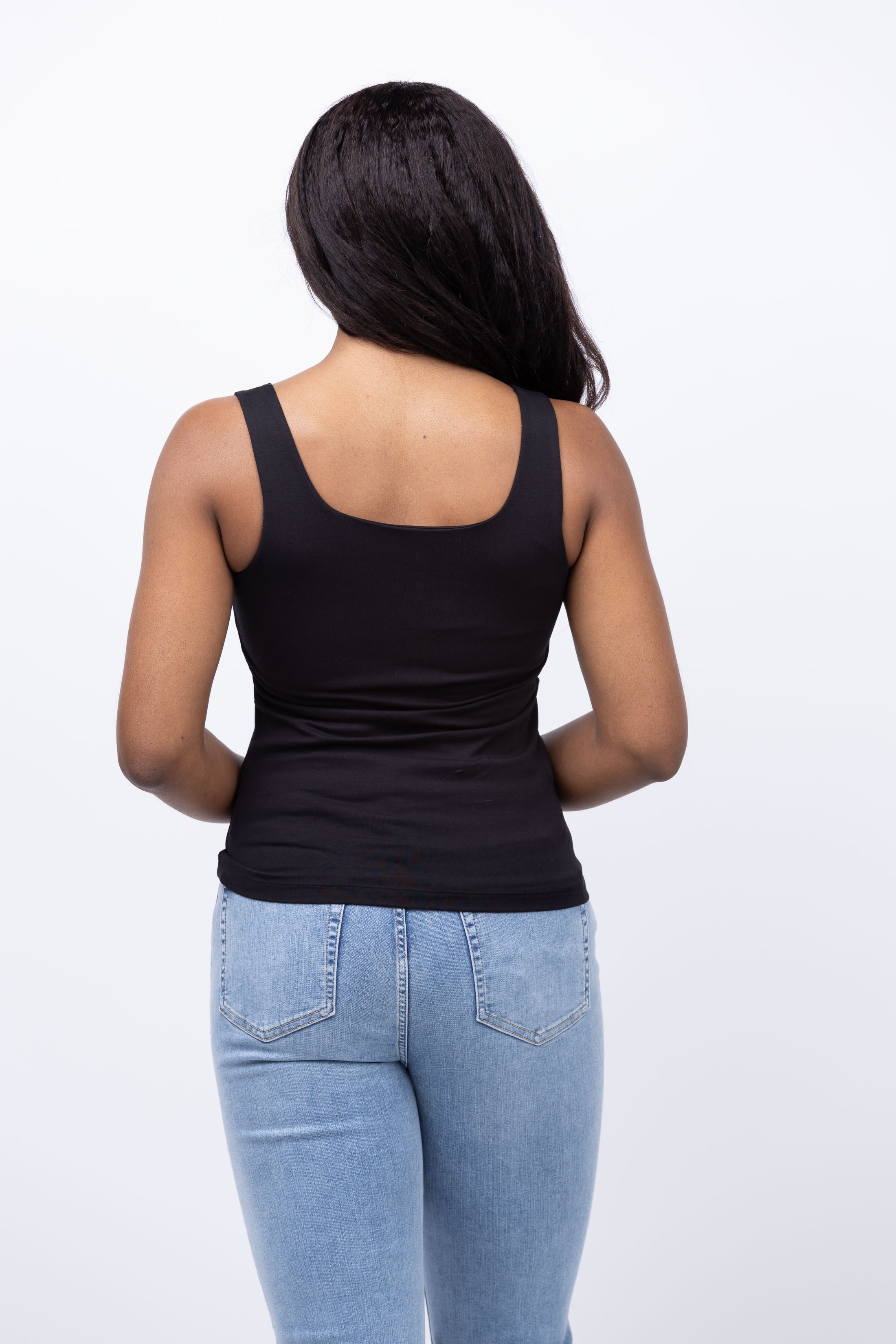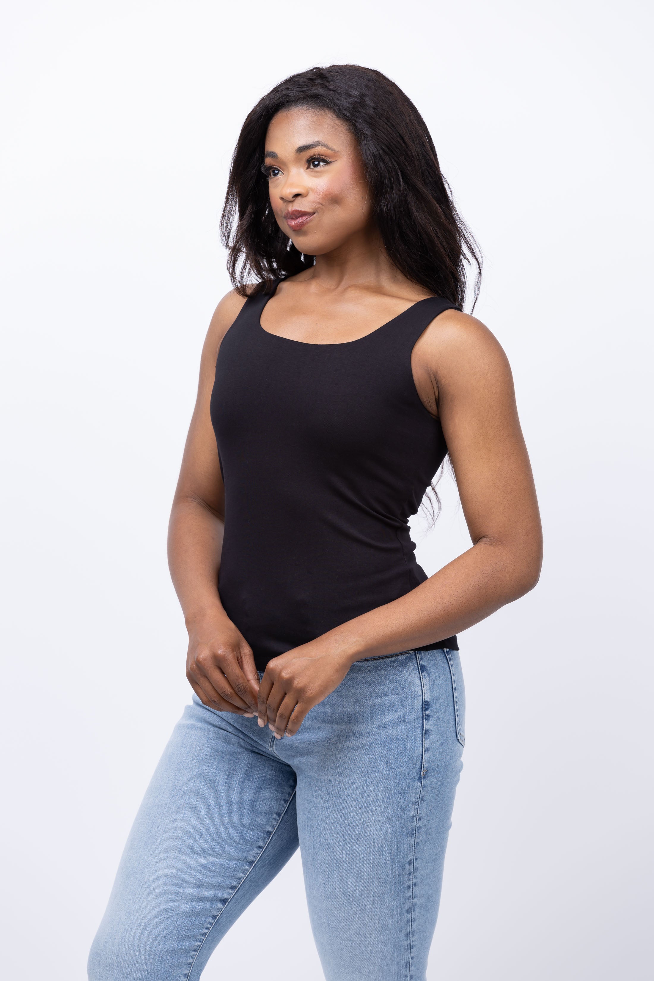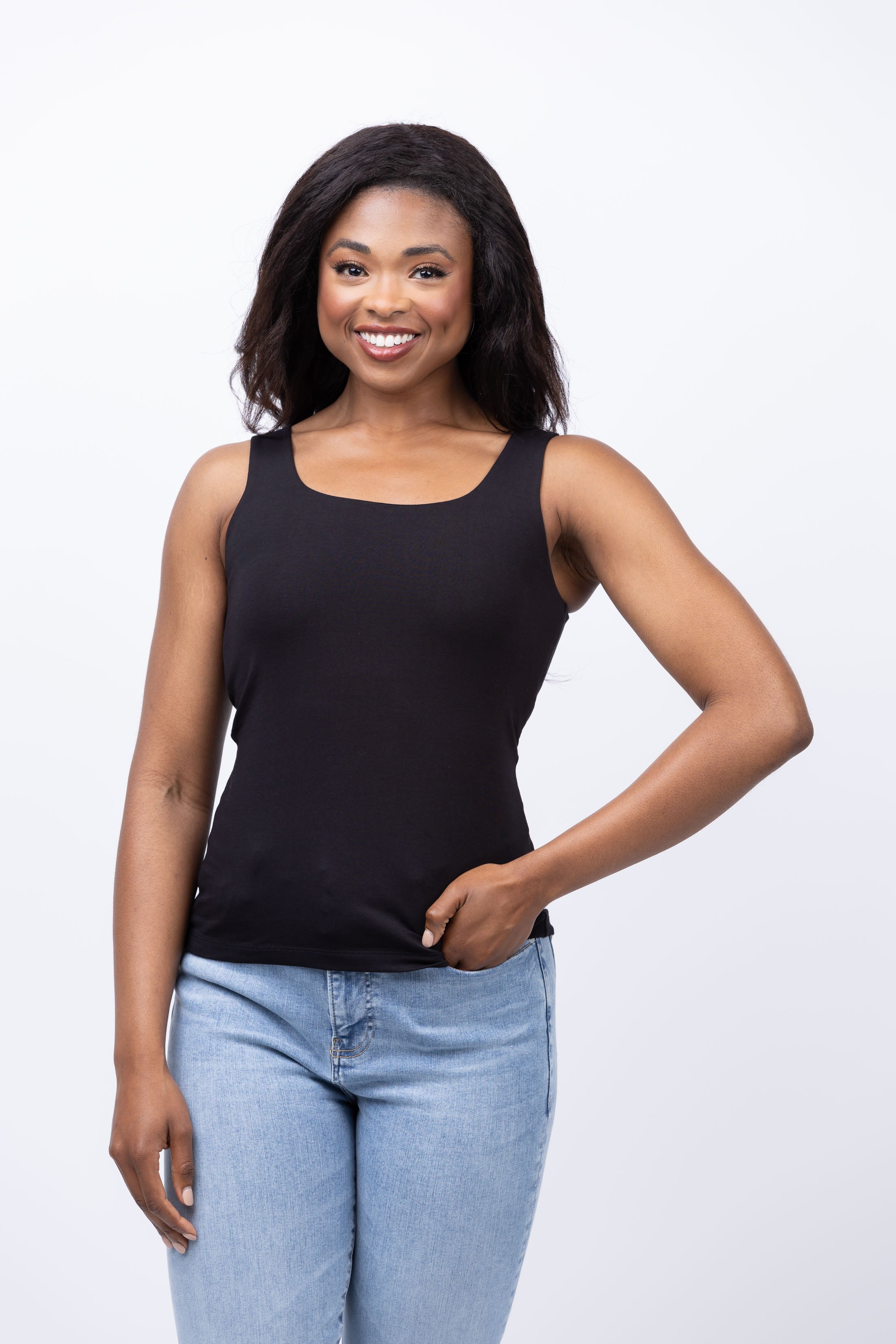 Introducing the Nic & Zoe Shelf Bra Tank in Black Onyx - the perfect blend of comfort and confidence. Made from midweight cotton and a touch of stretch, this tank allows for complete mobility and is non-see-through. With a scoop neck, wide straps, and a fitted silhouette, layering has never been easier.