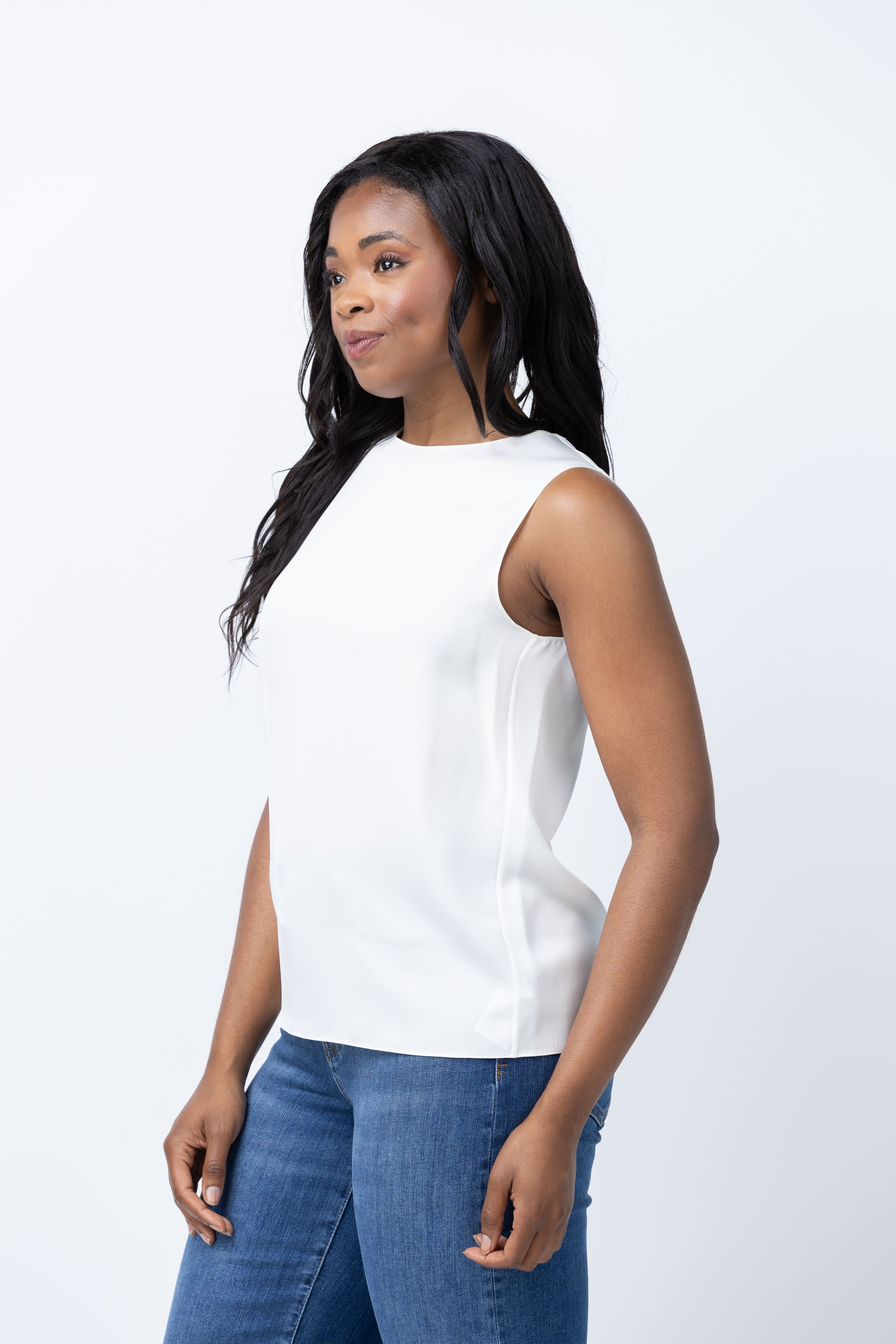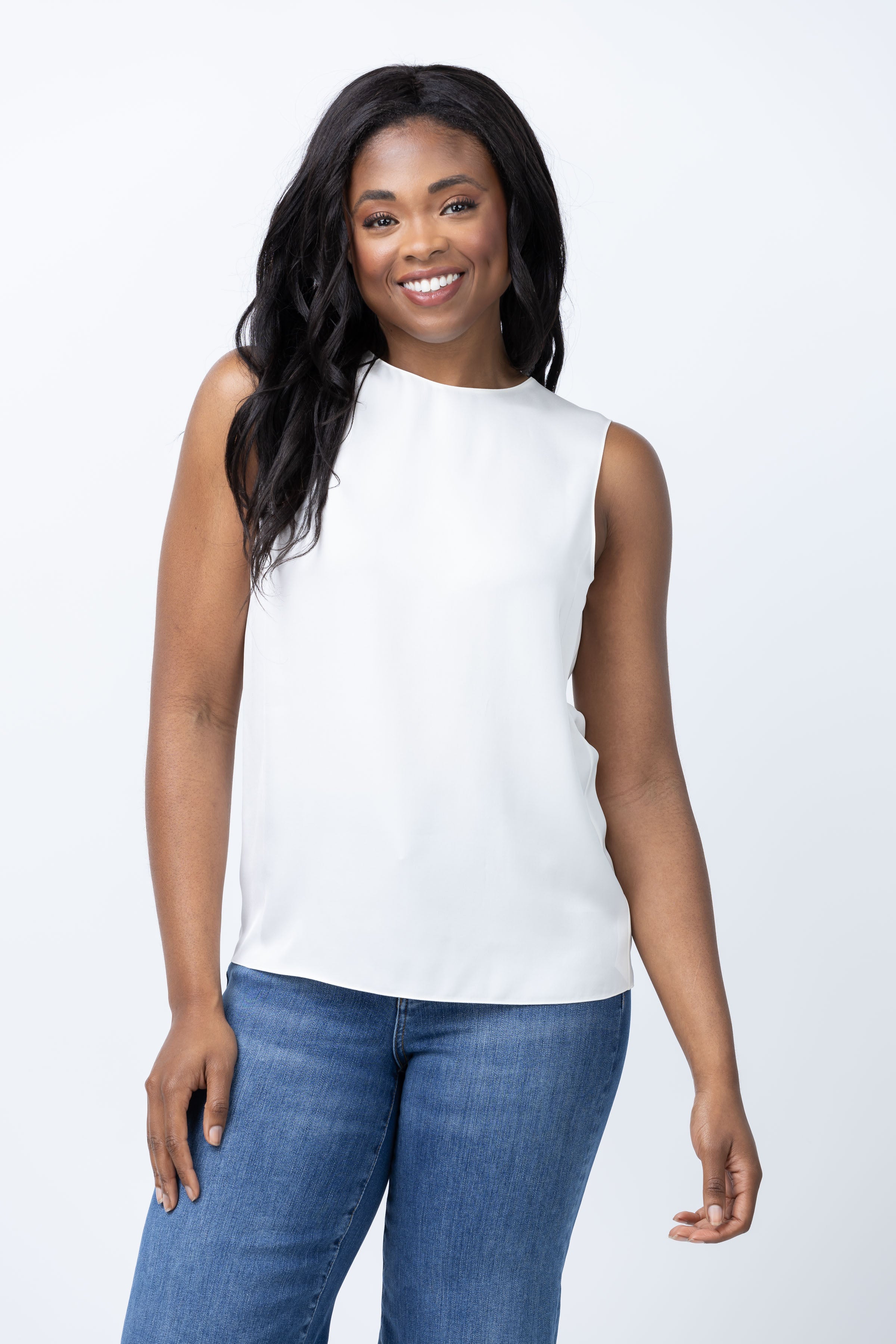 This ivory silk georgette tank top is the perfect underpinning for any jacket or cardigan. The classic shell is cut in a straight silhouette, with a playful back keyhole opening and hook-and-eye closure. Lightweight and luxurious, this top adds a subtle sheen and versatility to any wardrobe.