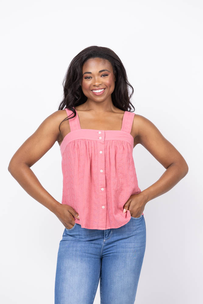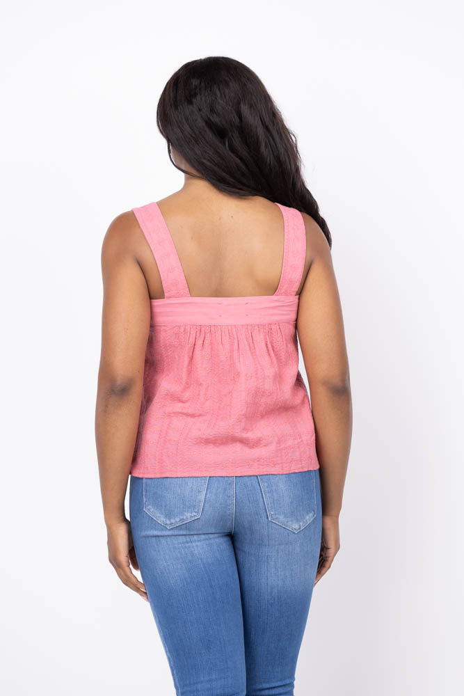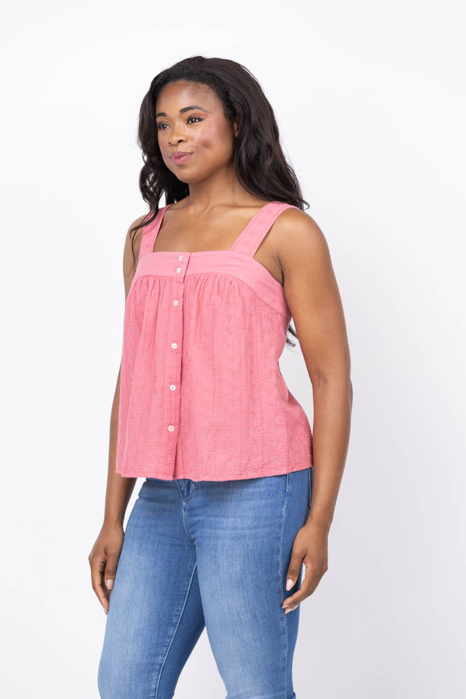 The XiRENA Cacee Tank in Pink Clay is crafted from sunflower-embroidered cotton, offering a refined texture that elevates your everyday look. Featuring a square neck, button-front detail, and a relaxed boxy fit, this easy tank combines comfort with subtle sophistication for effortless style.