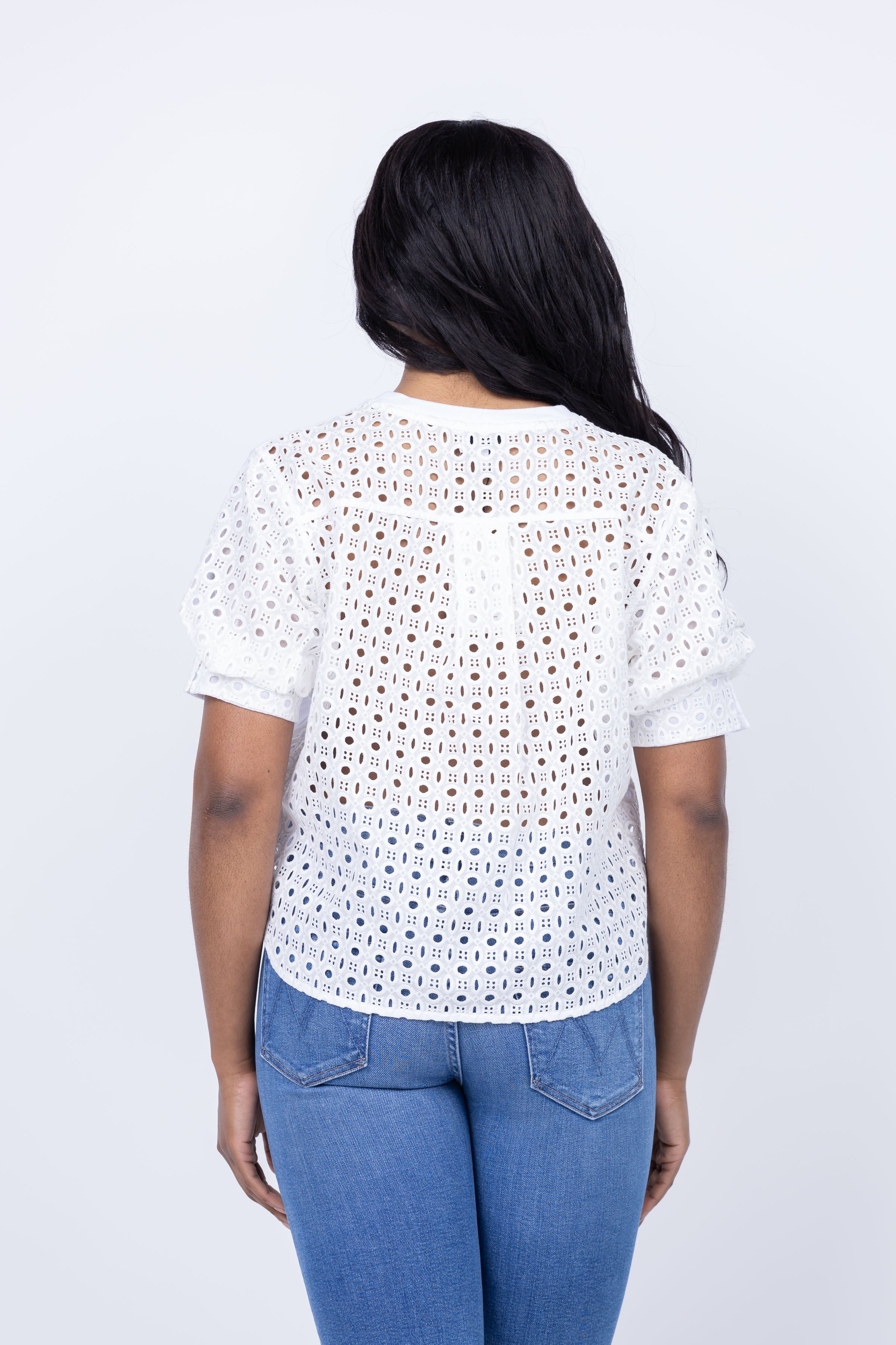 Introducing the Tanya Taylor Charlene Top, a modern take on the classic tee silhouette. Made with soft cotton jersey, it features an eyelet back and a high low hemline for added style. Perfect for everyday wear, pair it with the Courtney Skirt for a chic daytime look.