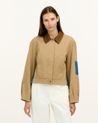 Crafted from sturdy cotton twill, the Gabe Jacket combines utilitarian charm with refined details. A contrasting collar, denim sleeve patch pocket, and canvas ribbon accent create visual interest while maintaining a timeless aesthetic. This season's essential layer elevates any wardrobe with its thoughtful construction and versatile dark khaki tone.