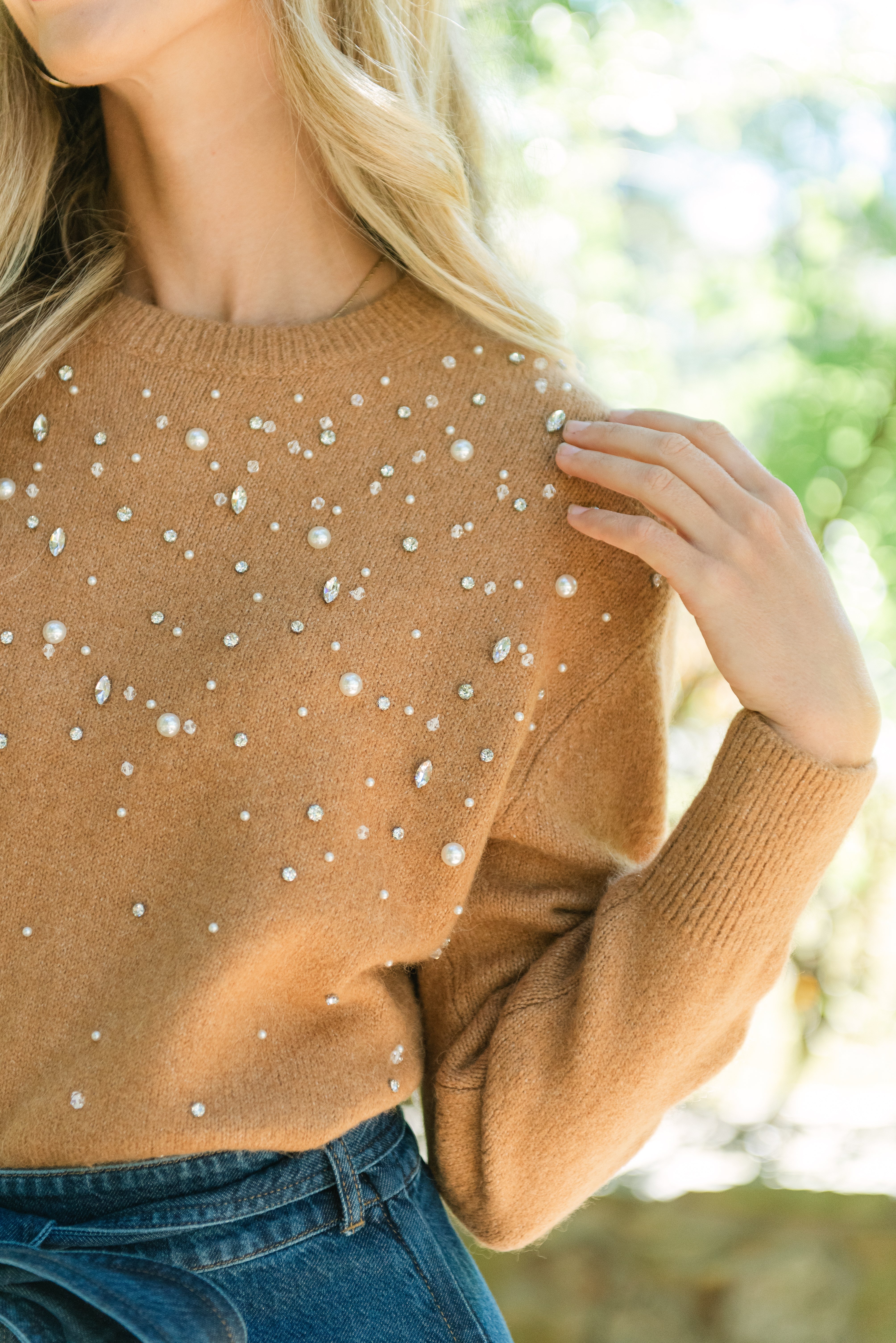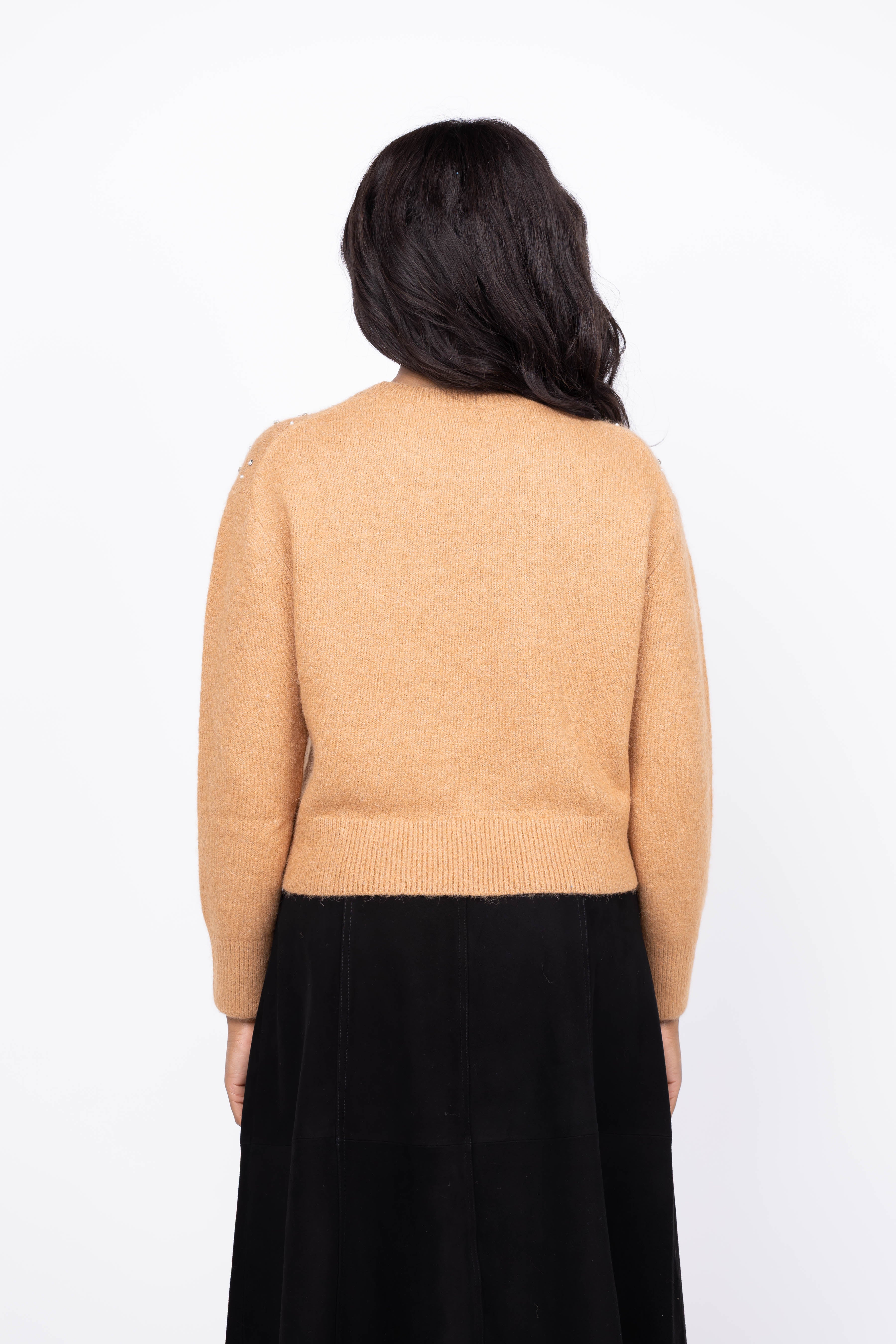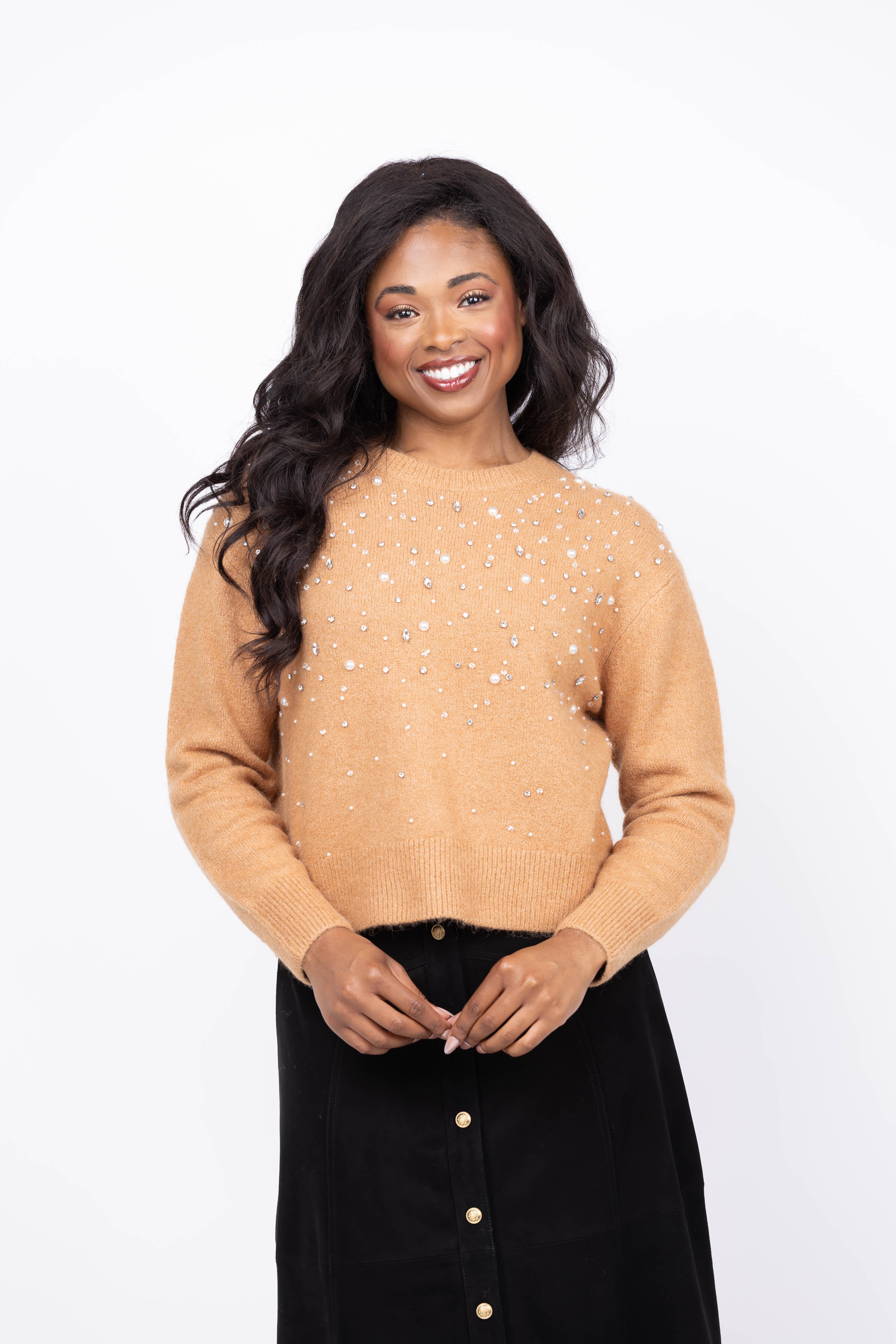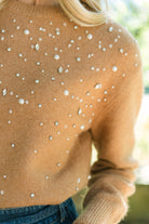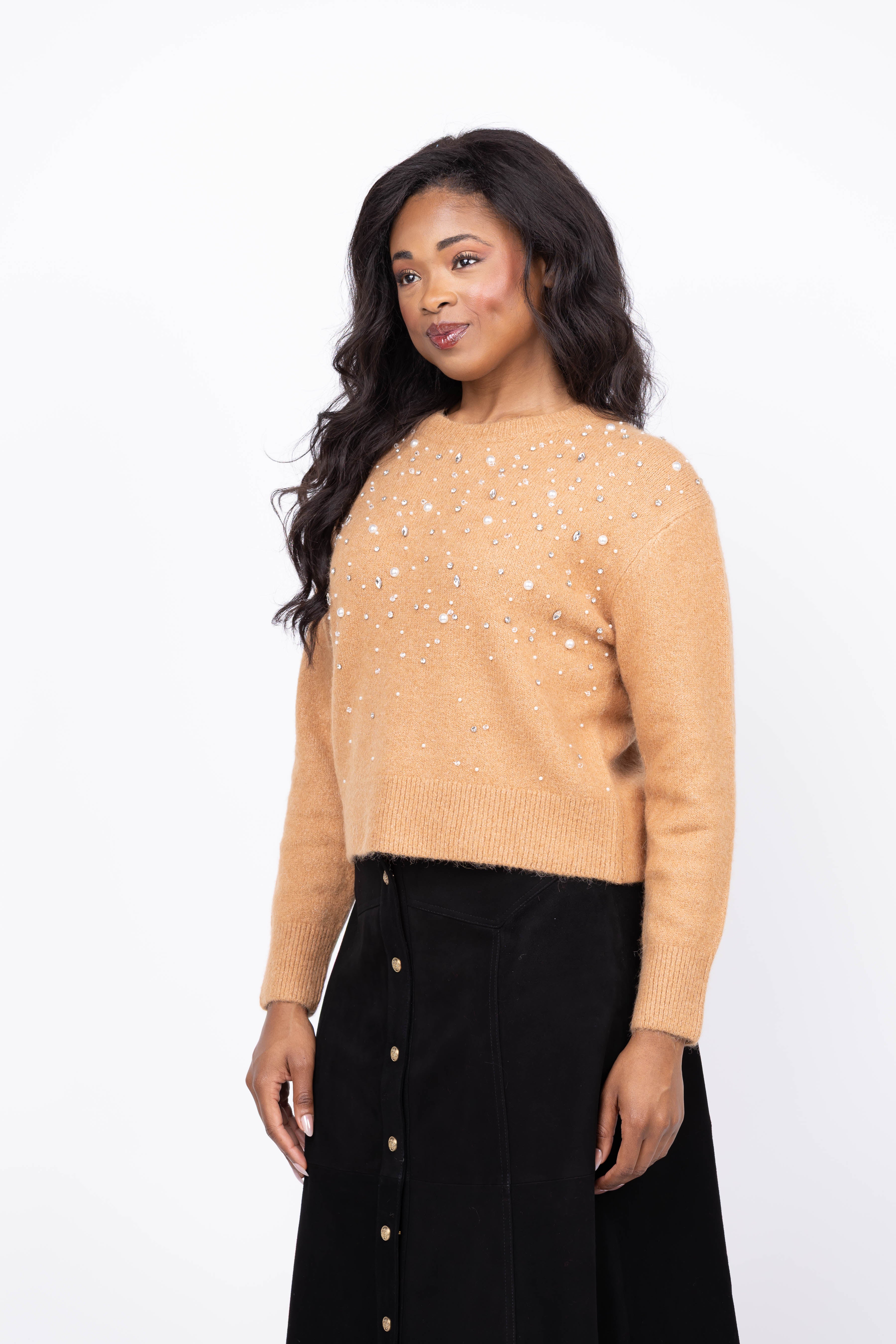 Elevate your fall wardrobe with the Tanya Taylor Lexia Embellished Sweater in Camel. Crafted from a soft alpaca-blend wool, this sweater offers luxurious warmth and comfort. Hand-sewn crystal and stone embellishments add a striking, artistic detail that transforms a classic knit into a statement piece. Perfect for those who appreciate timeless style with a modern edge, the Lexia sweater makes every outfit effortlessly chic.