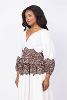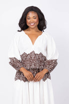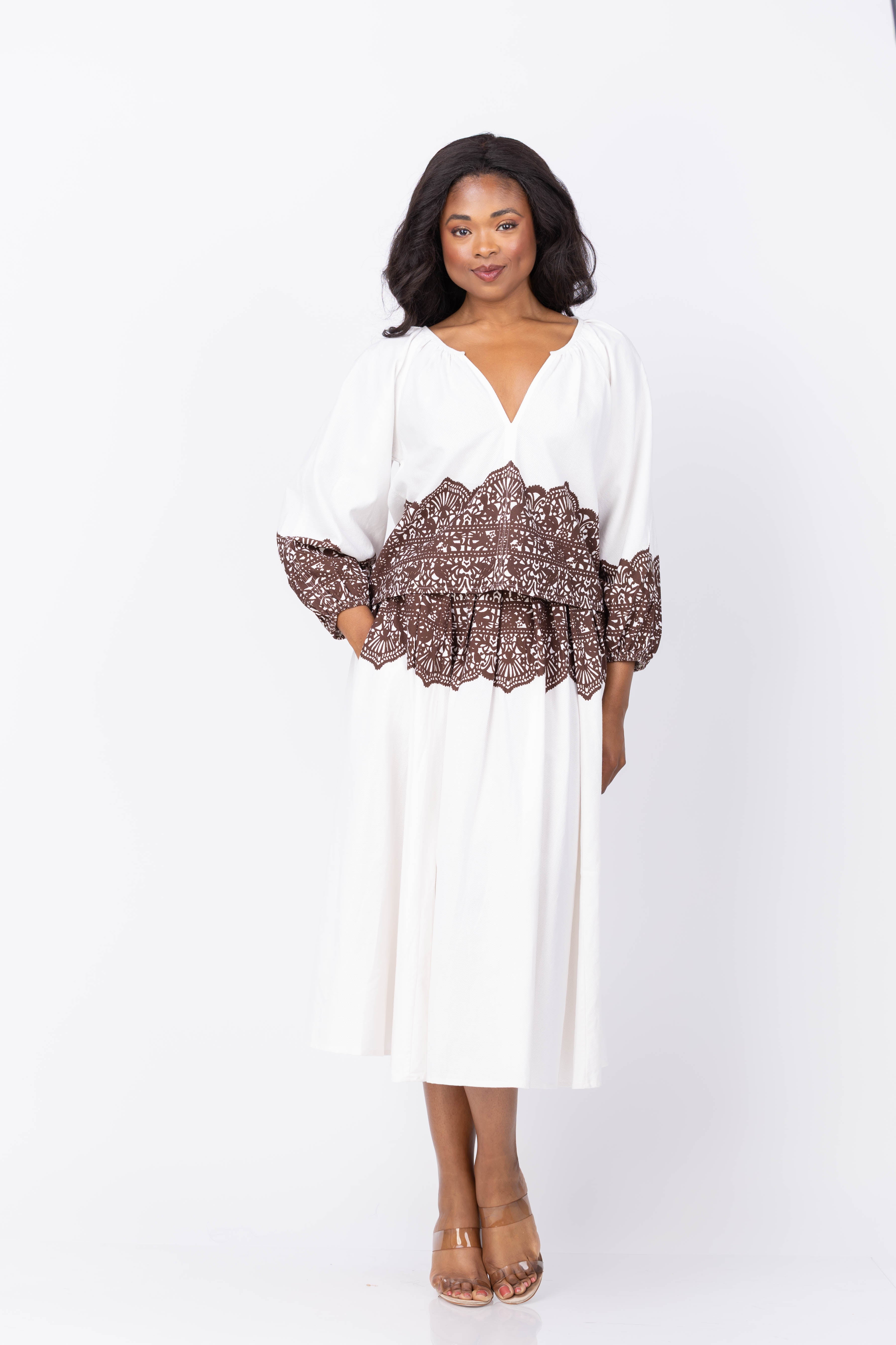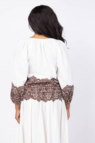 Crafted from textured cotton with a soft, broken-in feel, The Chariot Top combines comfort and style effortlessly. Its open neckline and deep front slit create an elegant silhouette, while the gentle shirring and full tapered sleeves add refined detail. The western lace print along the hem gives a nod to classic cowboy charm, making this cream top a versatile statement piece perfect for elevating your everyday wardrobe.
