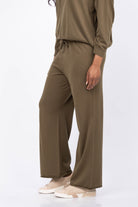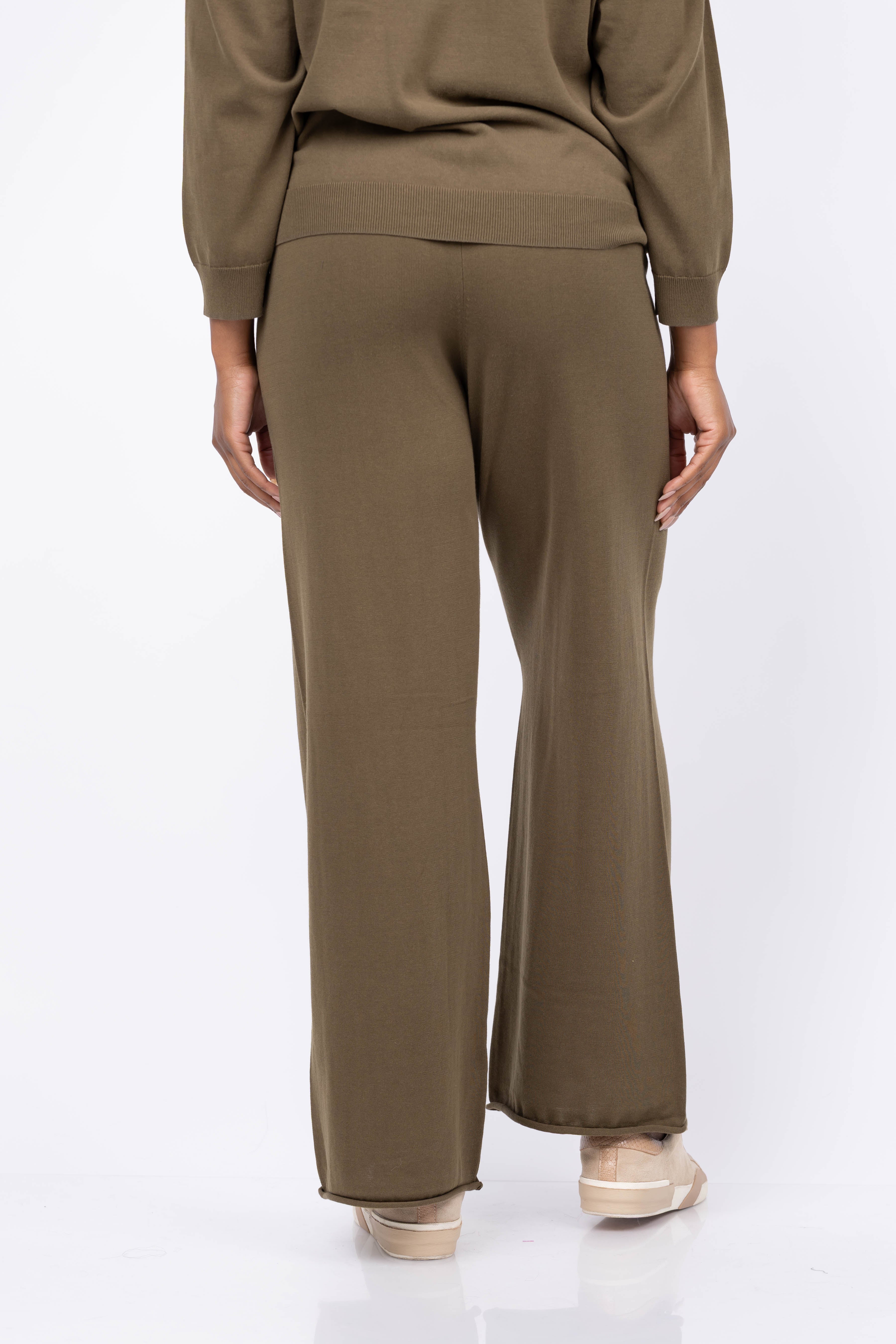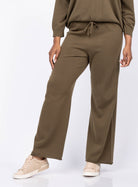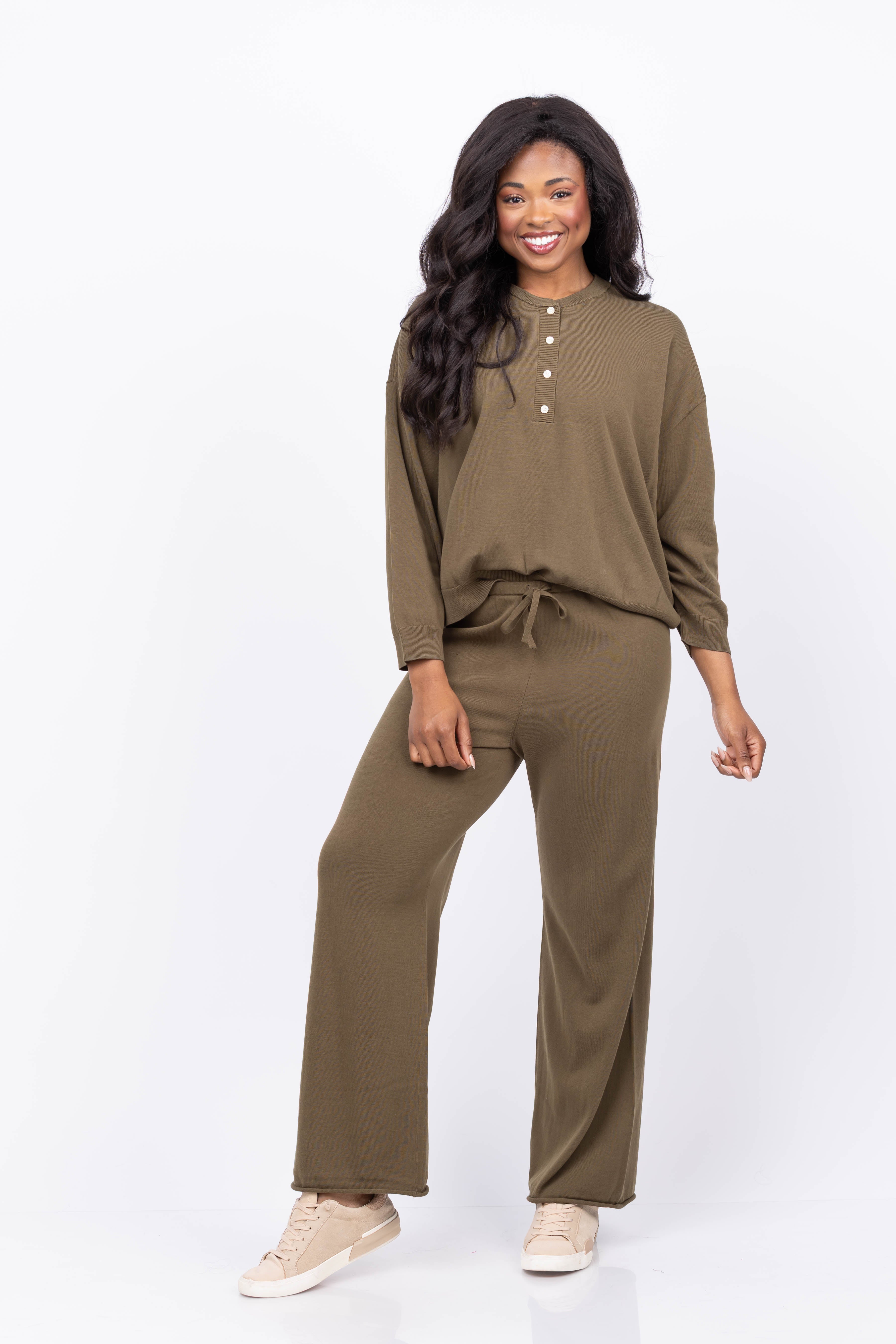 The Great. The Rec Sweater Pant in Army offers relaxed comfort with a stylish wide-leg silhouette. Crafted from soft high-twist yarn, it features an elastic waistband with a delicate knit tie for a customizable fit. The unfinished hem adds an effortless touch, making these pull-on pants perfect for laid-back days and versatile styling.