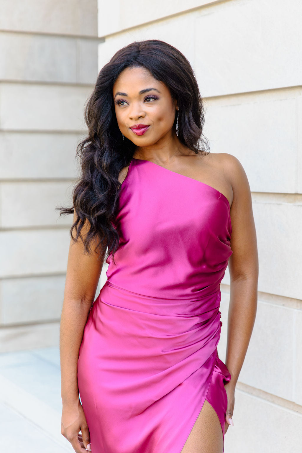 Experience effortless elegance with the Sei Asym. Gathered Wrap Gown in Sakura. Crafted from luxurious silk charmeuse, it features a striking one-shoulder ruched bodice supported by a delicate spaghetti strap. The wrap skirt showcases a tasteful slit with ruched detailing, adding a captivating touch of allure. Fully lined in silk for exceptional comfort, this gown closes discreetly with a hidden side zipper, ensuring a flawless fit. Perfect for special occasions, it blends sophistication with subtle sensuality to make you stand out with grace.