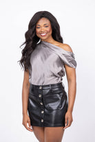Elevate your style with The Sei Asymmetrical Drape Top in Steel. This silk, off-the-shoulder design offers a graceful, modern silhouette perfect for making a statement. Pair it effortlessly with a sleek leather skirt or tailored trousers to create an unforgettable look that balances elegance with edge. Perfect for evenings out or sophisticated daytime events, this top adds a touch of luxury and versatility to your wardrobe.