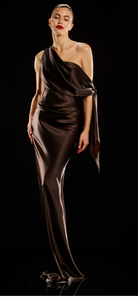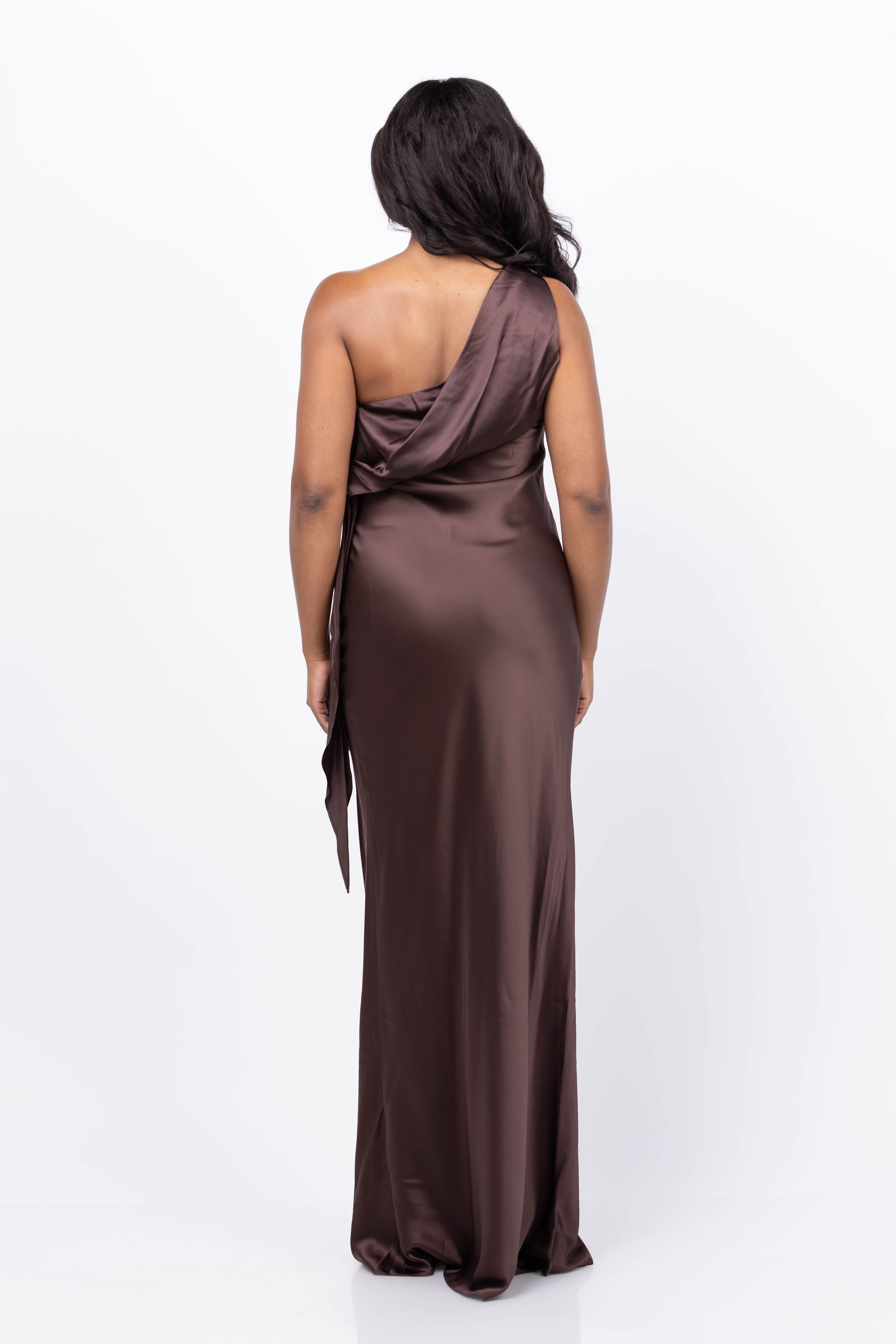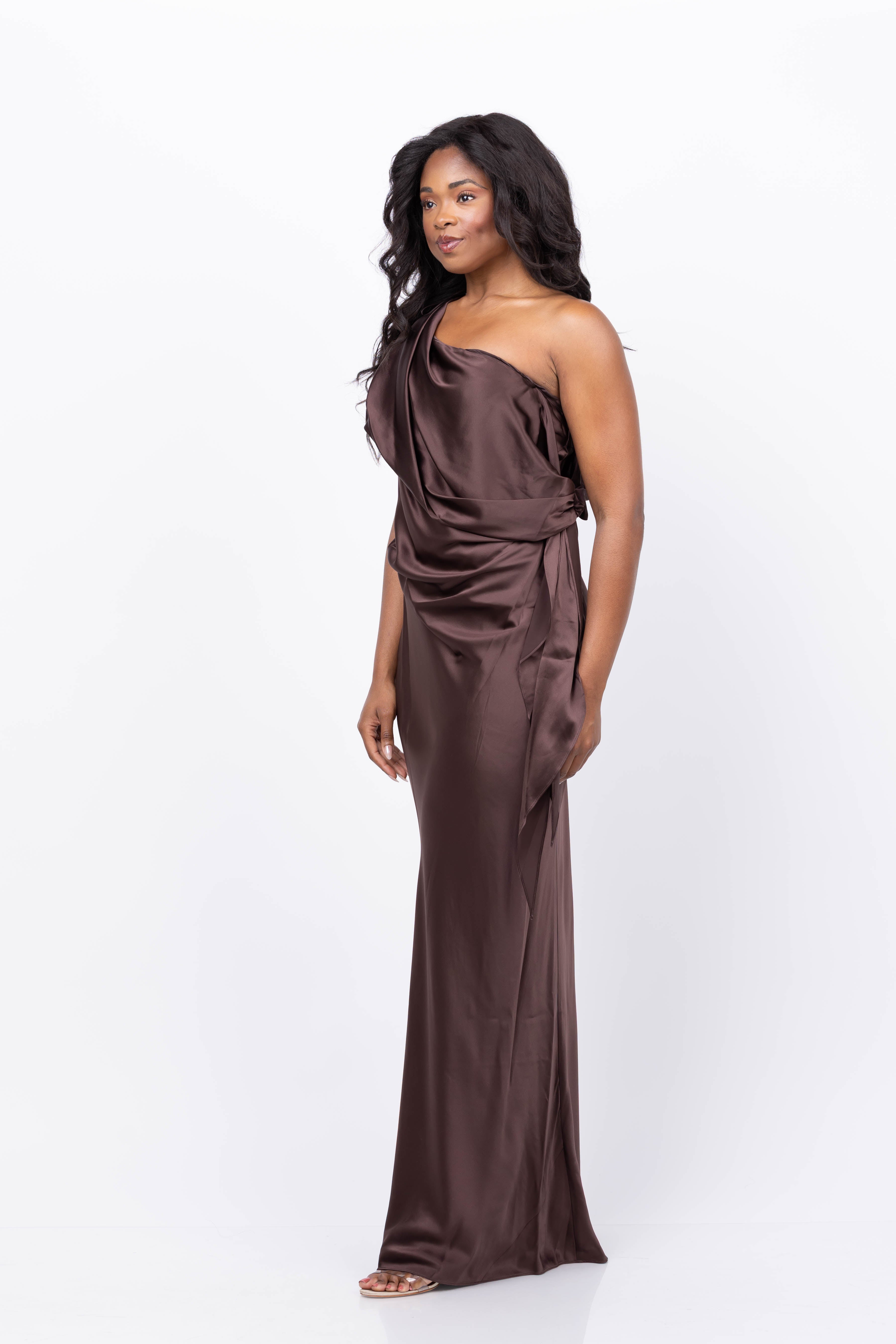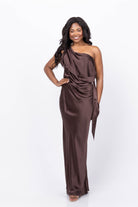 Elevate your fall evenings with the Sei Asymmetrical Tie Gown in Cocoa. Crafted from 100% silk, its luxurious drapey fabric gracefully contours your silhouette, offering both comfort and elegance. The unique asymmetrical tie detail adds a modern, sophisticated touch, making it perfect for special occasions or intimate gatherings. Embrace effortless style with this stunning gown that promises to make you feel confident and radiant all night long.