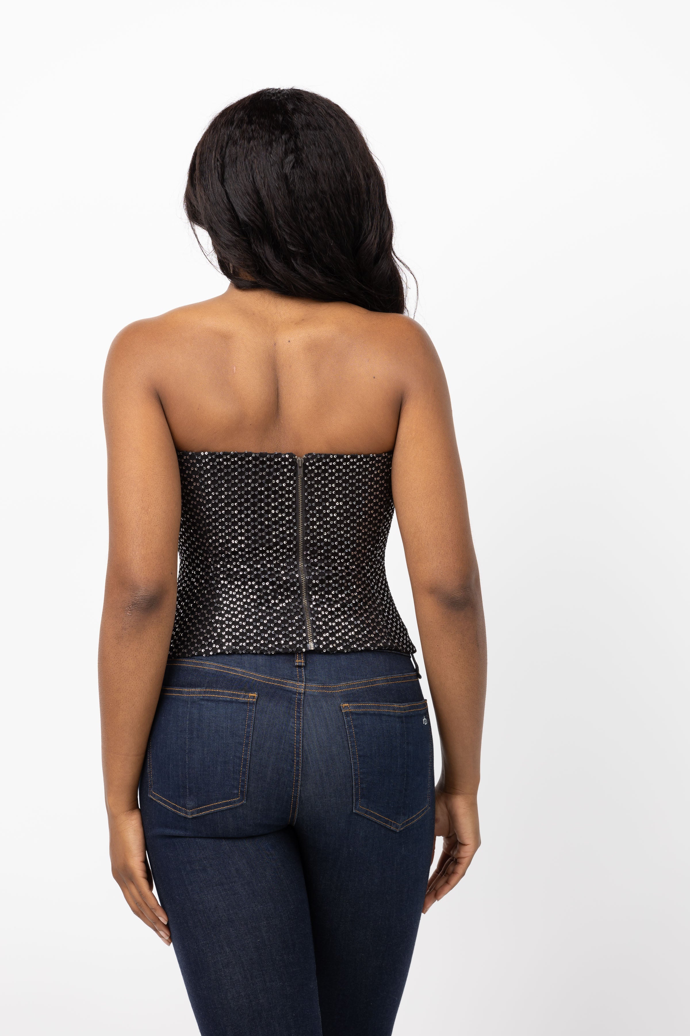 Elevate your night out look with the Sei Curved Bustier Strapless Top in Silver. Featuring a striking curved design, this top will make you stand out from the crowd. Perfectly paired with black trousers, it's a must-have for a stylish and unforgettable evening.