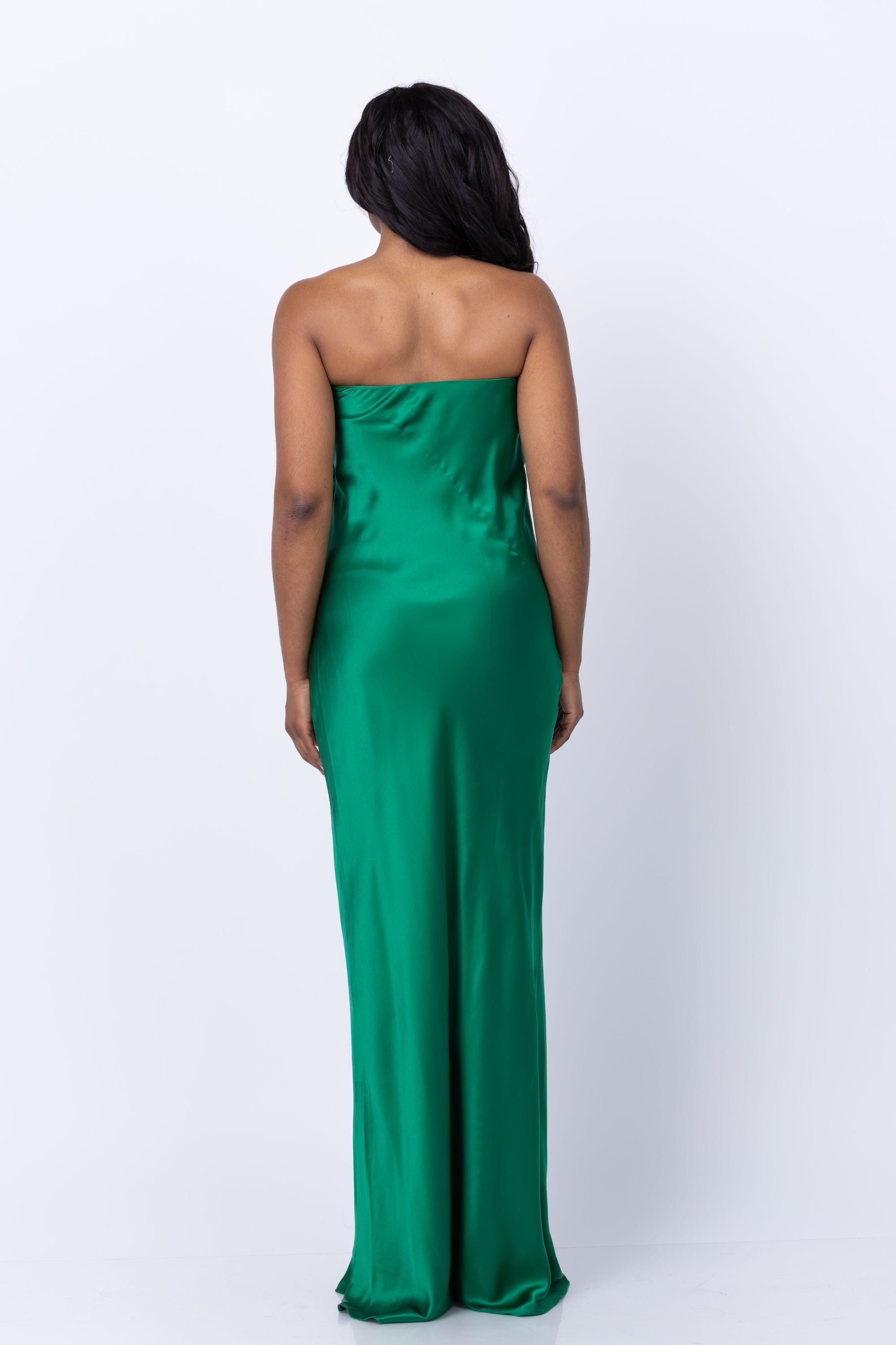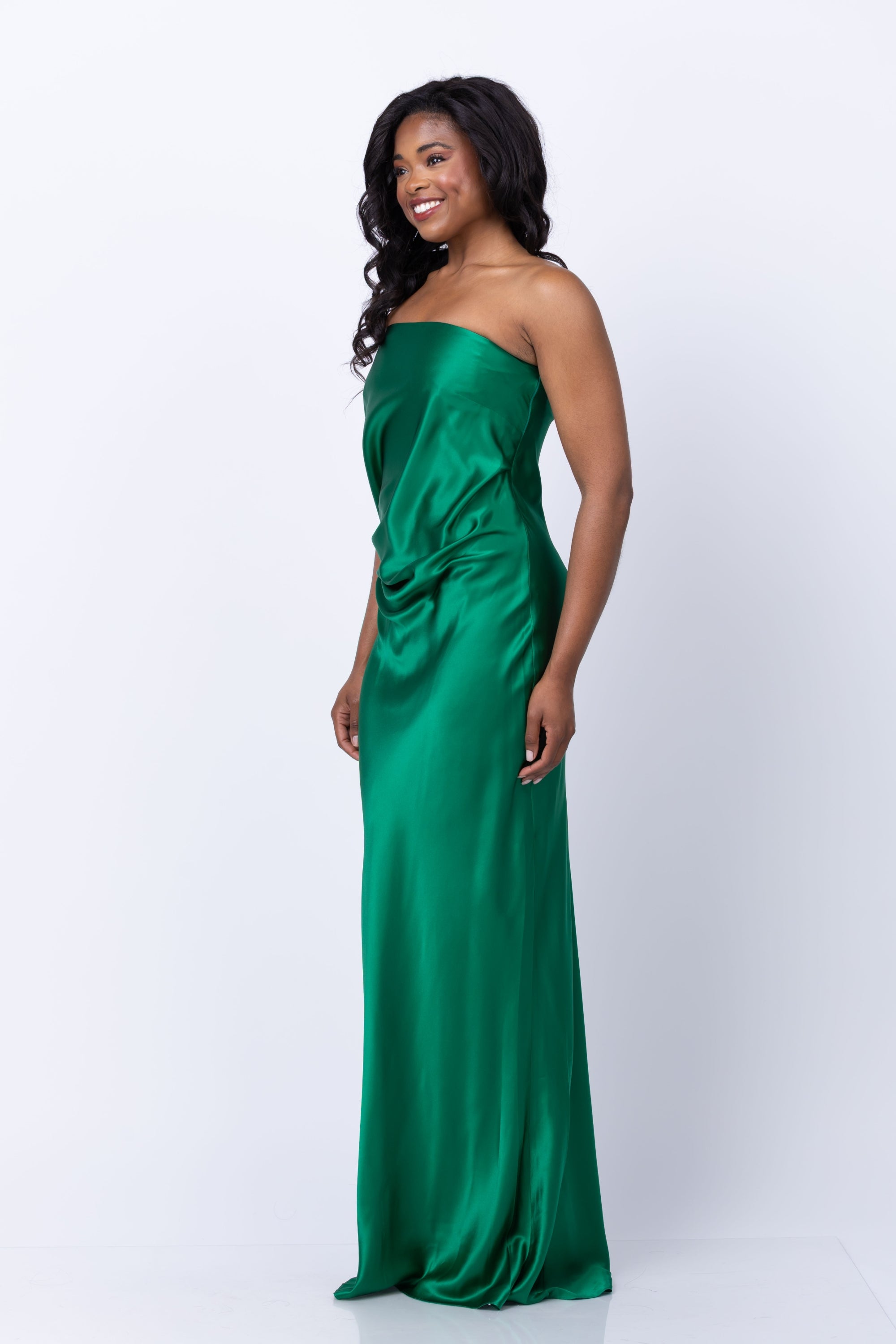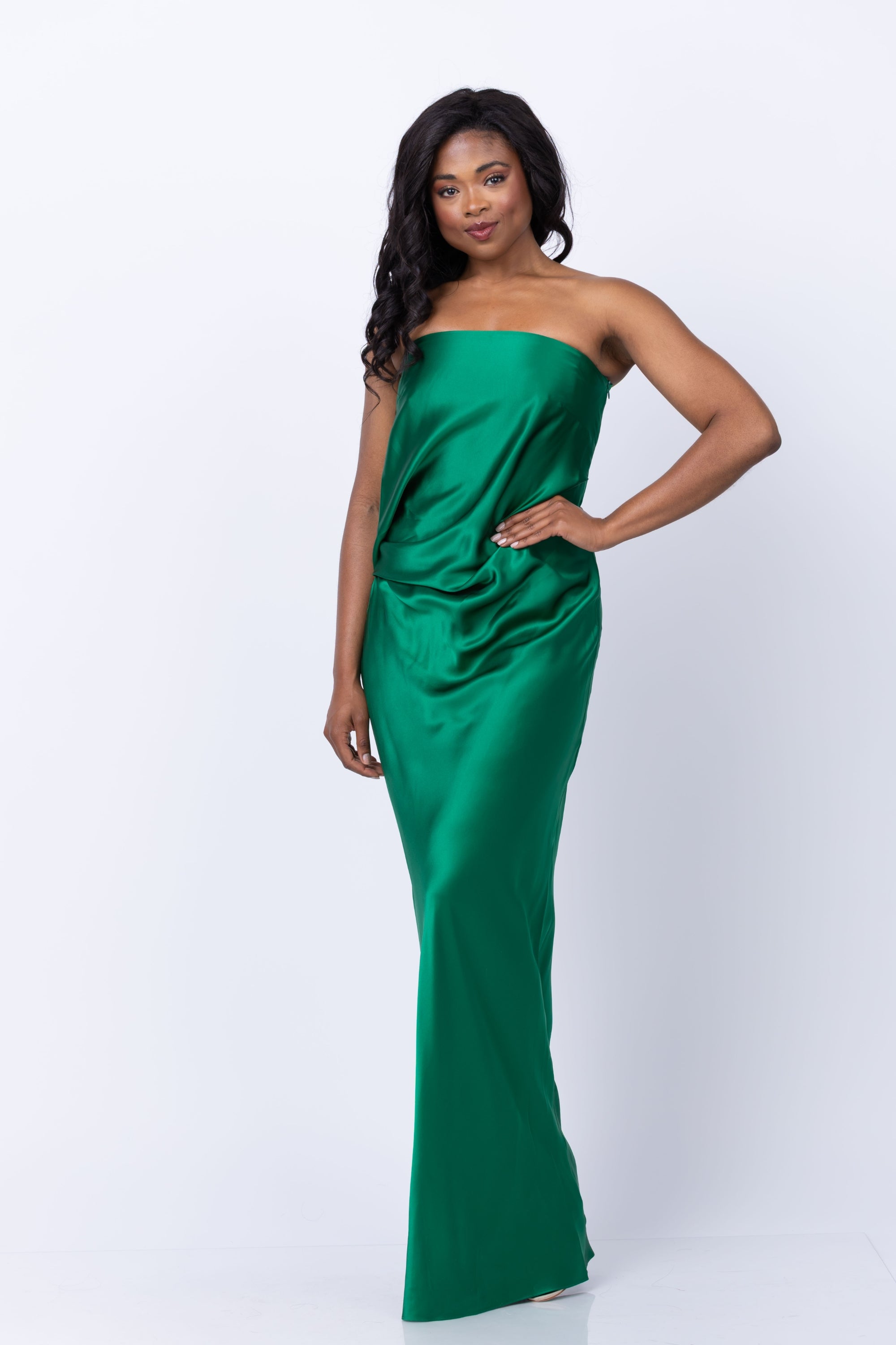 Indulge in the luxurious elegance of The Sei Draped Strapless Gown. Made from 100% silk satin, its stunning Verdant color will make you stand out in any event. Embrace the sensuality and sophistication of this breathtaking gown.
