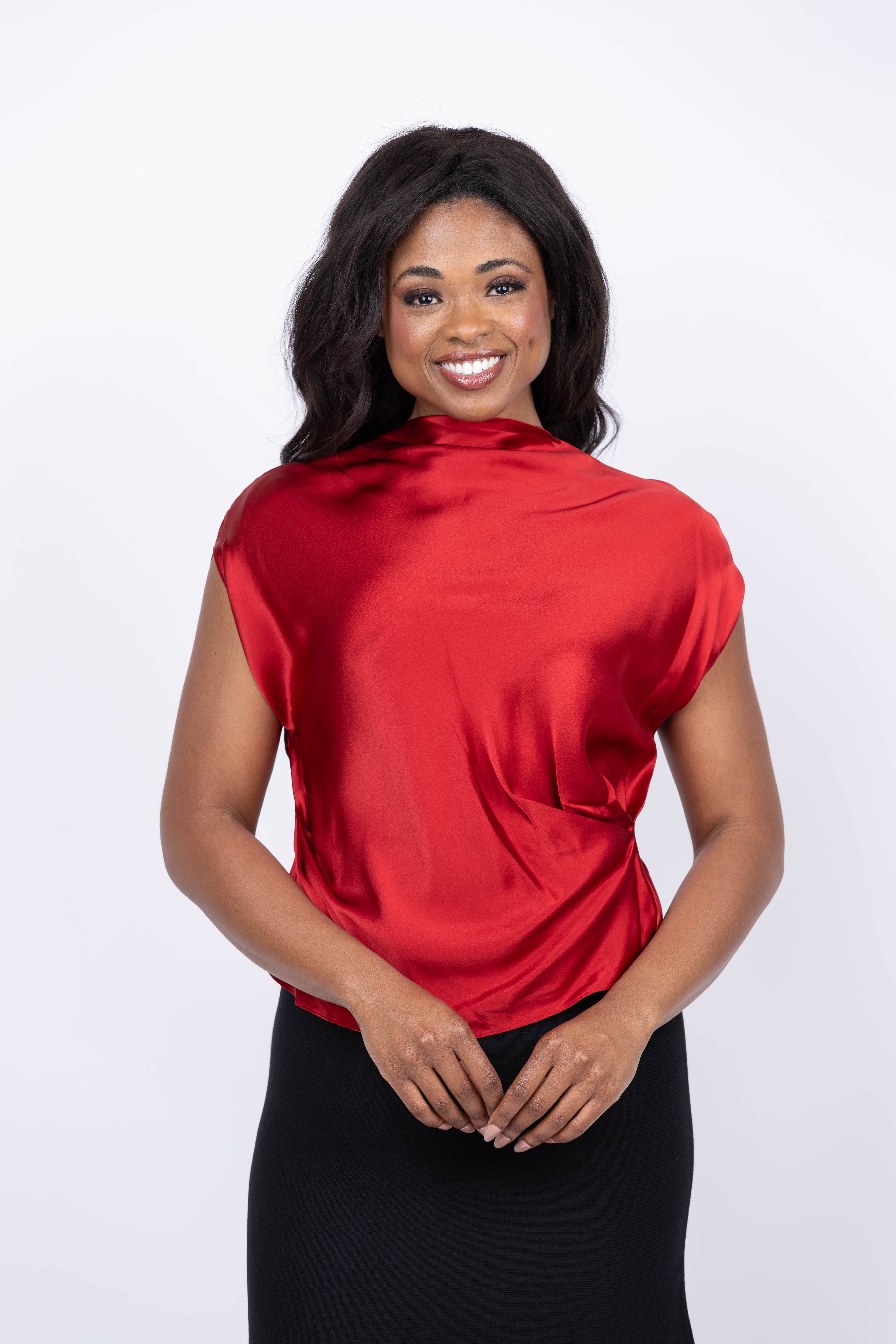 Elevate your wardrobe with THE SEI High Neck Drape Top in Ruby—a sophisticated piece that combines timeless elegance with modern ease. The luxurious satin fabric drapes beautifully against your skin, creating a flattering silhouette that works for both professional settings and evening occasions. A single button closure at the neckline adds refined detail while keeping dressing effortless. The rich ruby hue brings warmth and dimension to any outfit, making this versatile top an essential addition to your collection.
