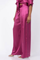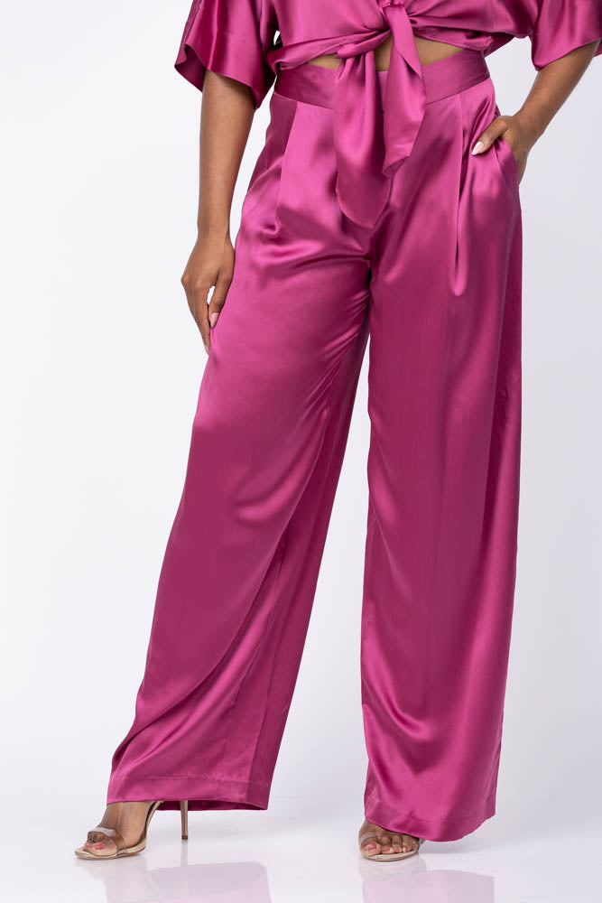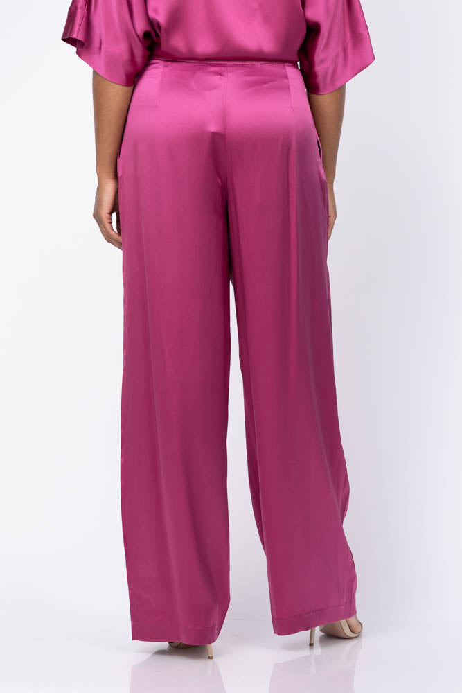 Elevate your wardrobe with The Sei Relaxed Trouser in Sakura, crafted from luxurious silk charmeuse for a smooth, elegant feel. Featuring a mid-waisted, wide-leg design with delicate pleating, these trousers offer effortless comfort and flattering movement. Practical hidden side pockets and a secure center front fly with hook-and-bar closure blend style with functionality. Perfect for any occasion where refined ease is key. Imported for exceptional quality.