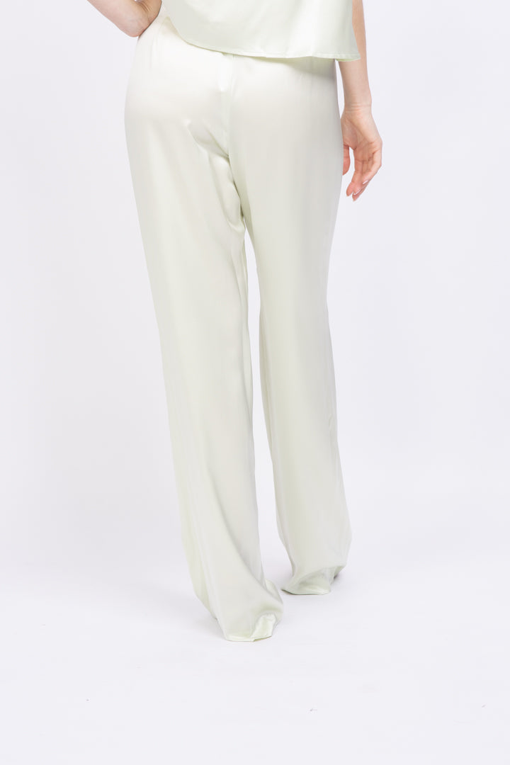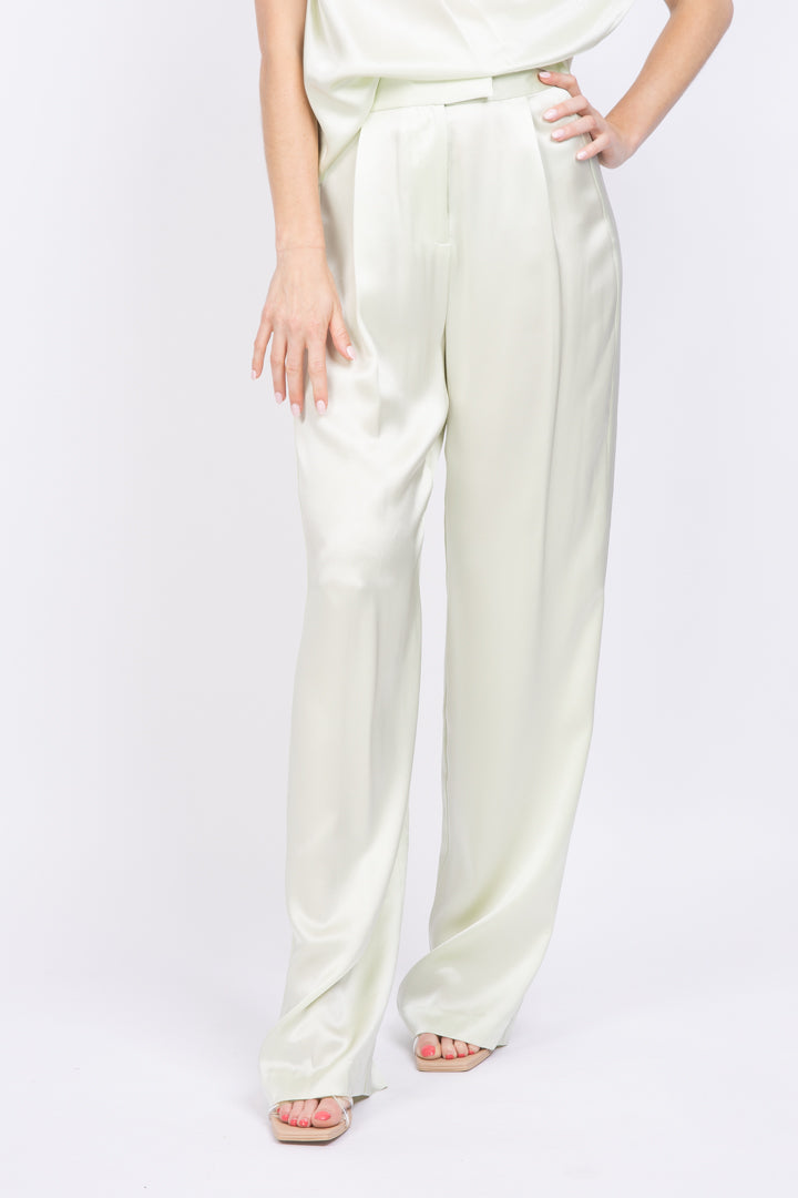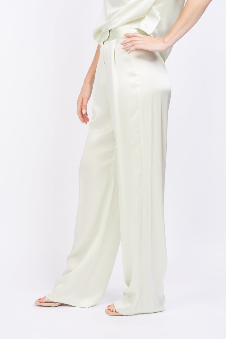 Fluid silk trousers with a high-gloss finish are cut in a pleated wide-leg silhouette.