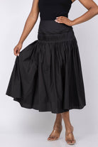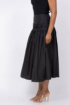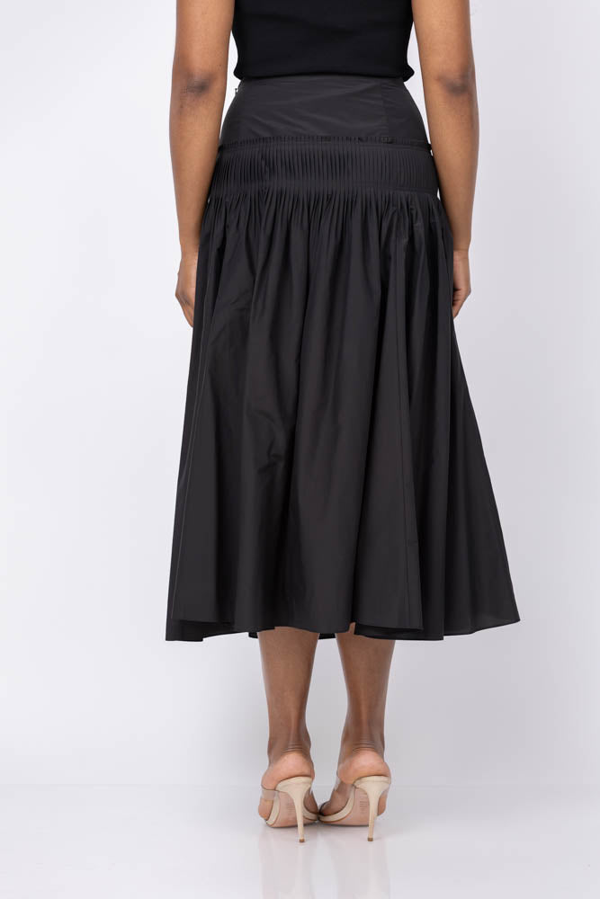 The Theory Accordion Yoke Skirt in Black features a clean, streamlined waist that flatters your silhouette. Below the hip, an elegant accordion-pleat panel with soft pleats adds graceful movement and texture, making this skirt a sophisticated choice for both work and weekend wear.