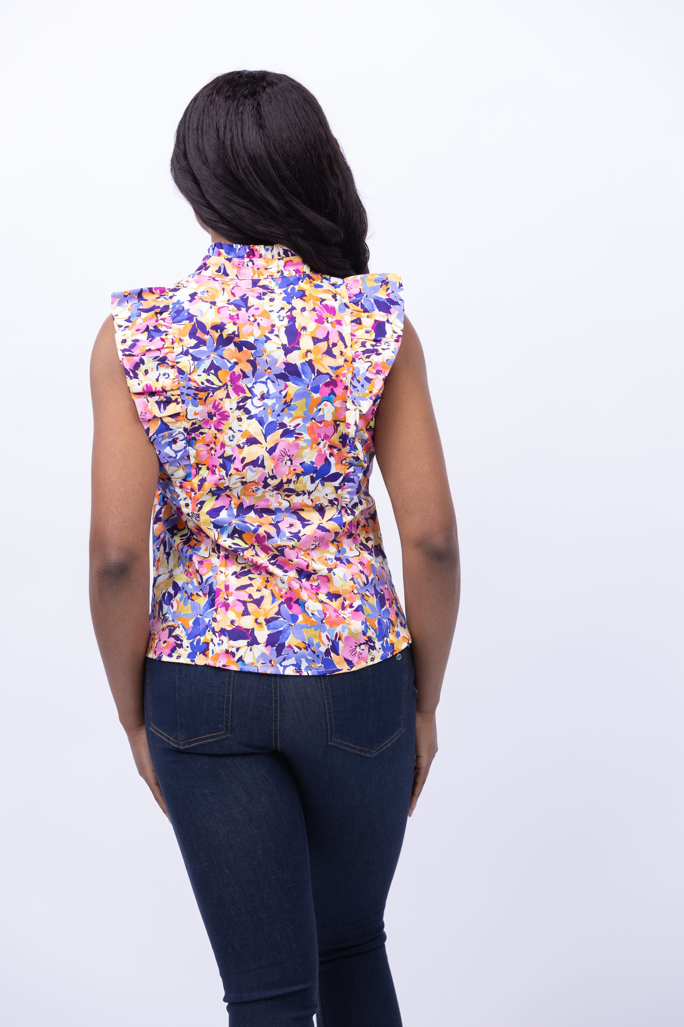 Tyler Boe Julia Woven Mandarin Collar Sleeveless Scallop Ruffle Trim Hidden Placket Button-Front Top in Multi Floral