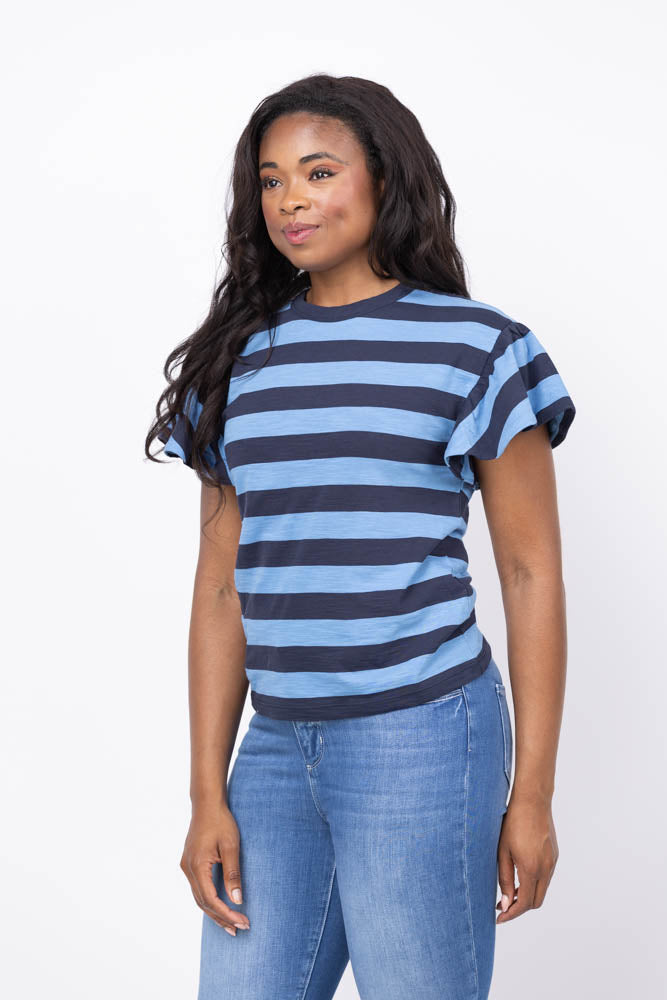 The NATION LTD Camille Ruffle Sleeve Top in Rugby Stripe elevates your everyday tee with playful flutter sleeves and a relaxed dropped shoulder for effortless style. Crafted from soft cotton jersey, it offers all-day comfort while the classic crew neckline keeps it timeless. Perfect for adding a flirty, casual touch to any outfit, this top is your go-to when a plain tee just won’t do.