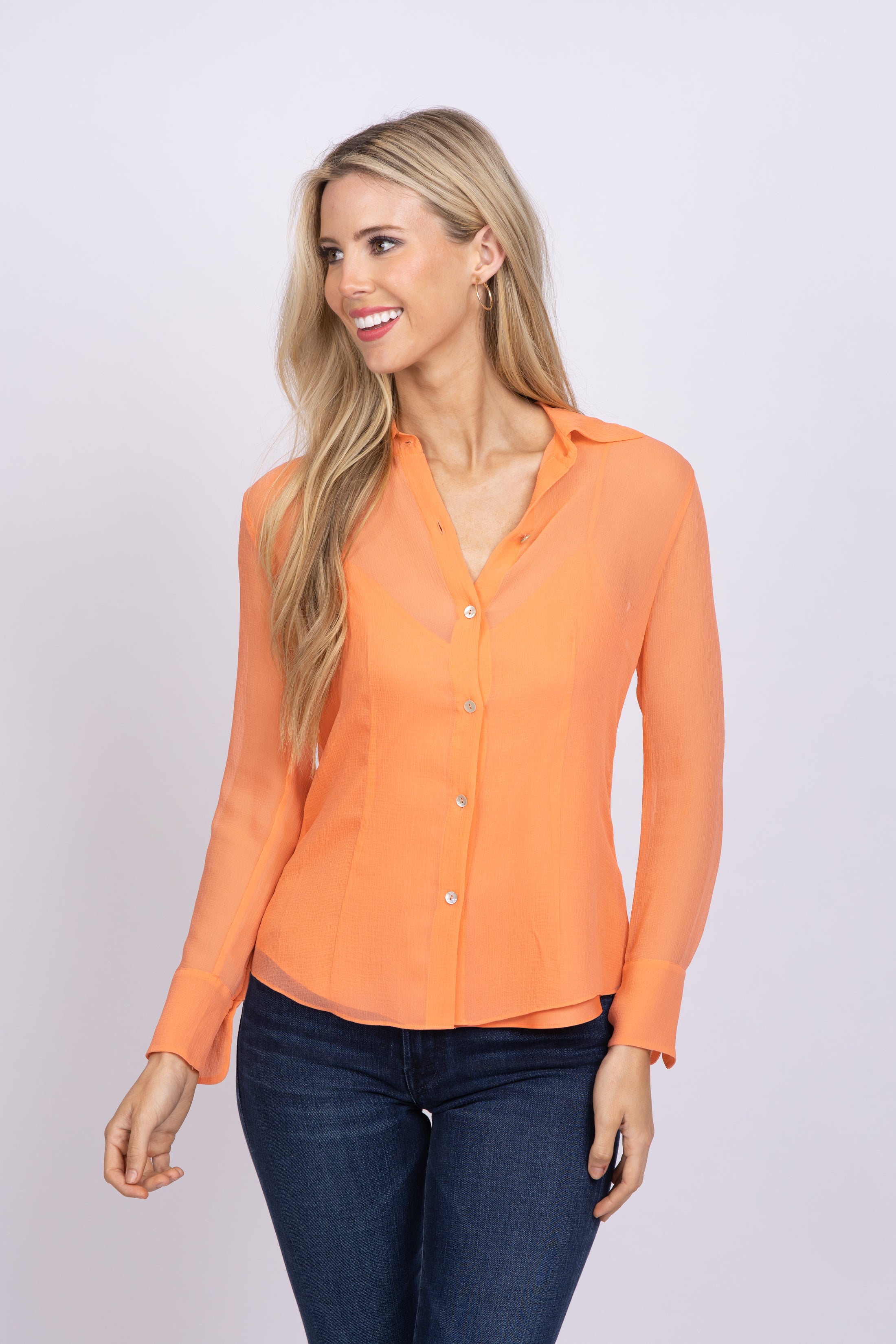 Discover effortless luxury with our Vince Sheer Crinkled Silk Shirt. Soft, gauzy silk provides an opulent look and feel, with a delicate V-neck camisole and adjustable straps for a perfect fit. An elegant button-through front and Agoya buttons, plus back yoke and line camisole, make the perfect finishing touches. Indulge in pure silk luxury!