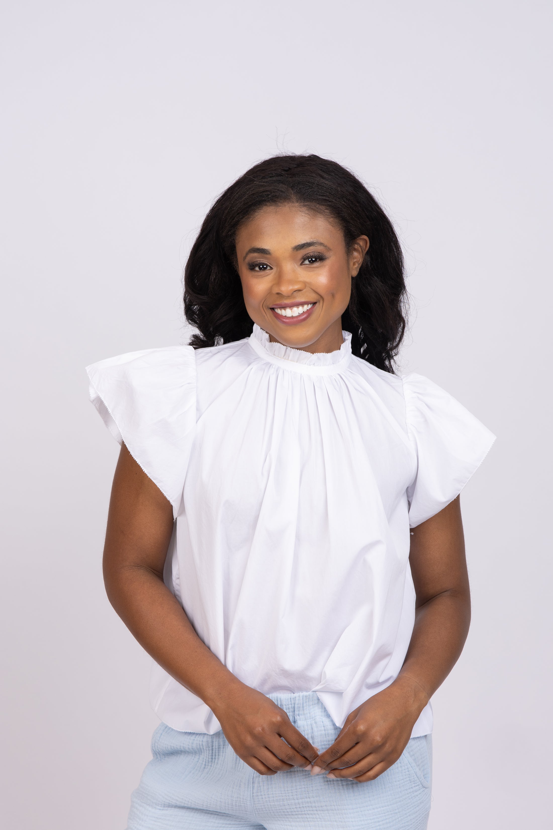 The Carla Highneck Blouse is our favorite go-to femme shirt. We love the high neck ruffled collar and wide ruffle sleeves with quaint trim detail along the hem lines. Finished with a single back-neck button.