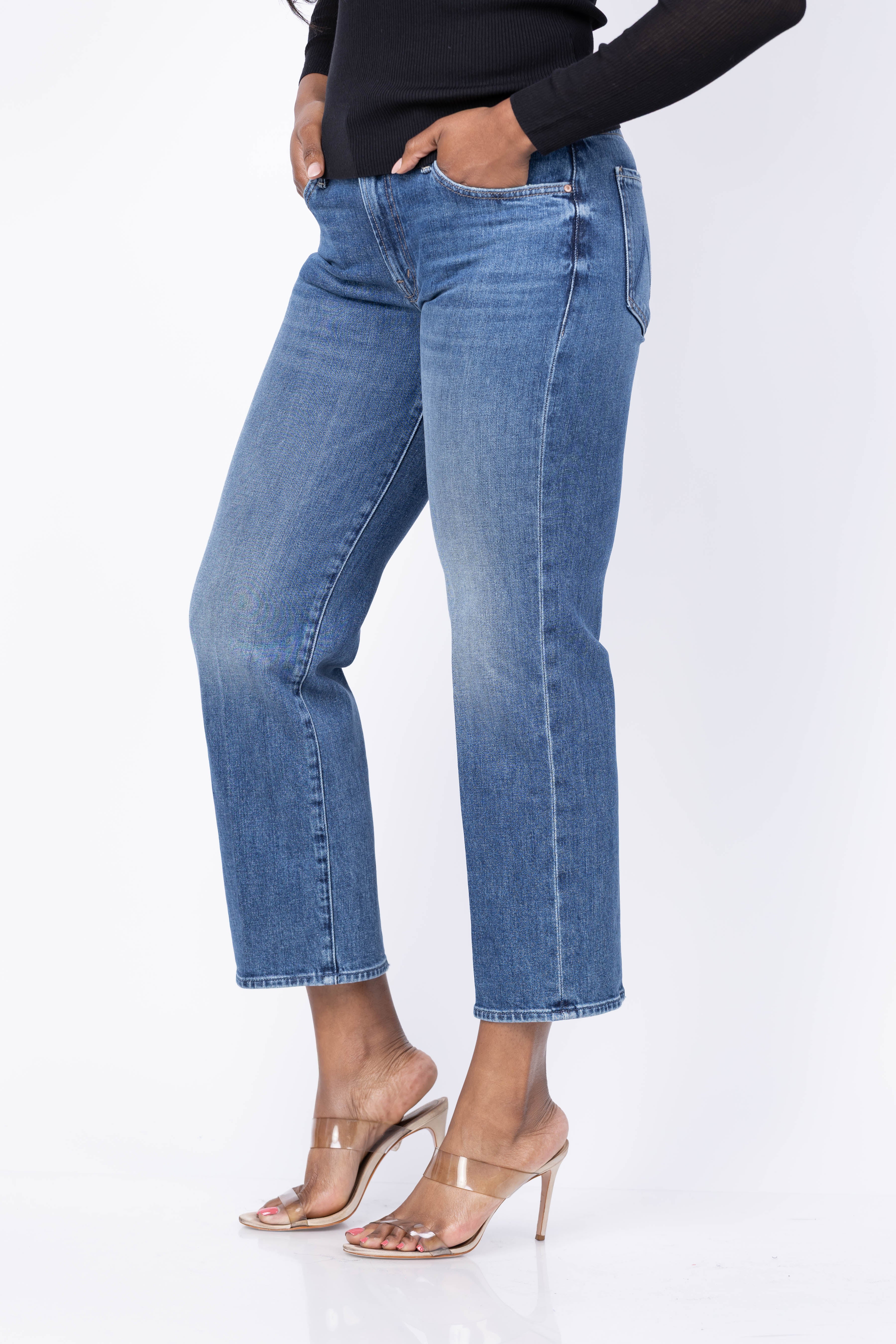 Introducing the MOTHER Denim Mid Rise Rambler Zip Ankle—where vintage vibes meet modern edge. This mid-rise silhouette features a relaxed wide straight leg that skims the ankle with effortless cool. Crafted from semi-rigid denim in a captivating mid blue, it showcases authentic whiskering and artful knee fading for that coveted lived-in look. The zip fly adds a contemporary twist to a timeless style. Perfect for anyone seeking jeans that balance comfort with undeniable character, these Tambourine Man beauties are ready to become your new go-to.