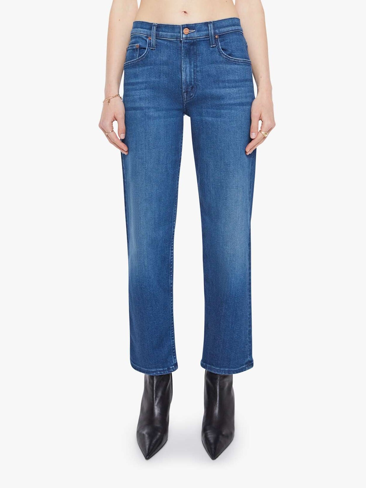 Elevate your everyday denim with MOTHER's The Newbie Ankle—a high-rise straight-leg essential that flatters and moves with you. Crafted from comfortable stretch denim in a versatile mid-blue wash, this pair features classic whiskering and faded knee details for effortless style. The clean ankle hem and zip fly create a polished silhouette perfect for dressing up or down. Whether you're running errands or heading out for the evening, these jeans deliver the perfect blend of timeless design and modern comfort that works as hard as you do.