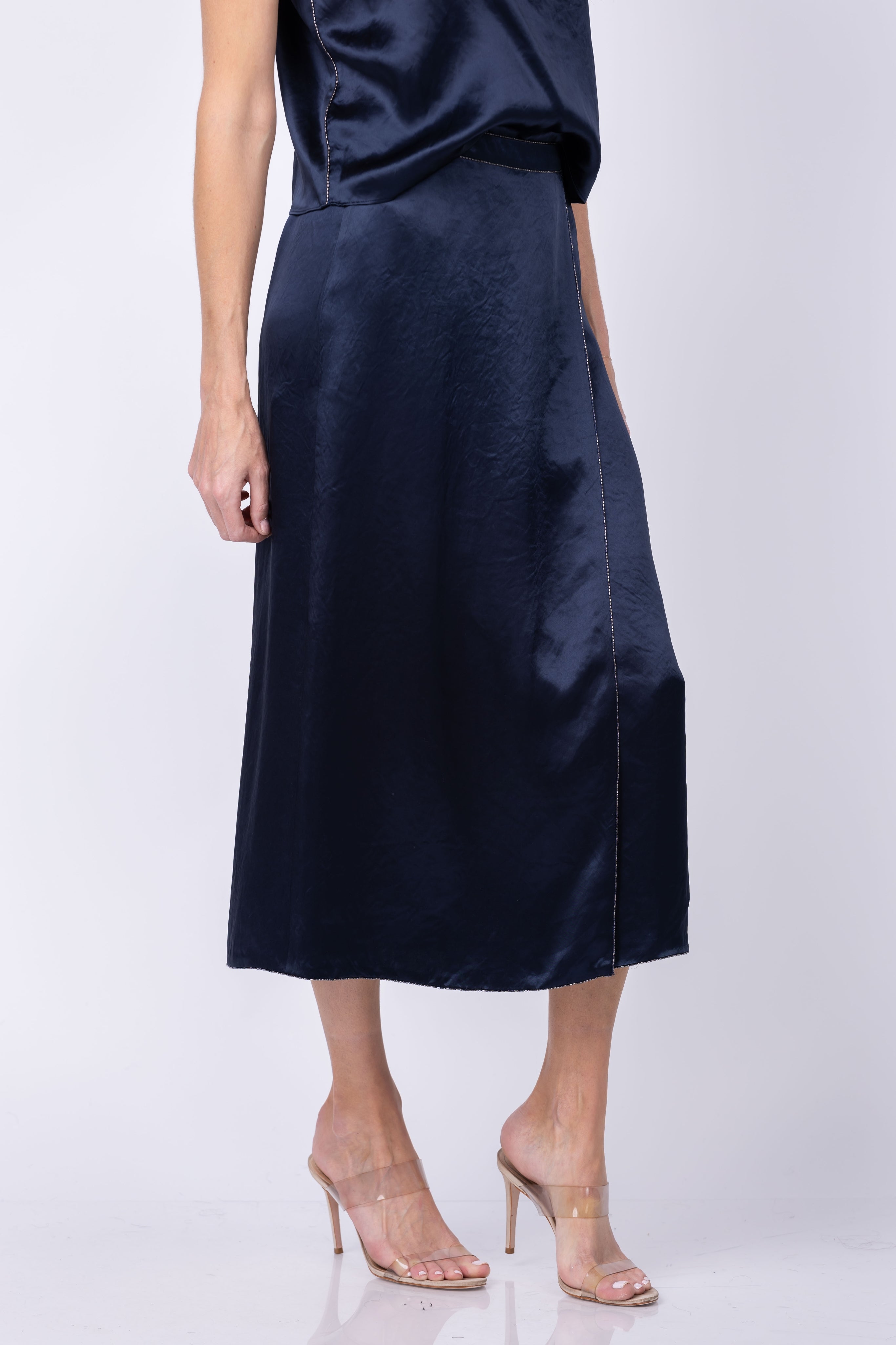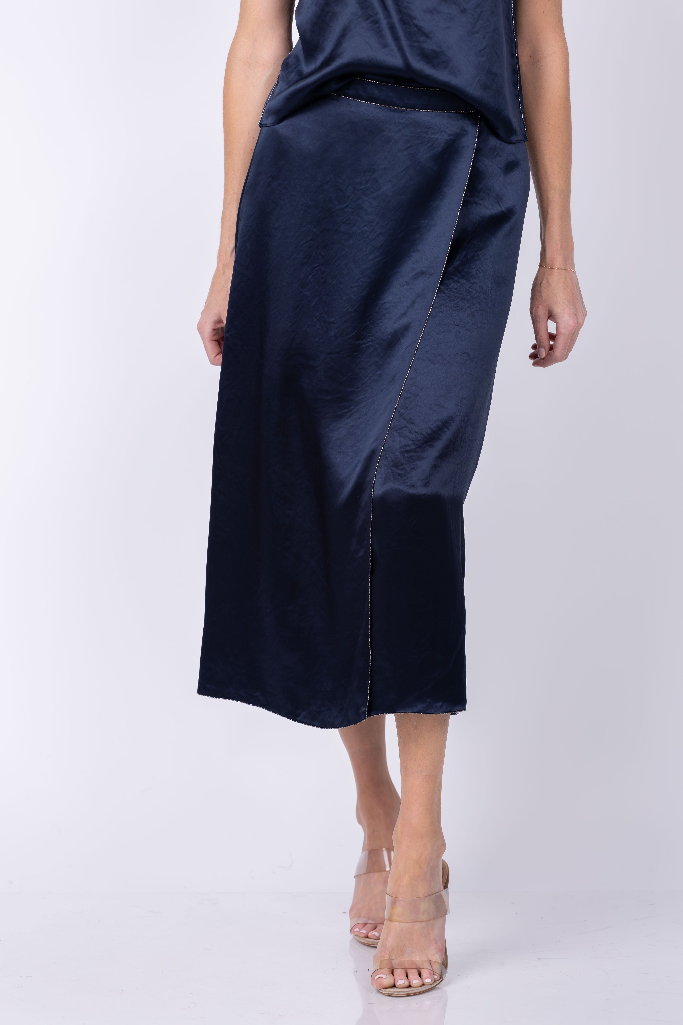 Transform your outfit into a statement with our Vince Beaded Boarder Front Slit Skirt. The delicate metal beads add a touch of shine for a dressier occasion, making you stand out with confidence. Complete the look with our Beaded-Border Satin Camisole. Elevate your style in our Japanese satin skirt!