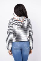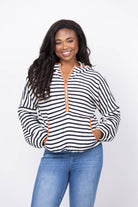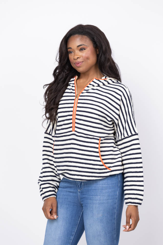 Stay protected in style with the Trovata Andi Windbreaker in Navy Stripe. This classic pull-over design features a water-resistant exterior and convenient half-zip front with matching hood to shield you from unexpected weather. The striking navy stripe pattern is enhanced with eye-catching red trim along the hood and pockets, while the soft terry cotton construction ensures comfort all day long. Perfect for unpredictable weather without sacrificing your fashion sense.