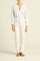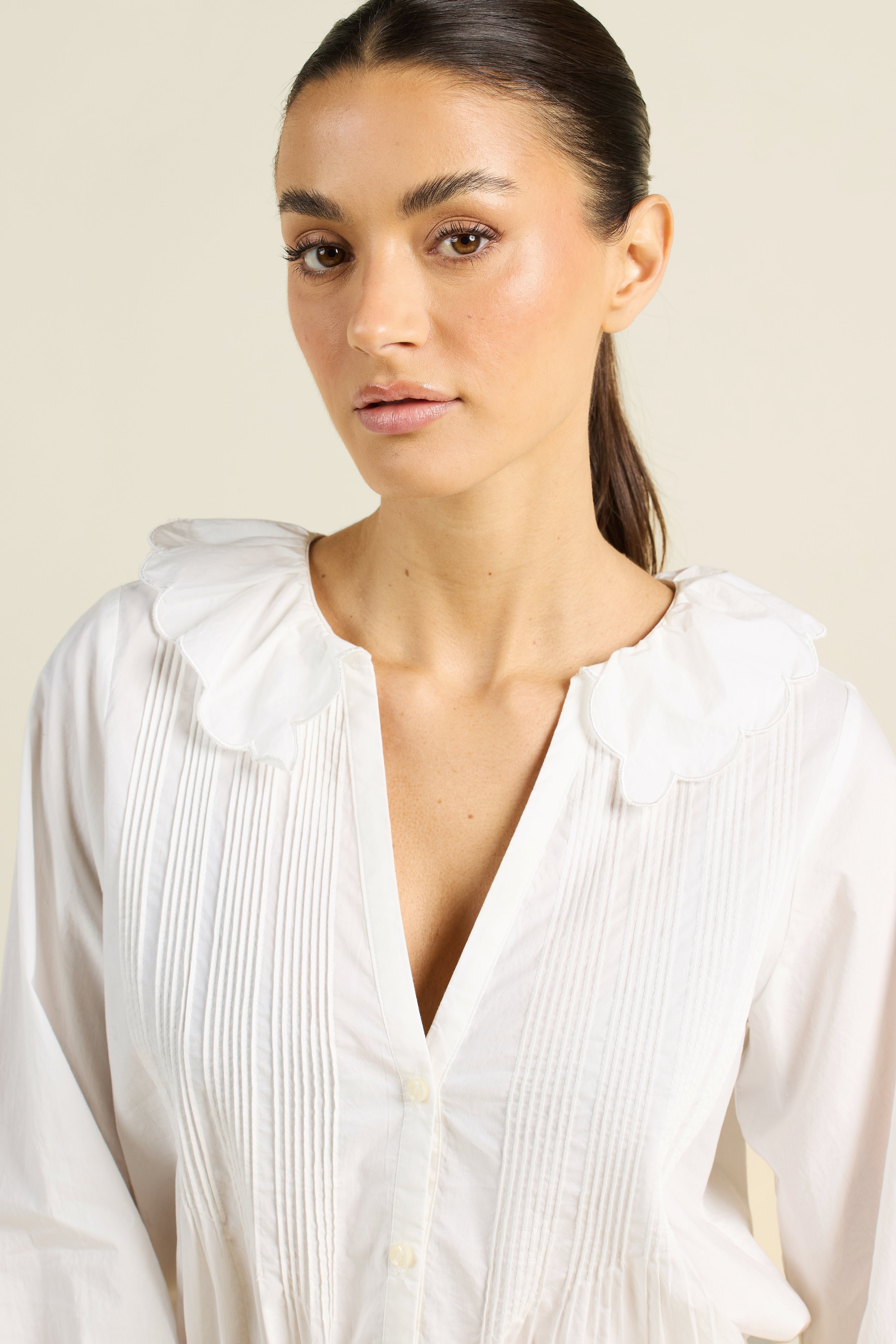 Elevate your wardrobe with the Trovata Francine Blouse in crisp White. This exceptional piece showcases elegant cascading pintucks front and back, creating a flattering silhouette that draws the eye. The sophisticated v-neckline and decorative wide collar frame your face beautifully, while delicate scallop embroidery edge finishing demonstrates exquisite craftsmanship. Crafted from luxuriously soft cotton poplin with thoughtful elastic wrists for adjustable comfort, this versatile blouse effortlessly transitions from professional settings to special occasions. An irresistible investment piece you'll reach for again and again.
