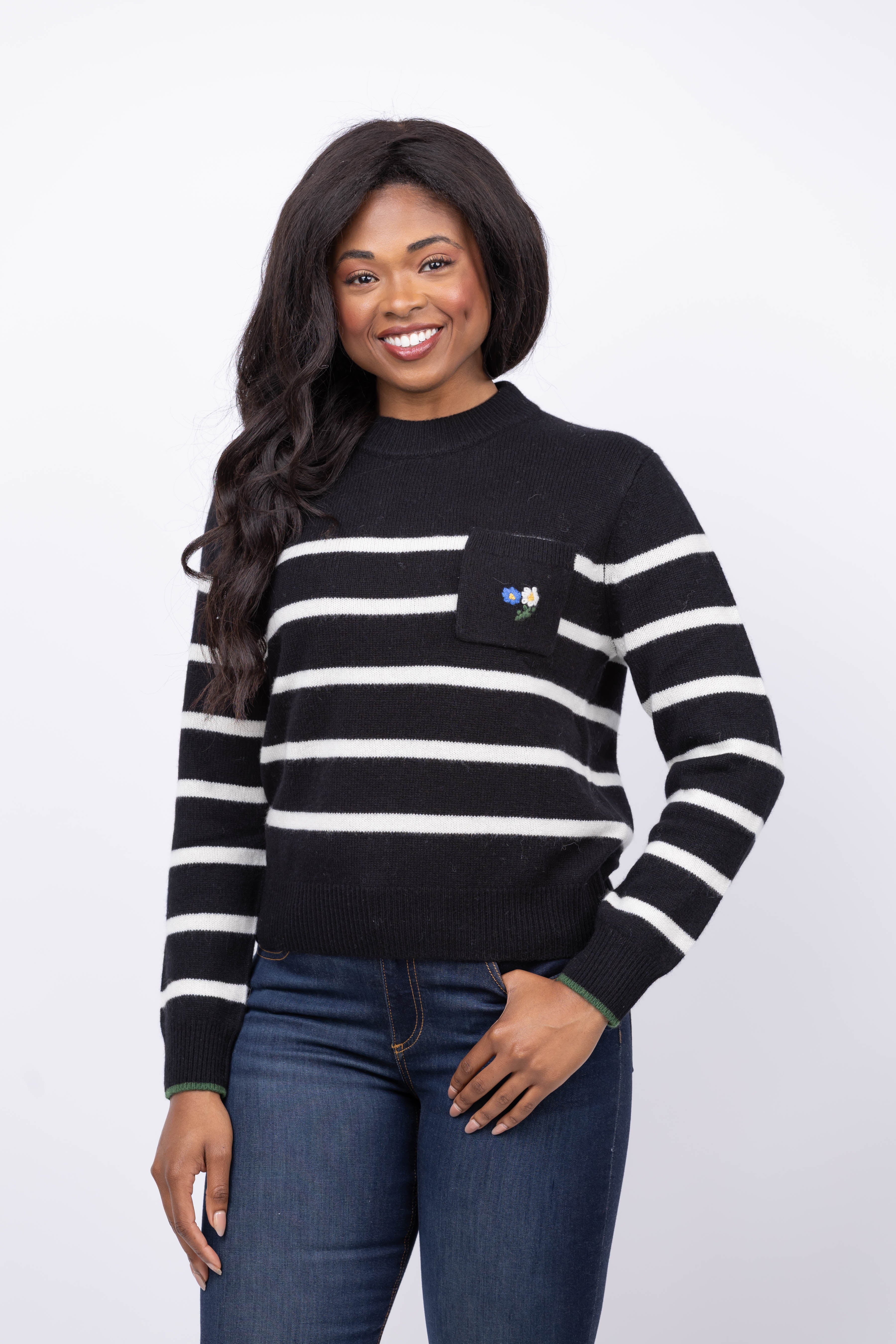 The Trovata Oksana Sweater in Black Stripe channels vintage ski style with a modern touch. Crafted from soft 100% cashmere, it features a cozy low mock neck and a practical chest patch pocket. This sweater combines warmth and timeless design for a refined, comfortable look.