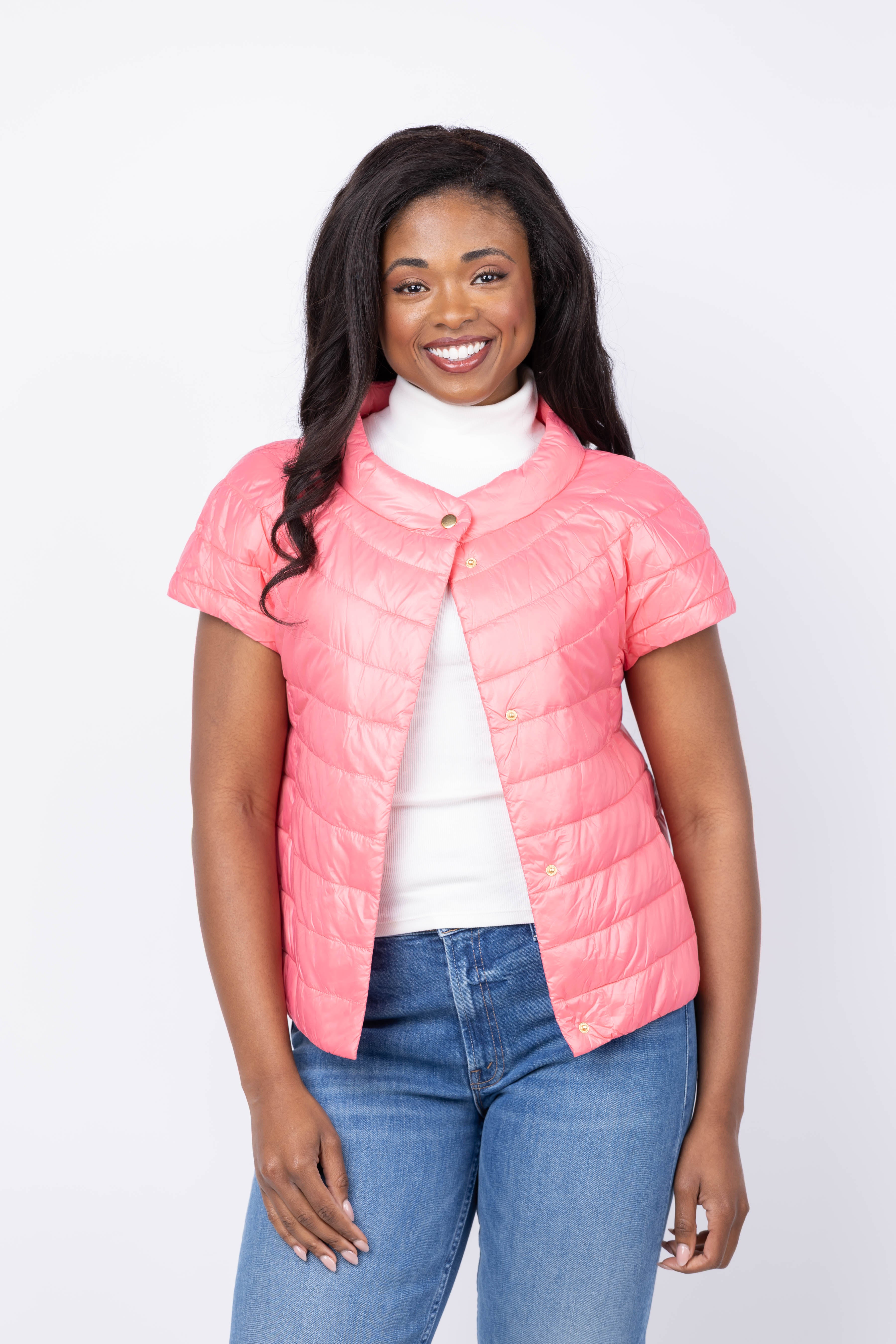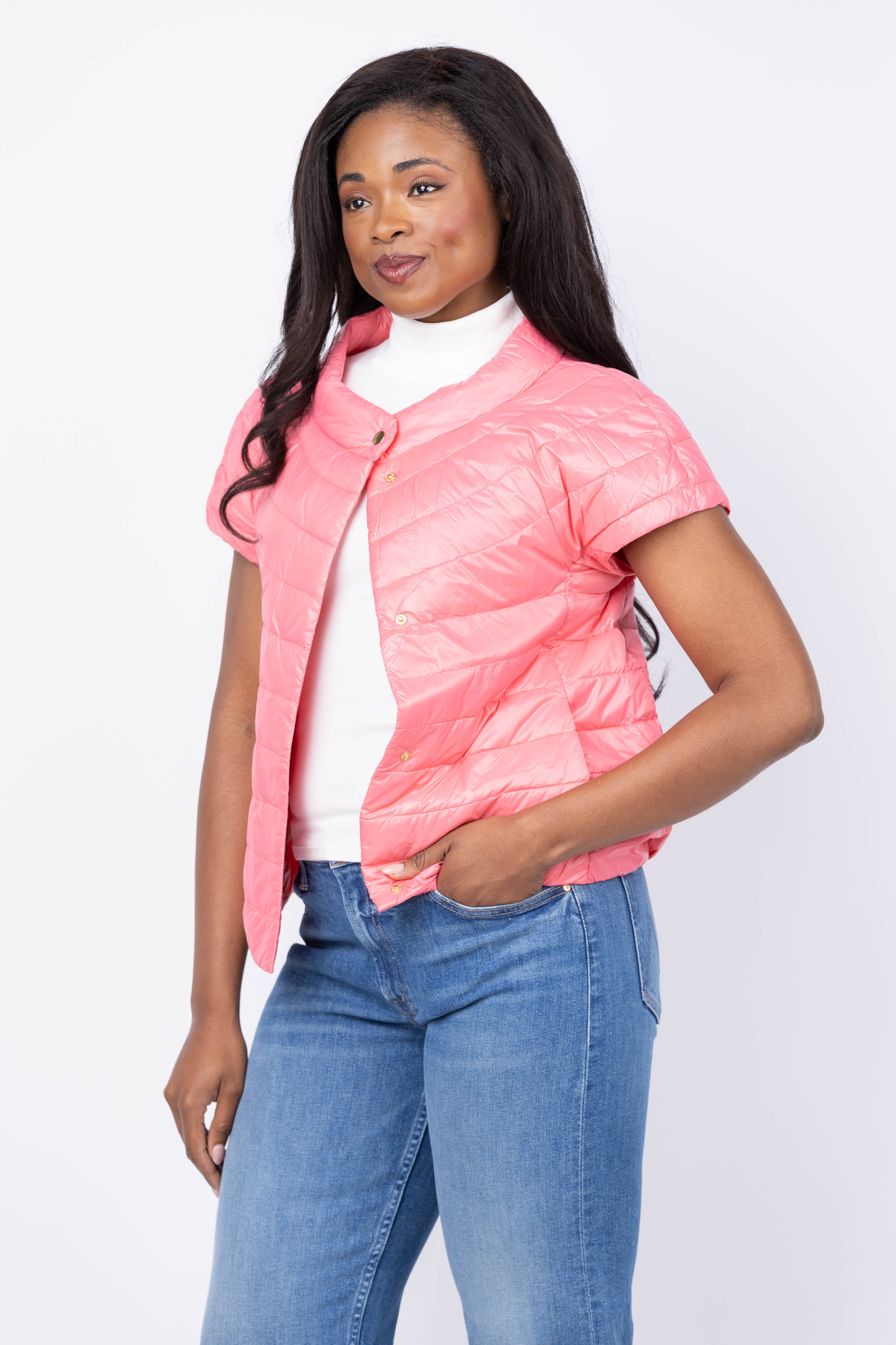 Add warmth and dimension to your layering game with the Tyler Boe Shelly Cap Vest in Sun Kissed Coral. This stunning piece features a flattering silhouette with cap sleeves that frame the shoulders beautifully, while the radiant coral hue brings instant energy to any outfit. Layer it over your favorite tees and blouses for a polished look, or wear it as a standalone statement piece. The Shelly vest combines contemporary design with timeless appeal, making it an essential addition for anyone seeking to refresh their wardrobe with color and confidence. Embrace a versatile layer that works as hard as you do.