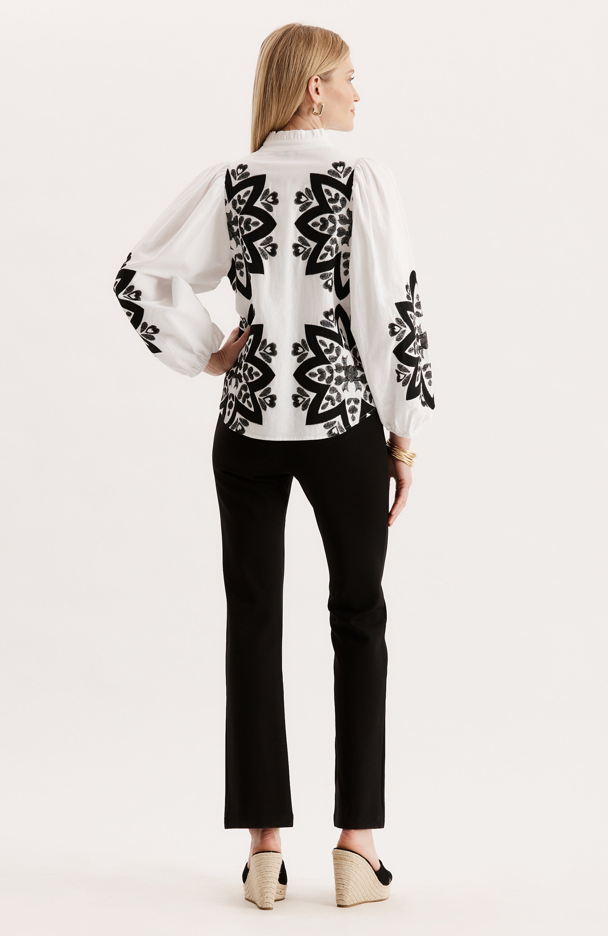 Elevate your wardrobe with the Tyler Boe Valerie Top in Black. This beautifully embroidered blouse features a chic mandarin ruffle collar and hidden front buttons for a sleek, refined look. The puff bracelet-length sleeves add a soft, feminine touch, while the striking black embroidery brings bold artistry to your outfit. Made from 100% cotton, it ensures comfort and breathability, making it perfect for both casual and dressy occasions. Experience timeless elegance with a modern edge in this versatile, must-have top.