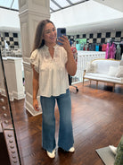 Elevate your wardrobe with the Ulla Johnson Jolie Flutter Sleeve Top in Pristine. Featuring delicate ruffle sleeves and a flattering v-neckline, this top embodies effortless femininity and grace. Its light, airy design makes it perfect for both casual outings and special occasions, adding a touch of elegance to any look.