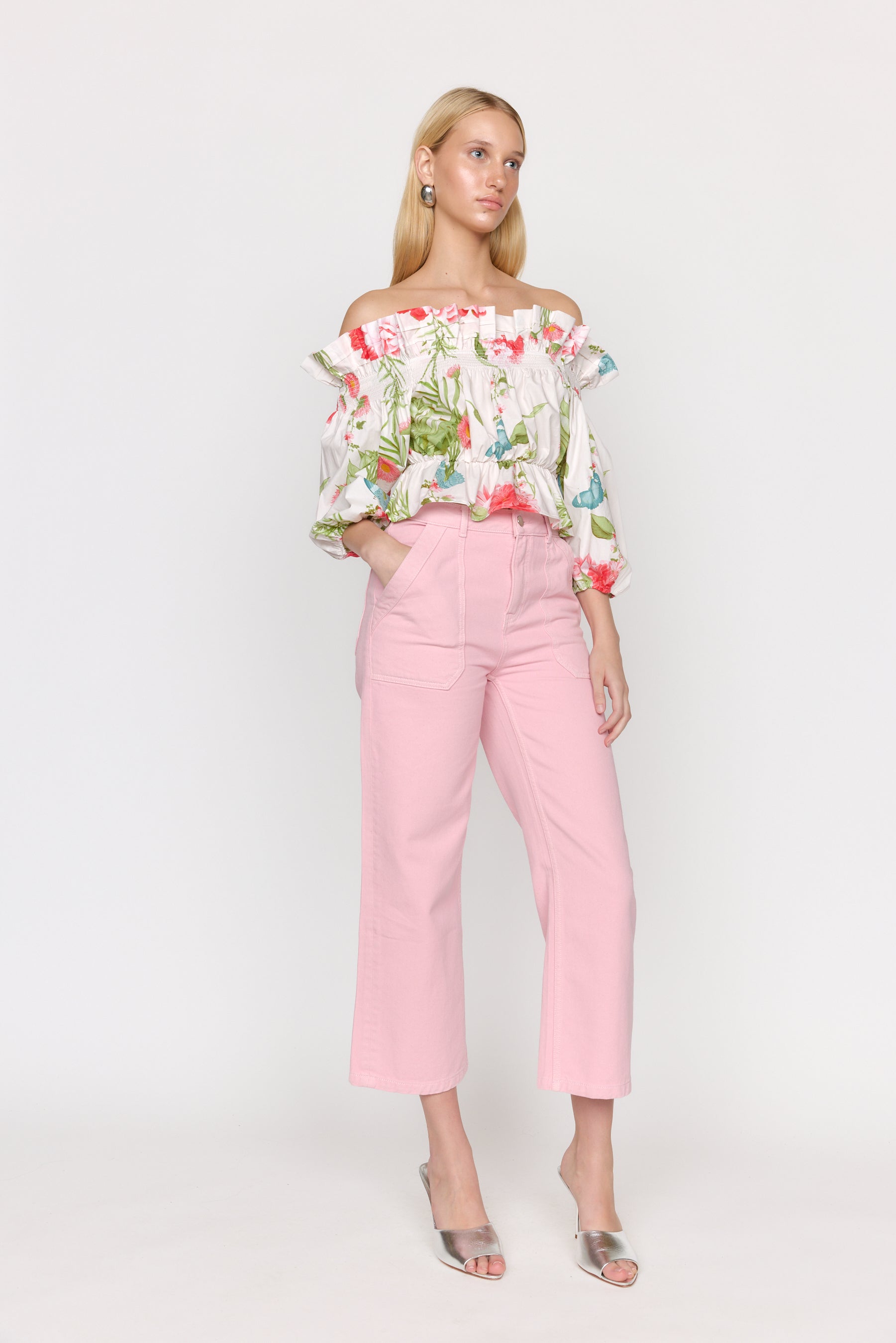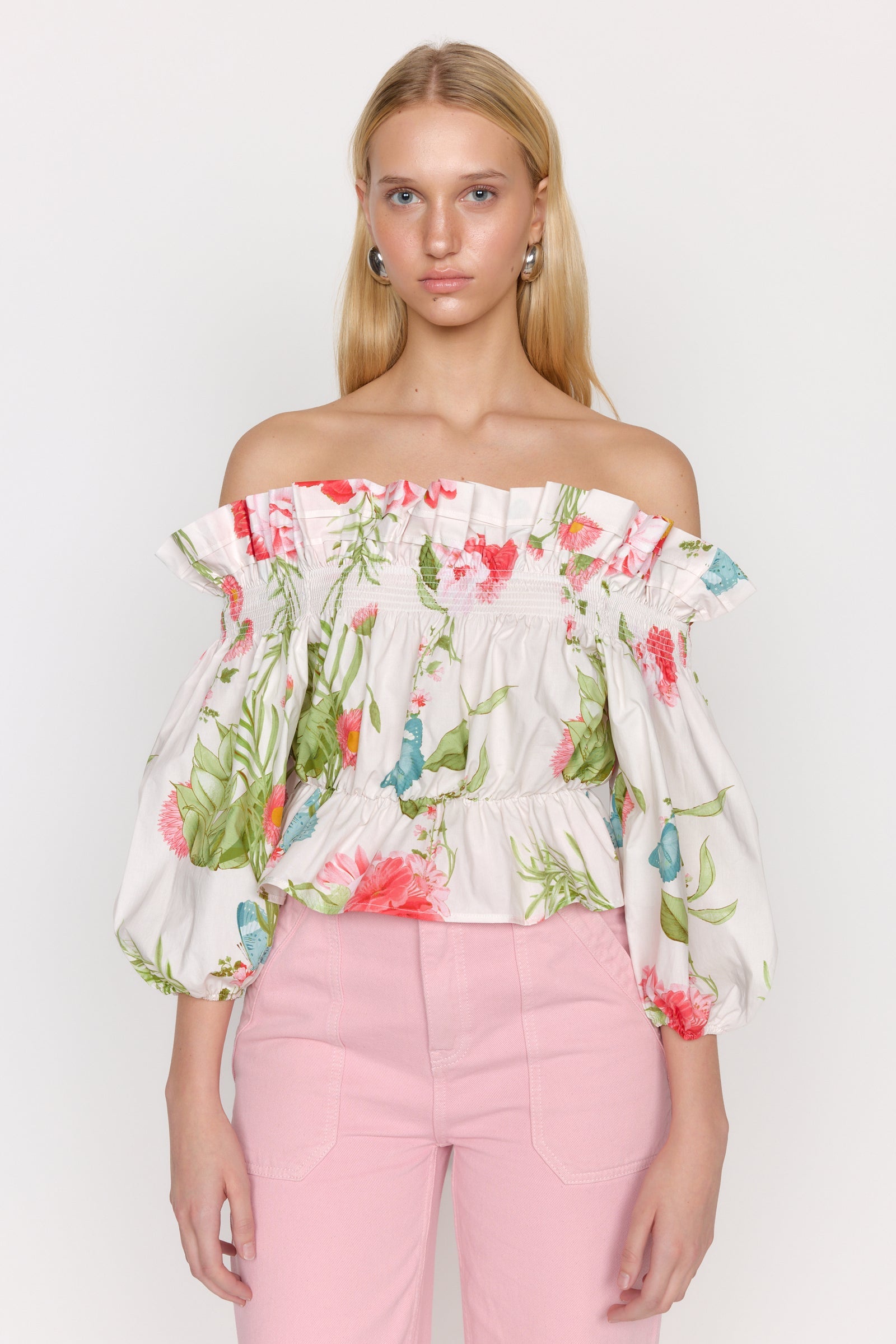 The Christy Lynn Delphi Top in Monarch Ivory blends romantic charm with playful style in a flattering off-the-shoulder design. Its lightweight, crisp fabric features delicate ruffles along the neckline and waist, complemented by elasticized sleeve cuffs for a comfortable fit. The subtle yet vibrant floral print adds a splash of color, making this top an ideal choice for sunny days and casual outings. Elevate your wardrobe with this youthful, elegant piece that effortlessly combines comfort and style.