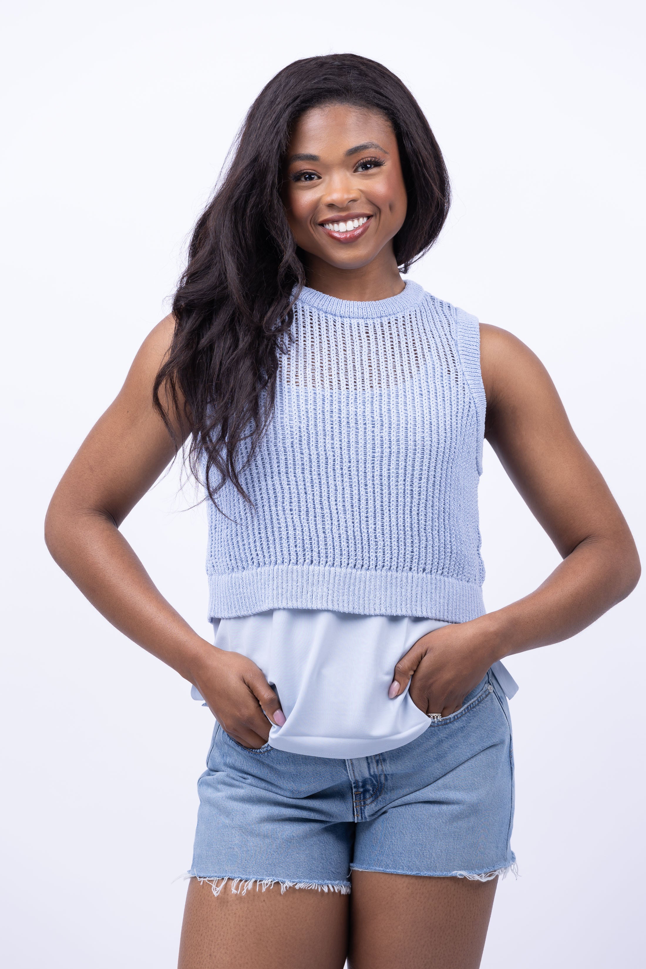 Elevate your weekend style with our Design History Sleeveless Sweater Vest Top in Mix Sky. This light blue sleeveless sweater is the perfect piece for a casual Saturday outfit when paired with white jeans and sneakers. Comfort and style all in one, perfect for any occasion!