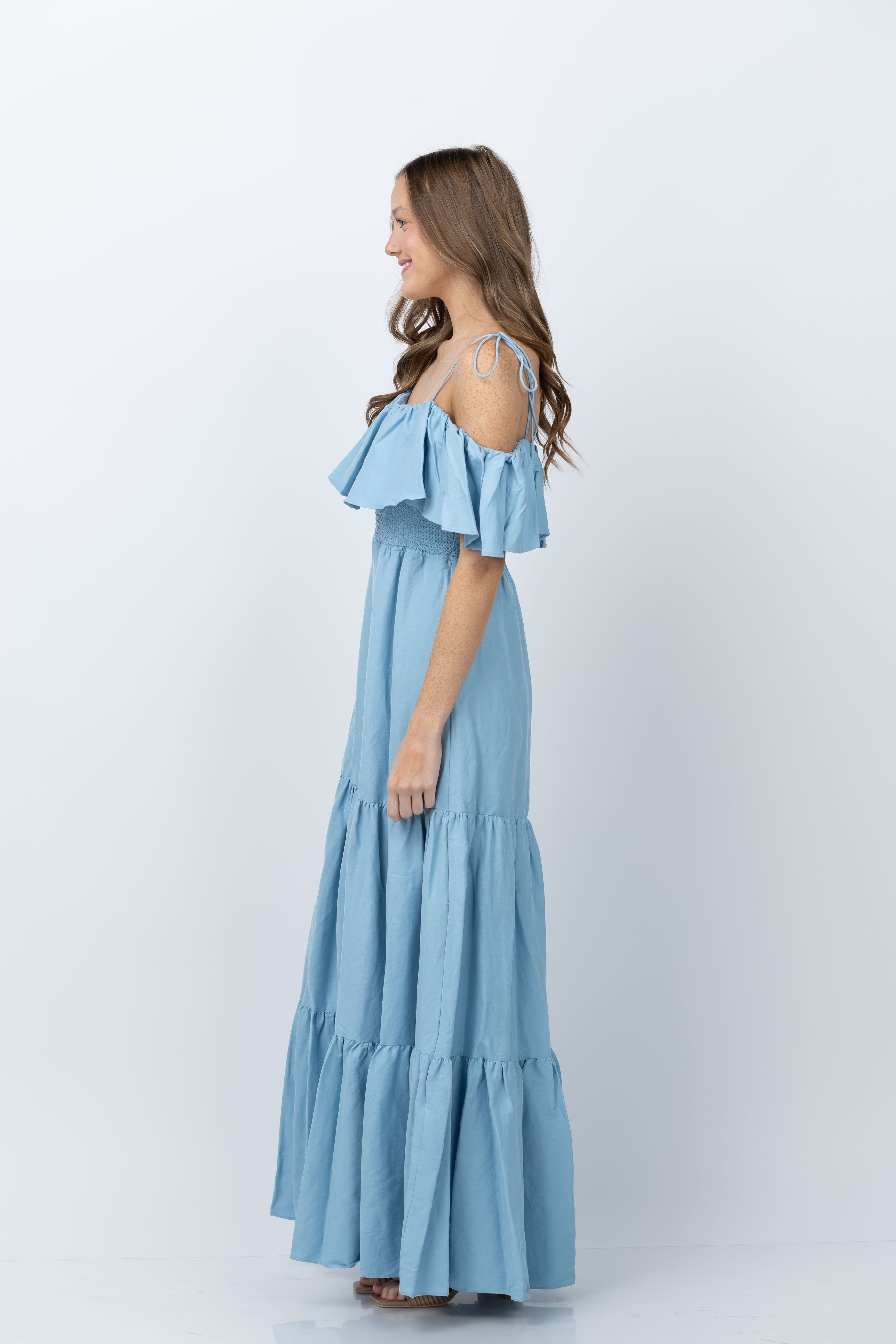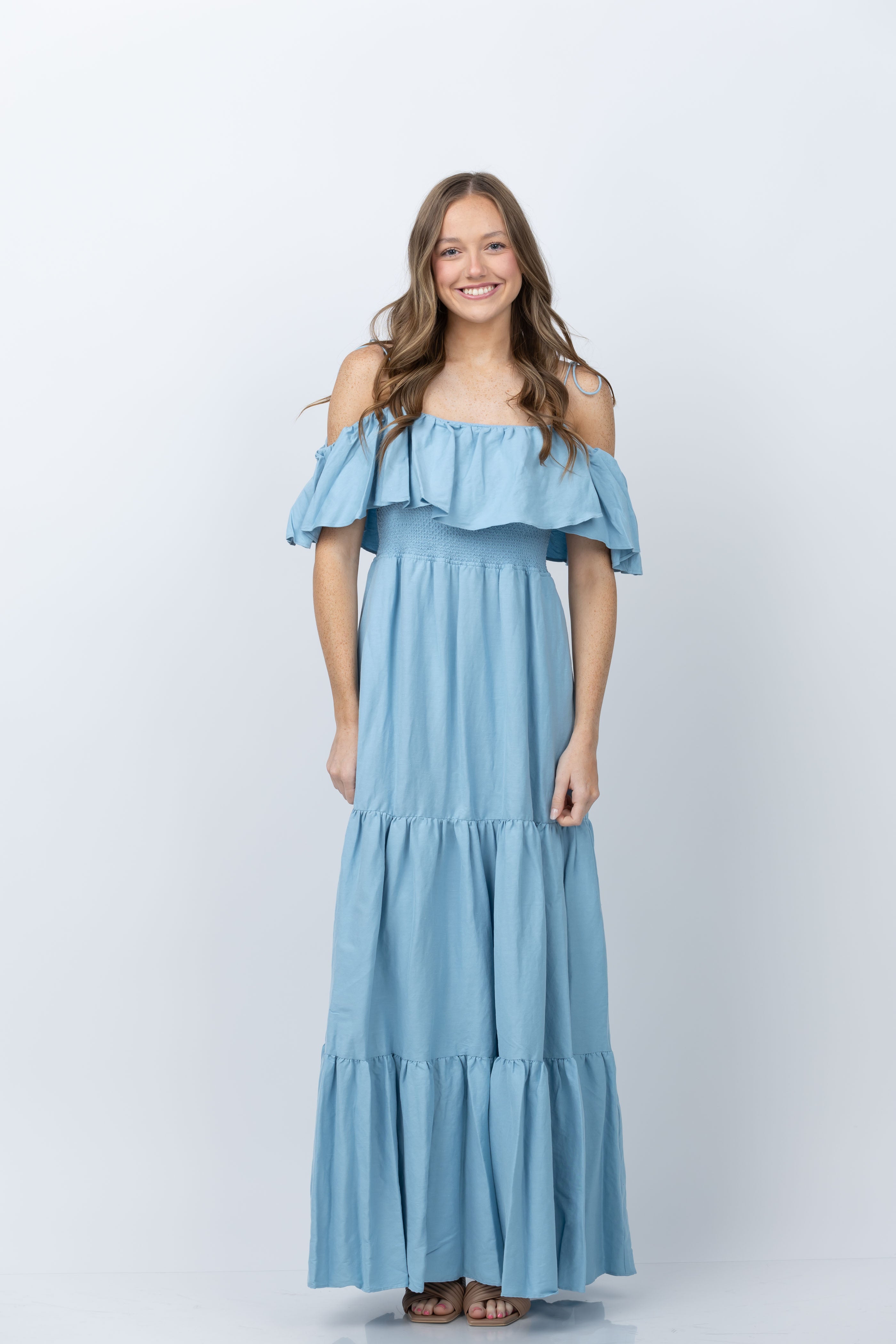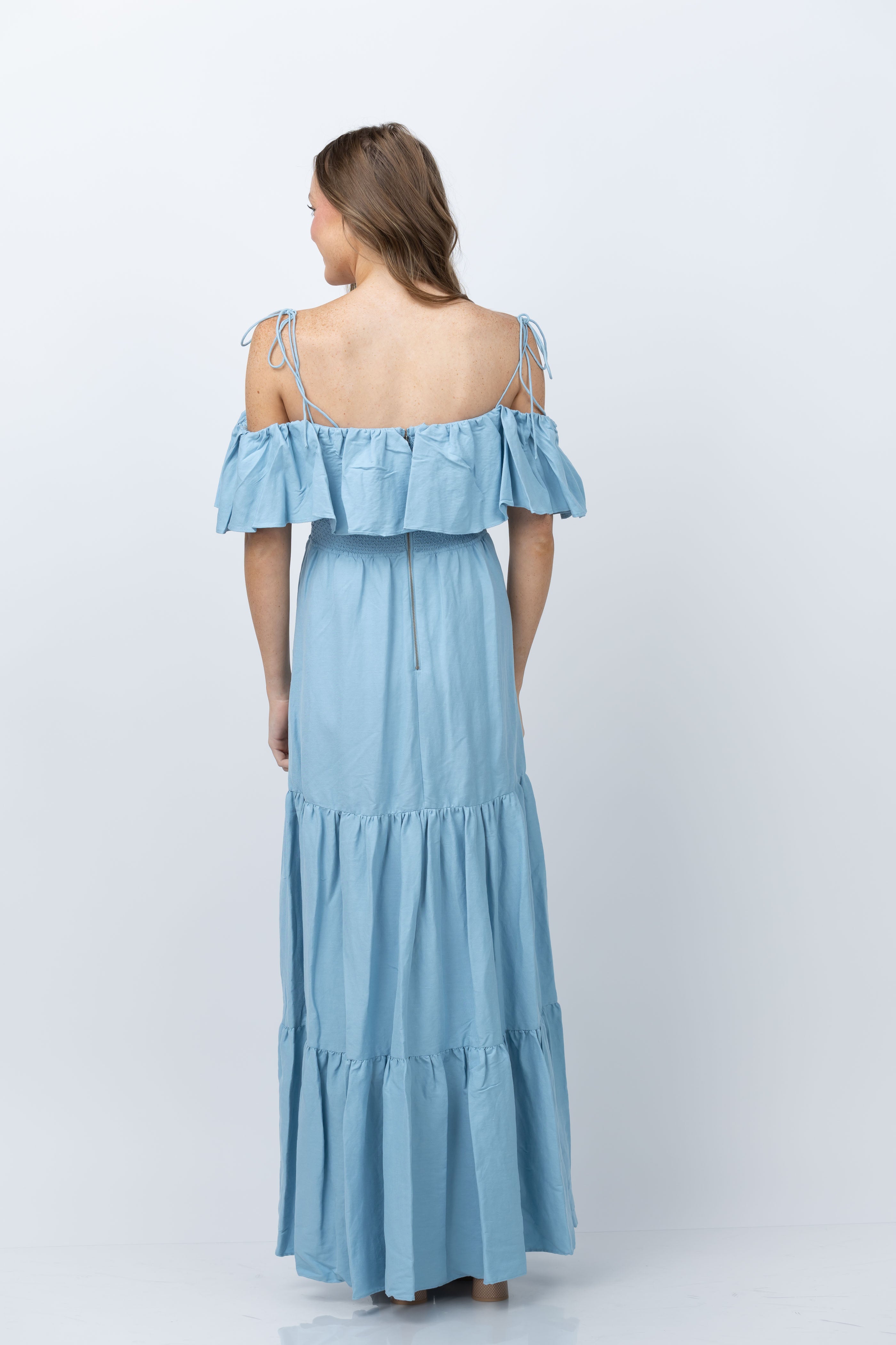 Alice + Olivia Kia Off the Shoulder Tiered Maxi Dress in Mineral Blue