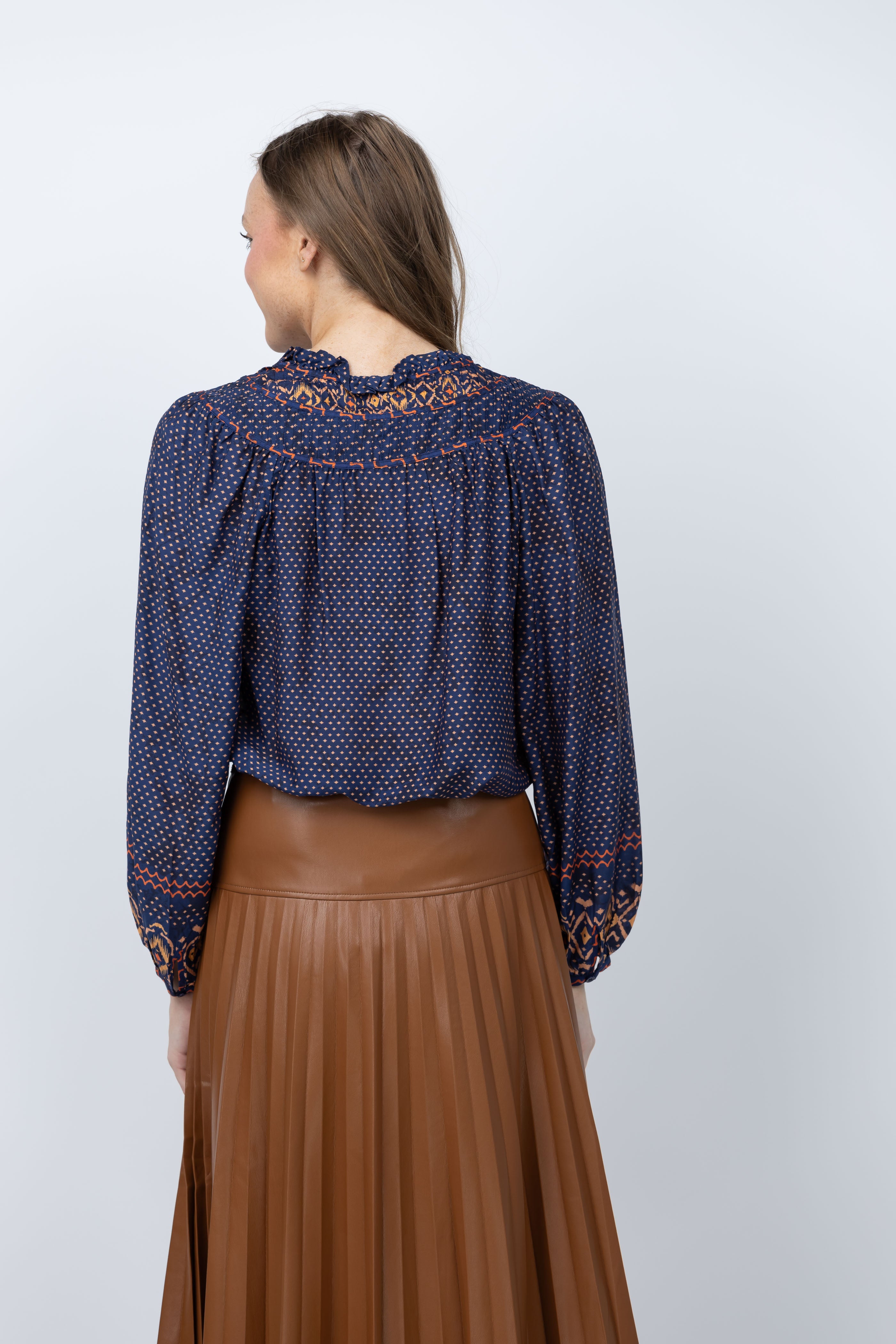 Discover the perfect blend of style and comfort with the Caballero Solange Blouse in Indigo Batik. The shirred collar and yoke detail add a touch of sophistication, while the elastic cuffs and luxurious viscose-silk blend make it versatile for any occasion. Elevate your wardrobe with the captivating mix of blues and pops of orange in the Indigo Batik print.