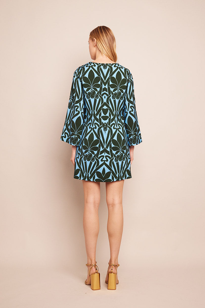 The Cara Cara Saffron Dress in Gossamer Blue features a flattering crewneck and elegant bell sleeves for a stylish silhouette. With a center back zipper and bust darts, it offers a tailored fit that gently defines the waist. This unlined, step-into dress showcases a beautiful placed print, making it a perfect choice for effortless sophistication.