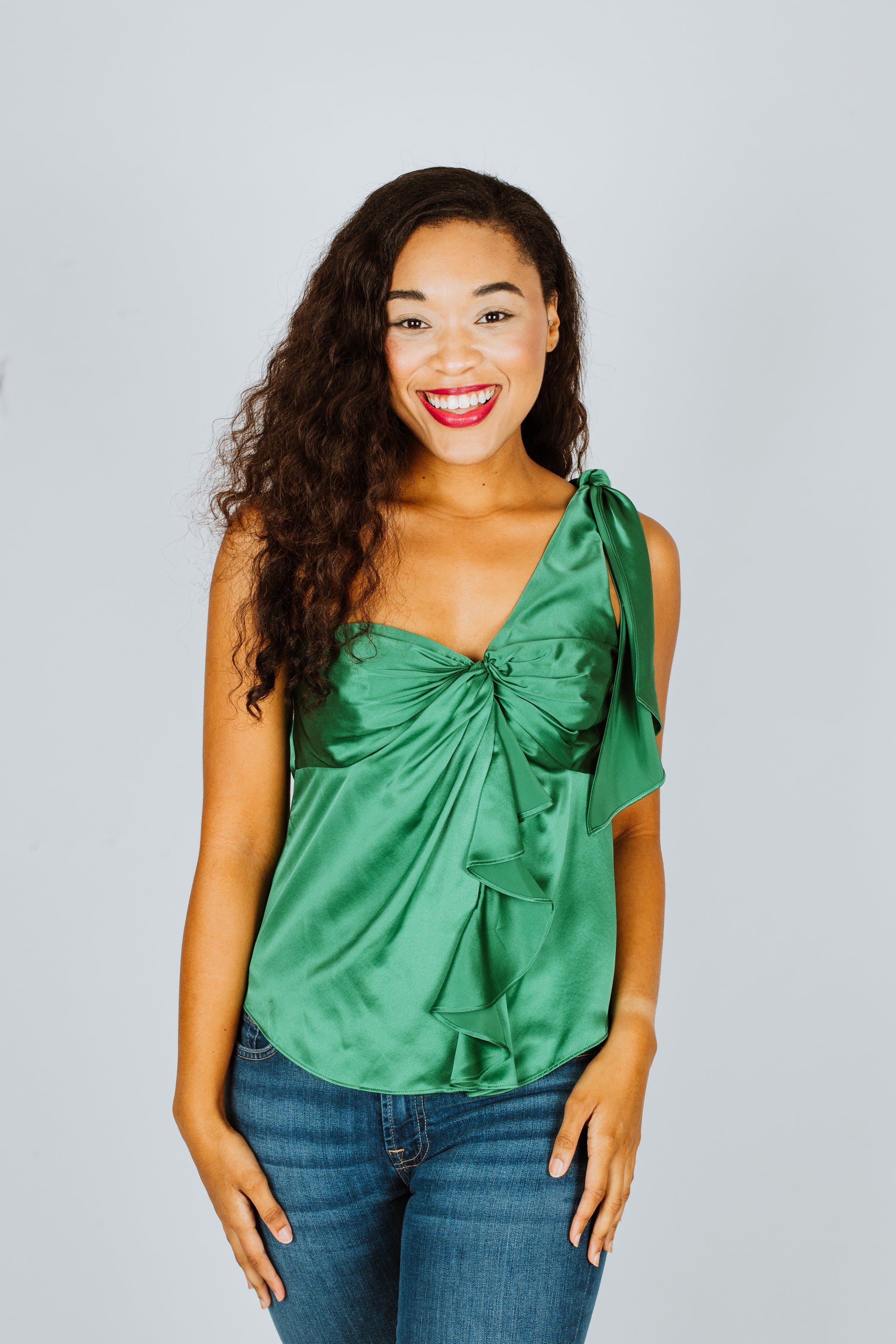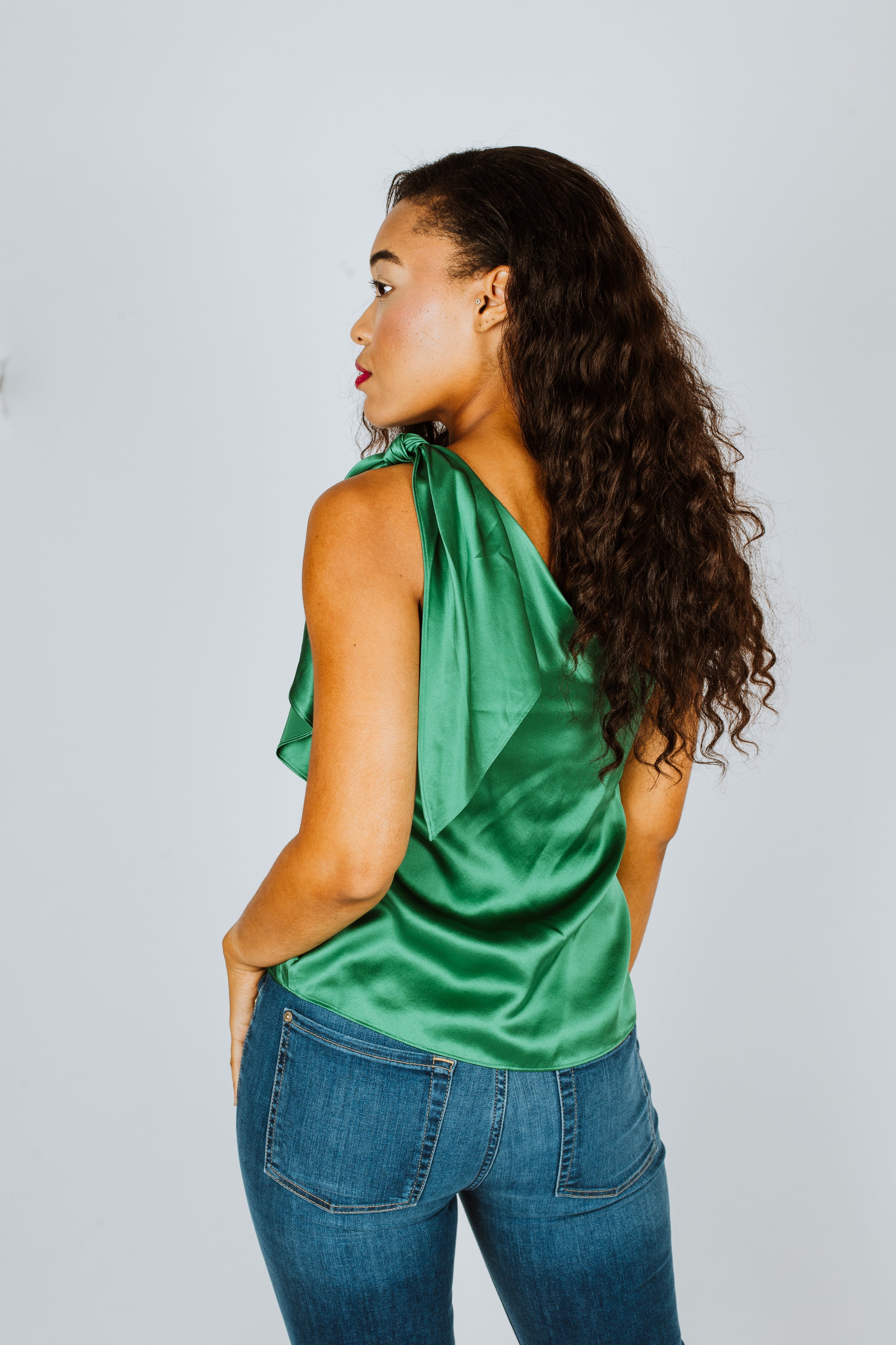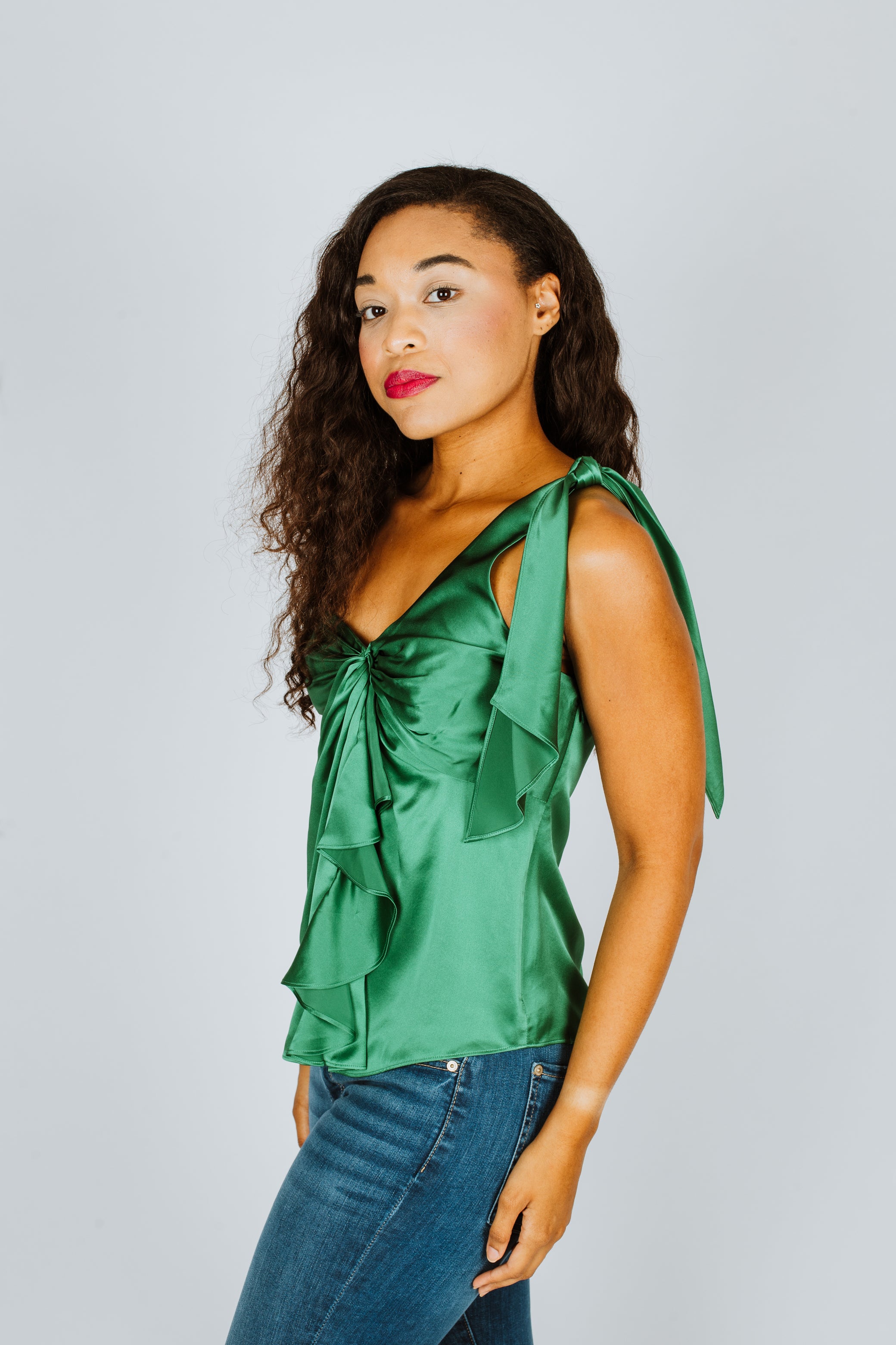 Silk top with asymmetrical strap featuring a sweetheart neckline and a cascading ruffle detail along the front.
