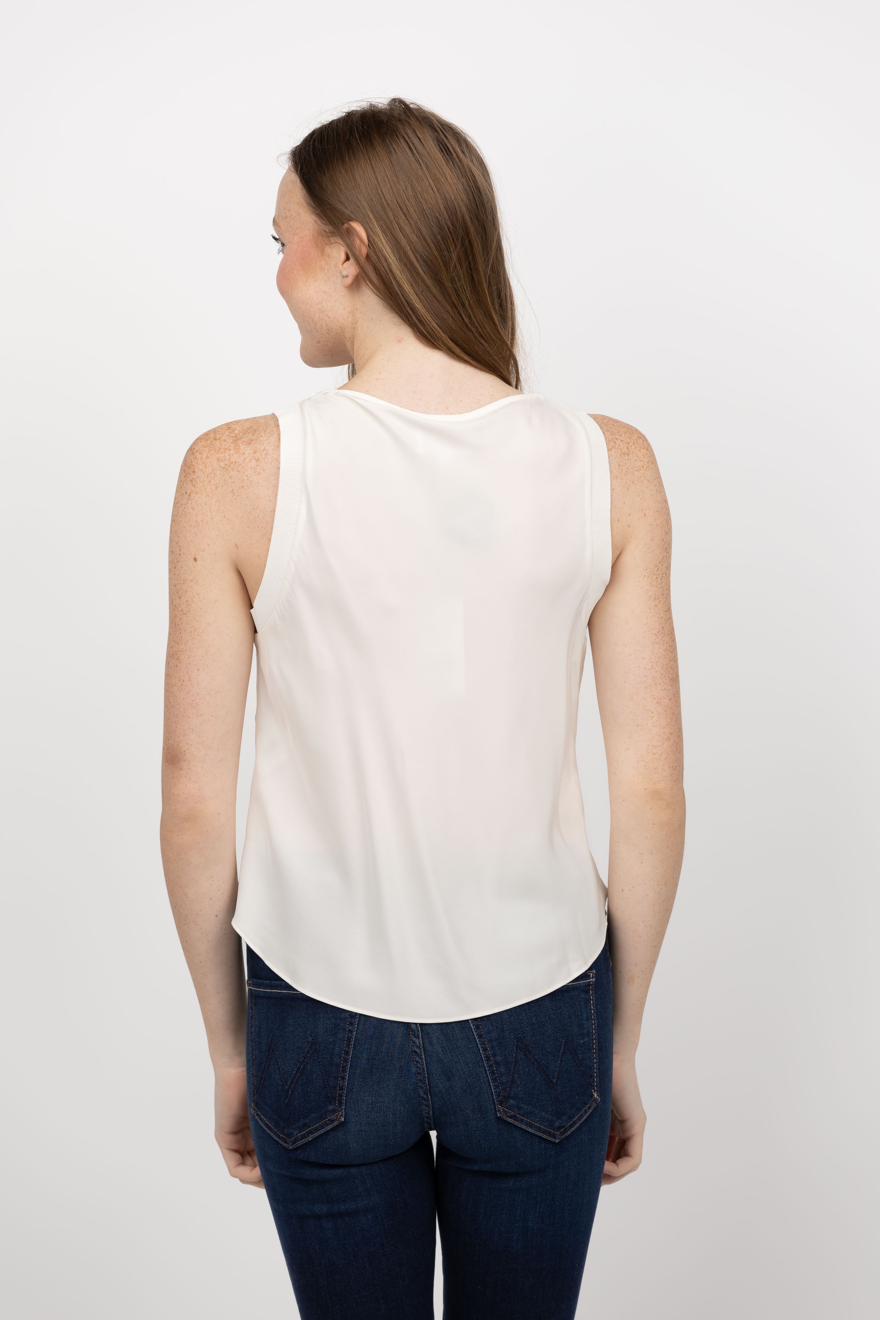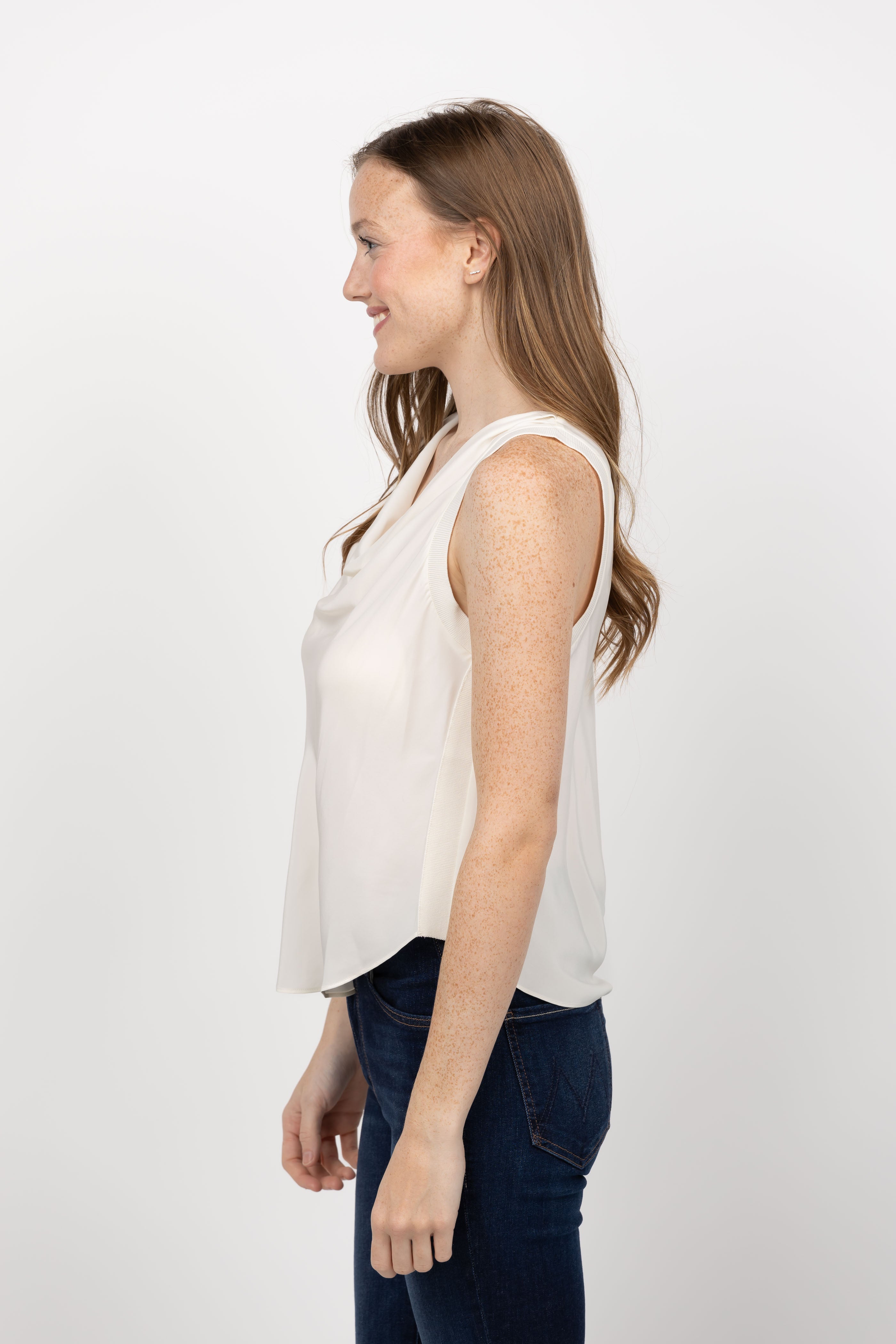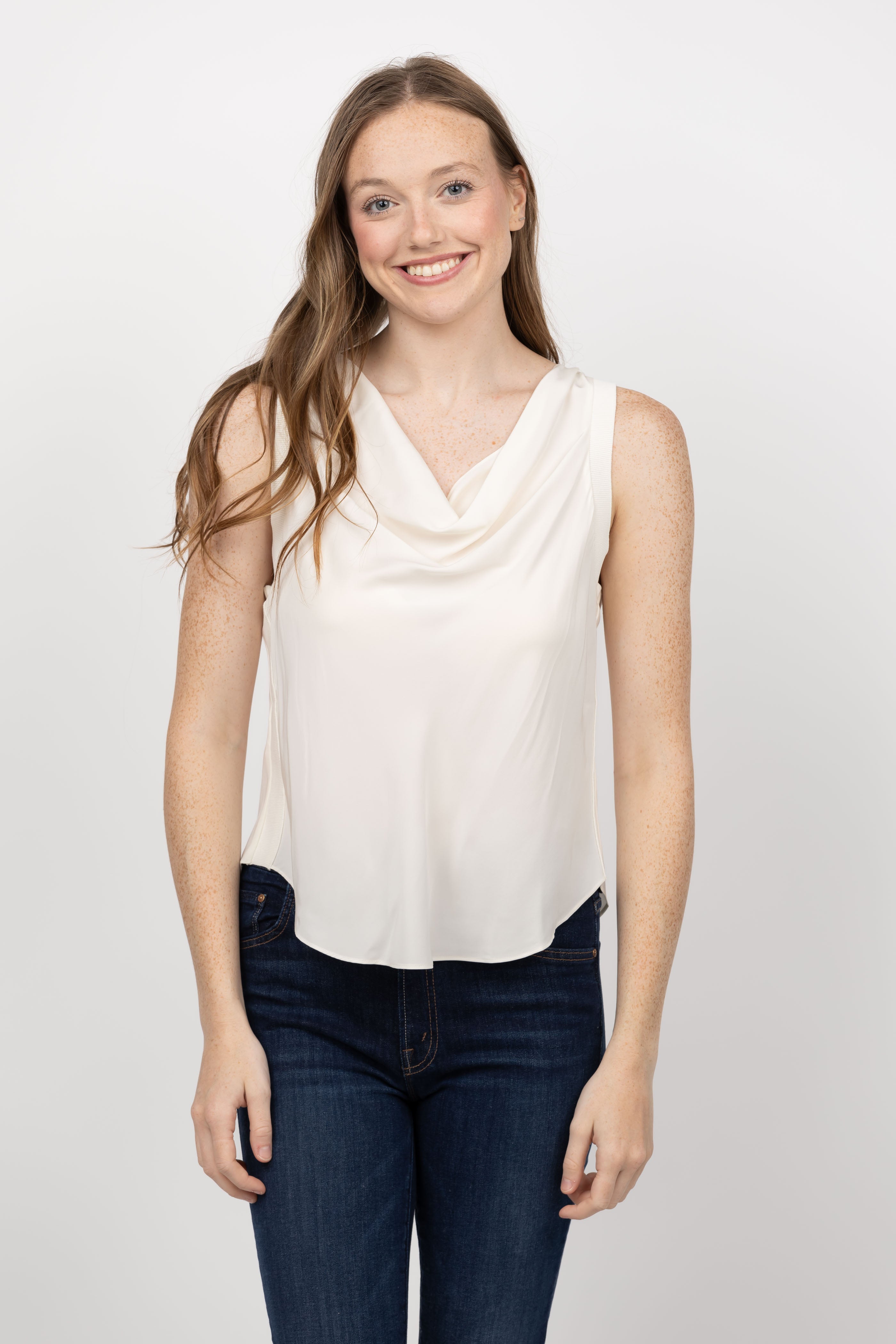 Indulge in the luxury of the Cinq a Sept Olsen Top in Ivory. The smooth silk material highlights the elegant cowl neck of this sleeveless top. Versatile and chic, wear it alone or layer it under a blazer for a sophisticated look. Elevate your wardrobe with this must-have piece!