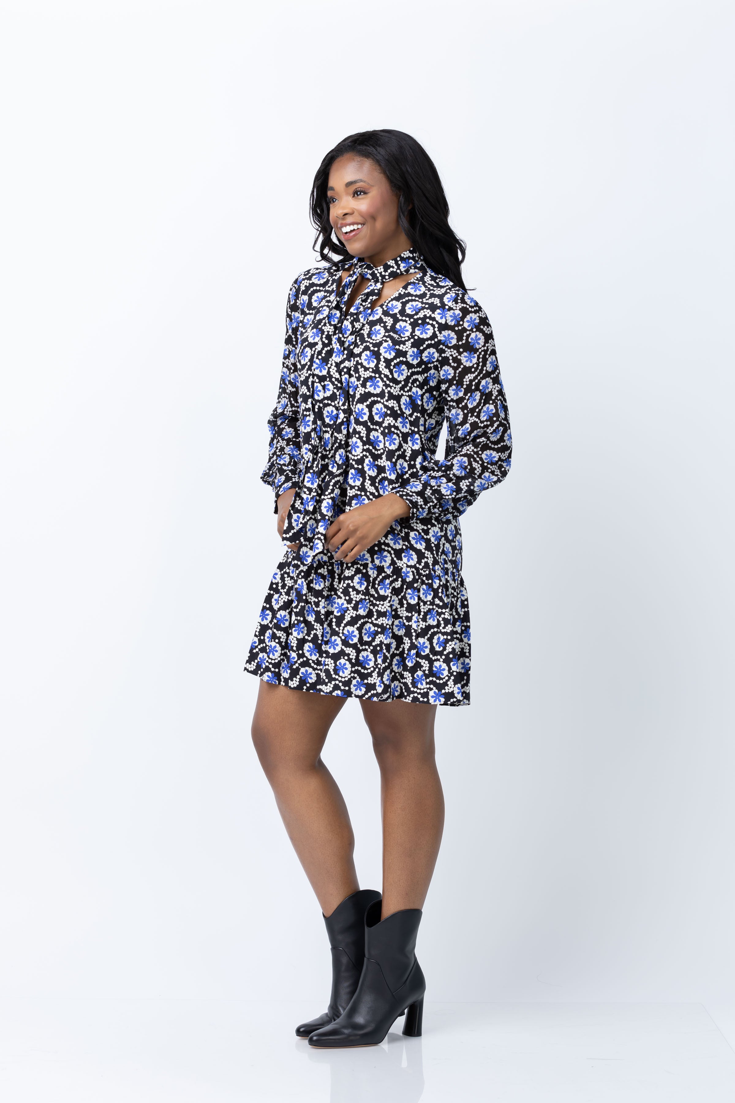 Elevate your style with the Diane Von Furstenberg Ami Dress in Pirouette Blue. This flowy dress features a stylish mock neck tie belt, adding a touch of sophistication to any look. Complete the ensemble with tall black boots for a chic and powerful statement.