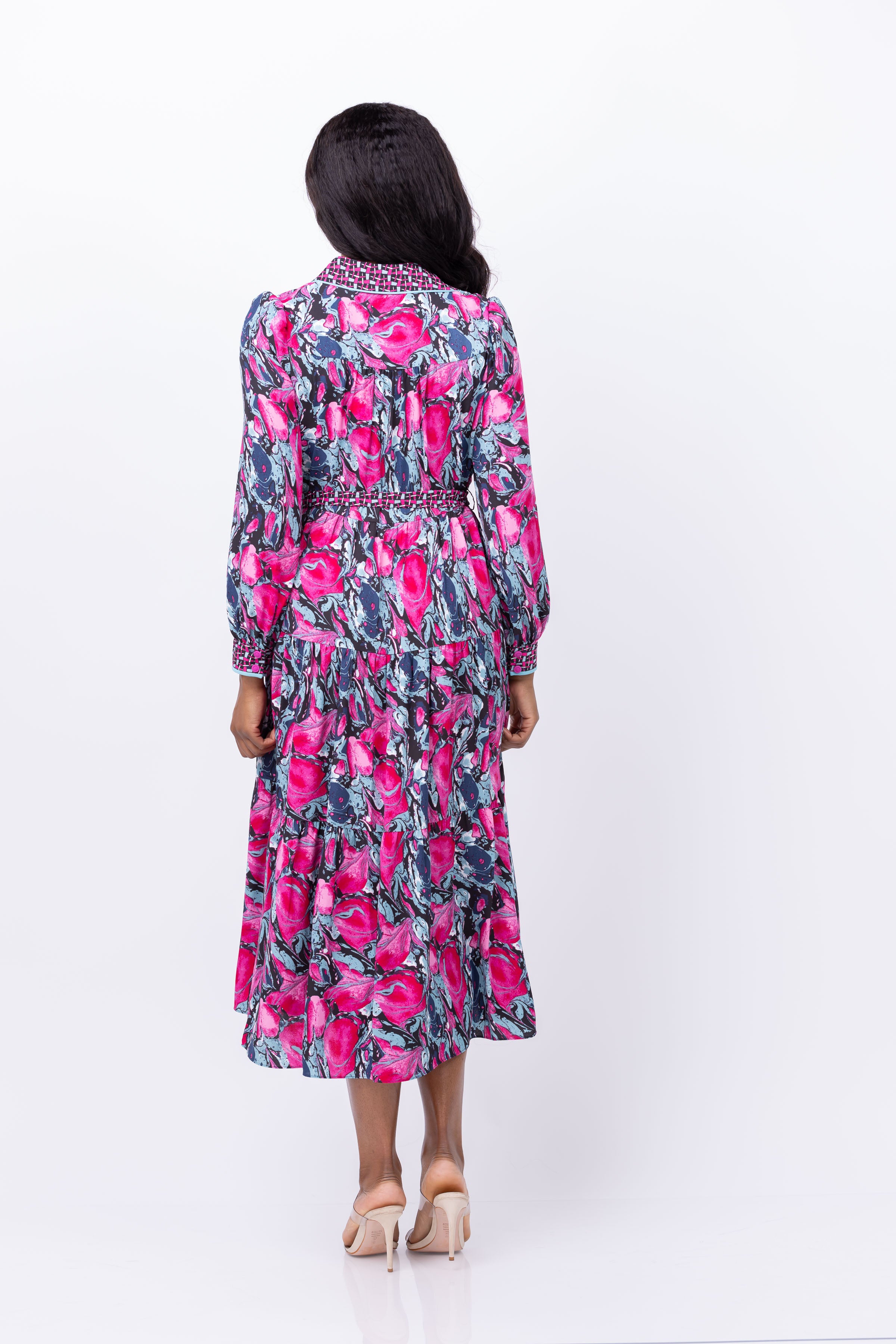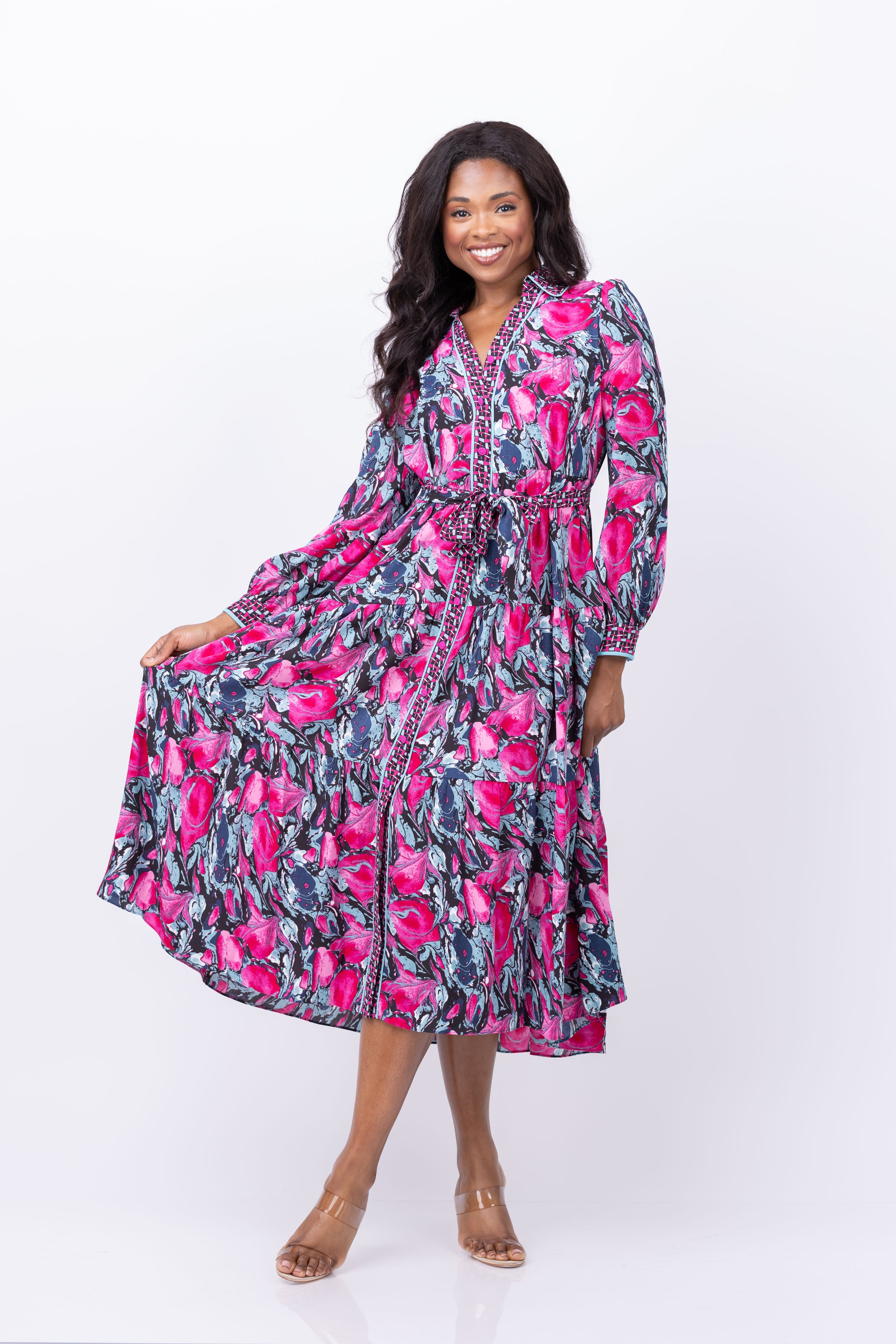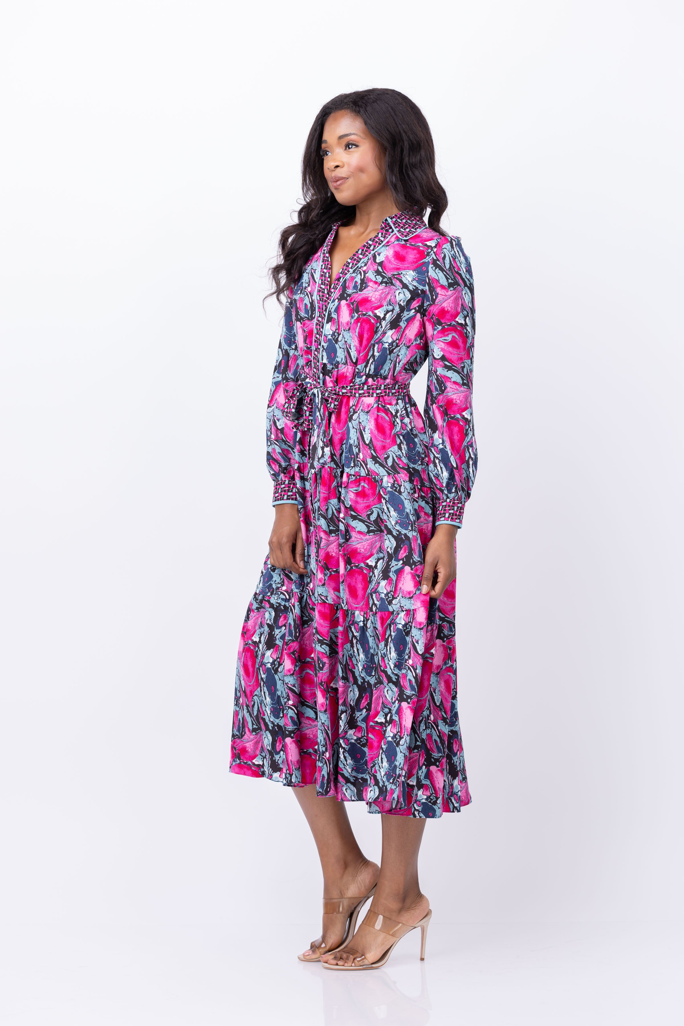 Elevate your style with the DVF Alea Dress! This midi dress boasts vibrant flowers and a contrasting print, making it a statement piece. With long sleeves, it's perfect for any season and can be dressed up or down with boots or heels. Make a bold, vivacious statement with this dress!