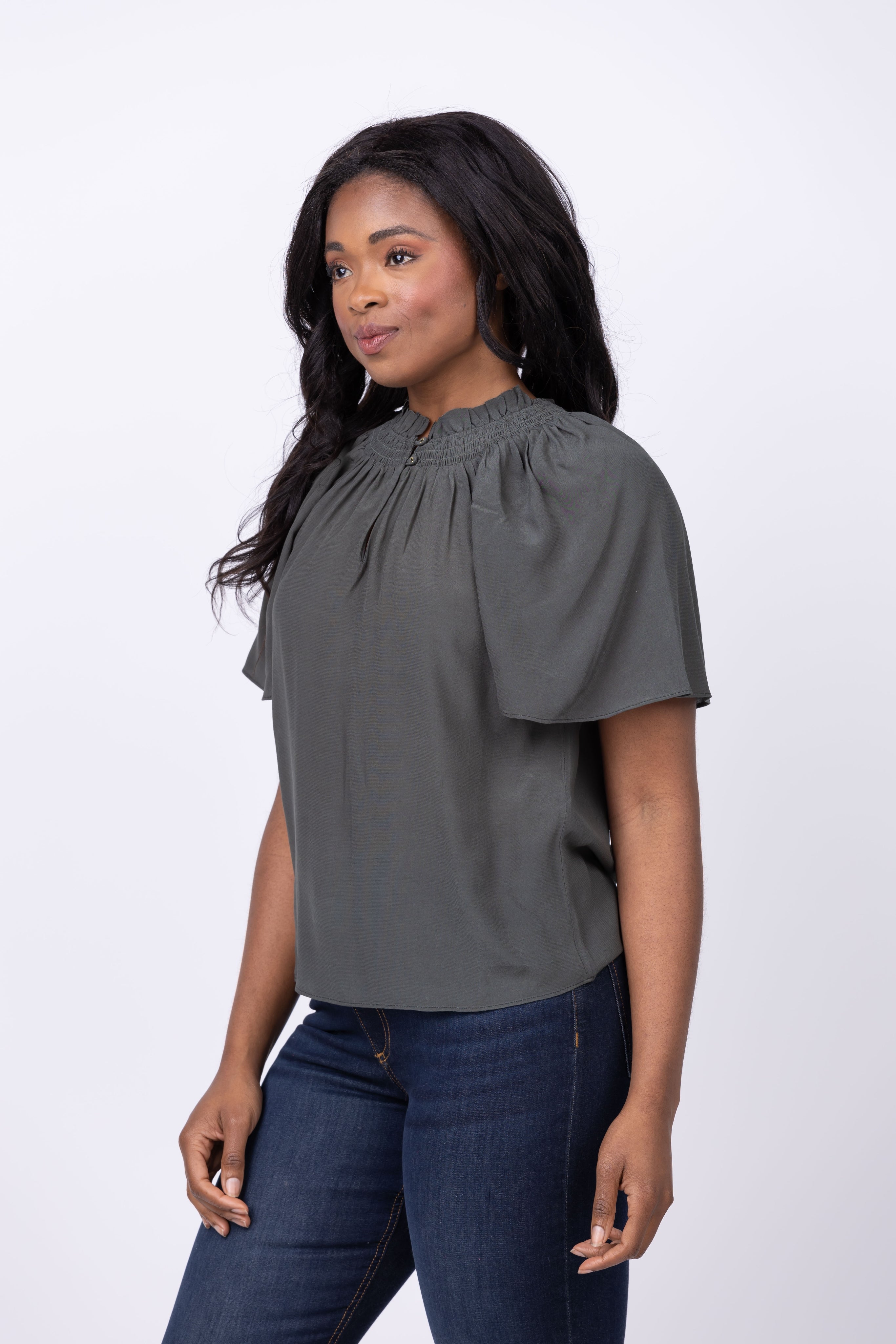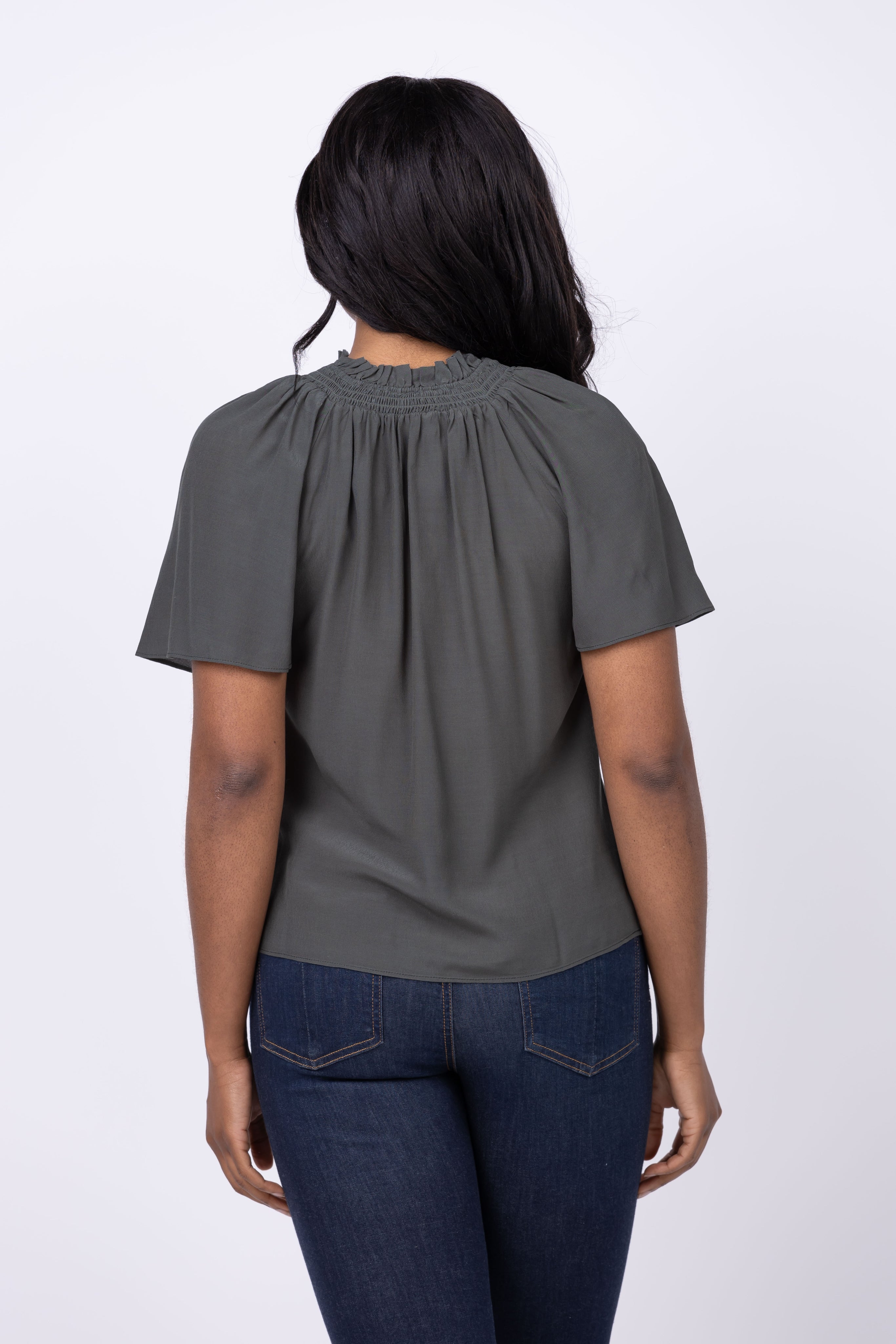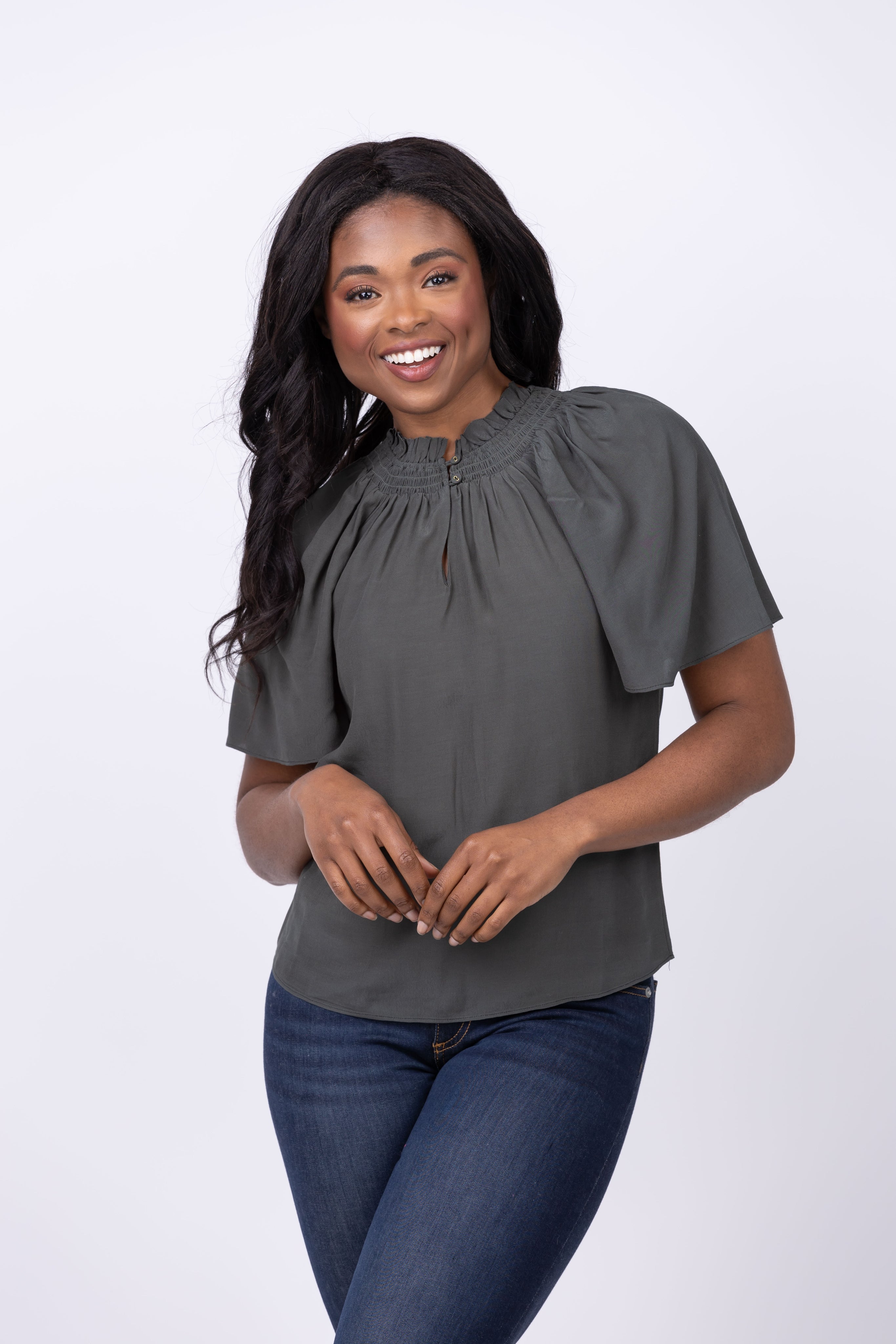 Indulge in effortless elegance with the Gilner Farrar Arabella Blouse in Hunter Green. This fall blouse features delicate smocking detail and a button front closure, adding a touch of sophistication to any outfit. Effortlessly stylish and versatile, this short sleeve blouse is a must-have for your wardrobe.